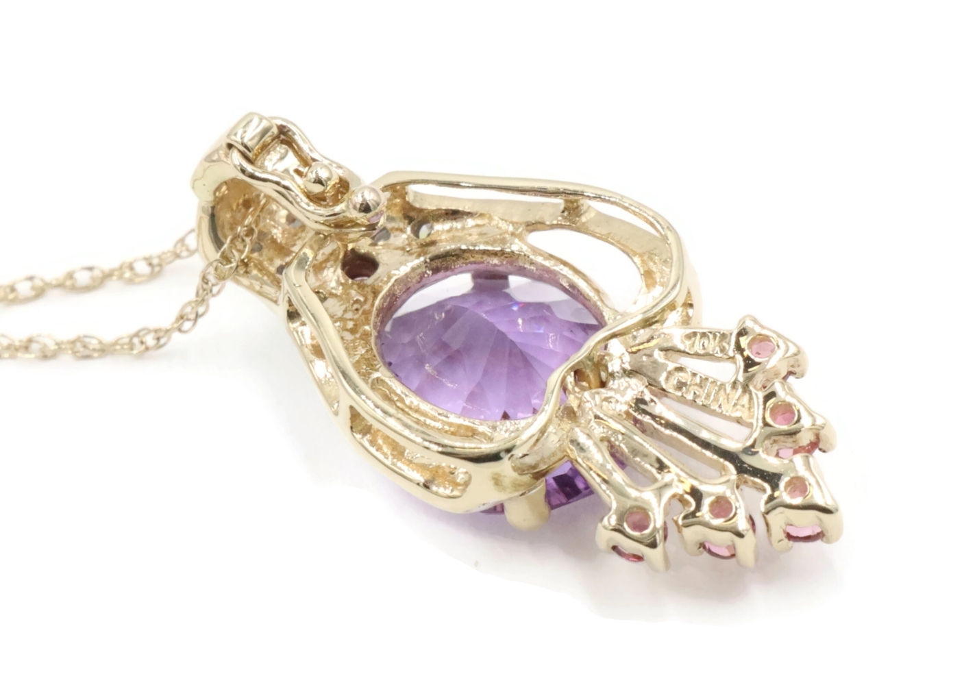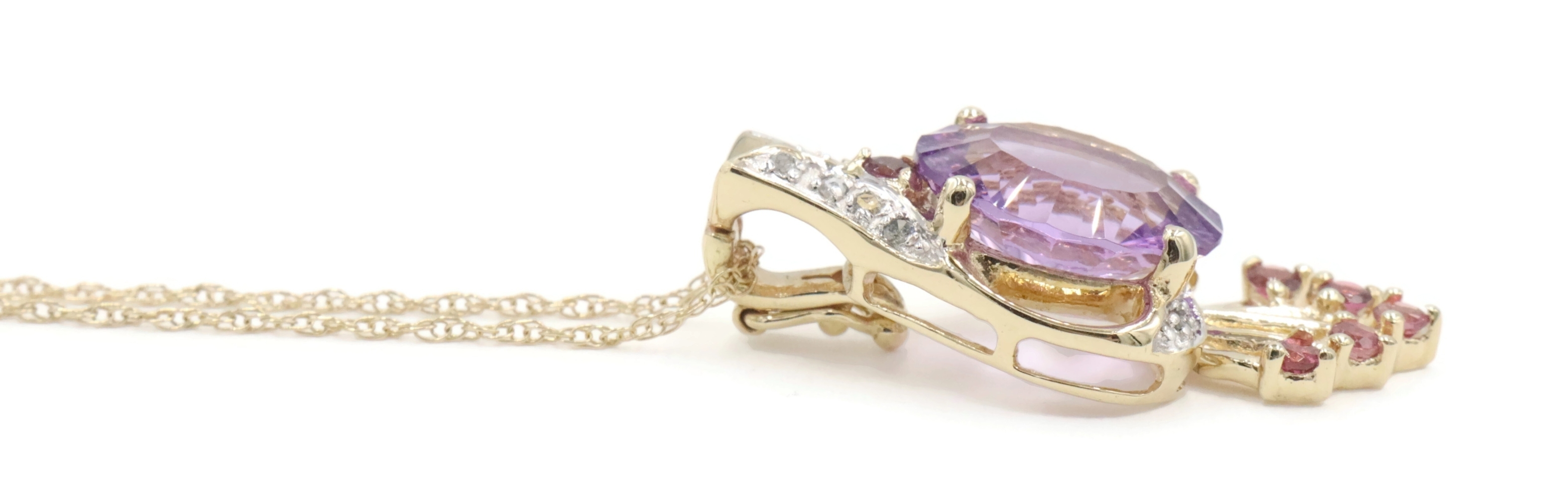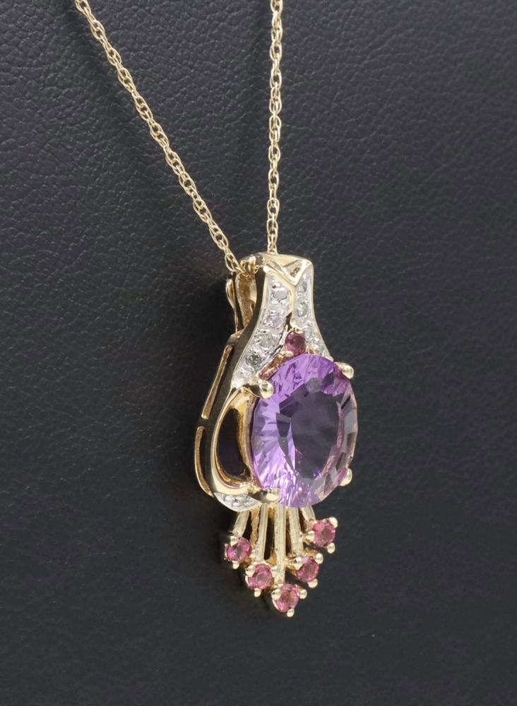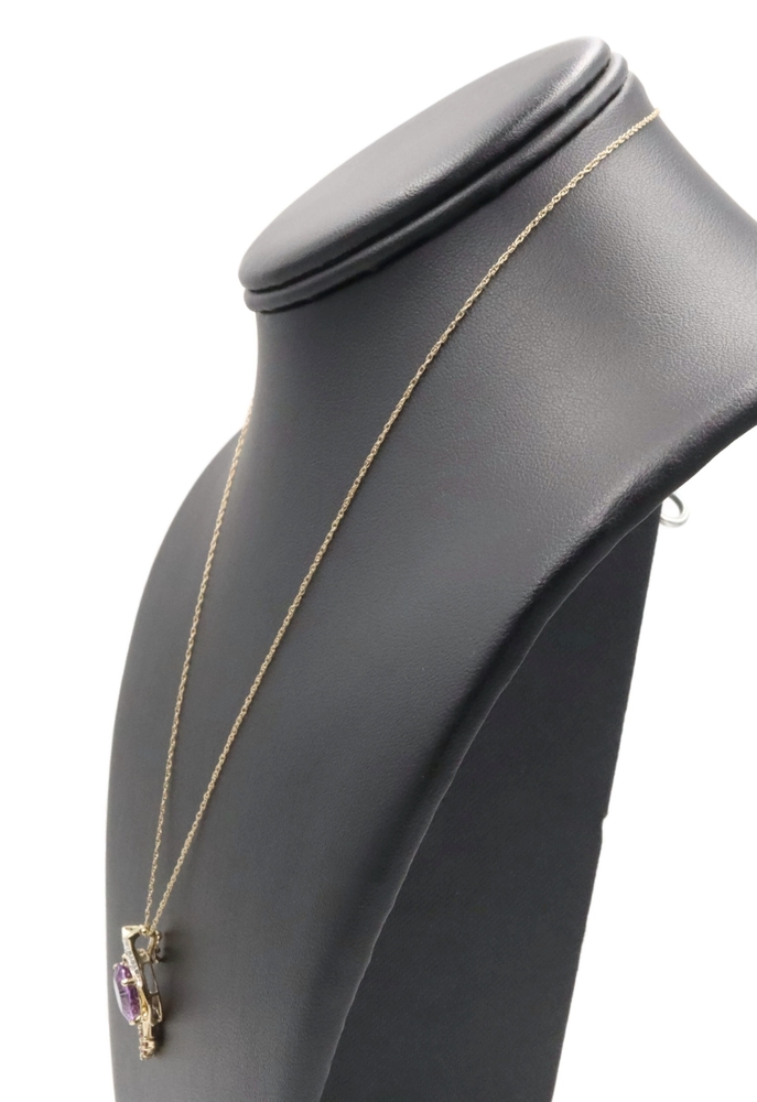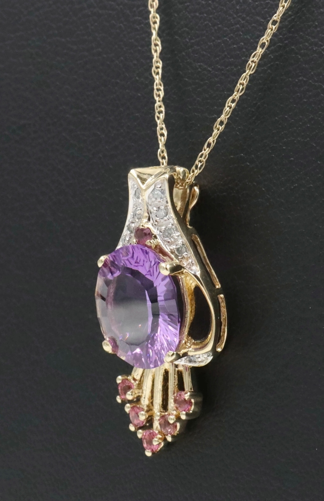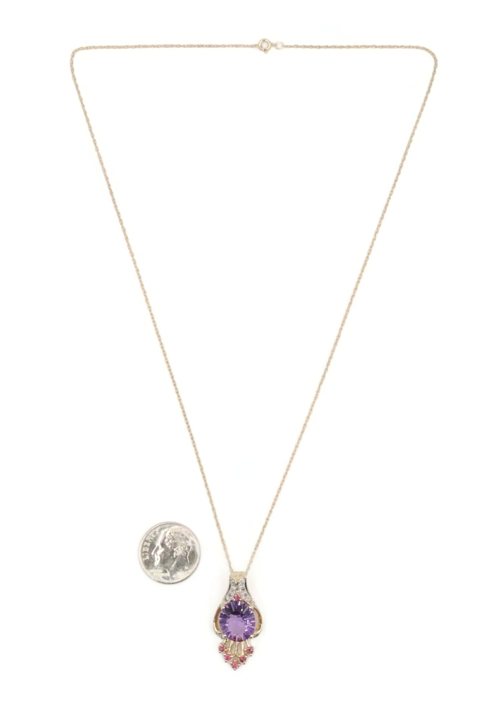 3.15 Ct Fancy Cut Amethyst, Pink CZ & Diamond 10KT Enhancer Pendant on 10K Chain. This pendant is approximately 28mm in length and the rope chain is approximately 18 inches in length.