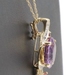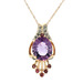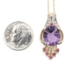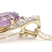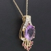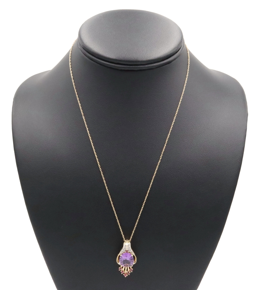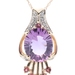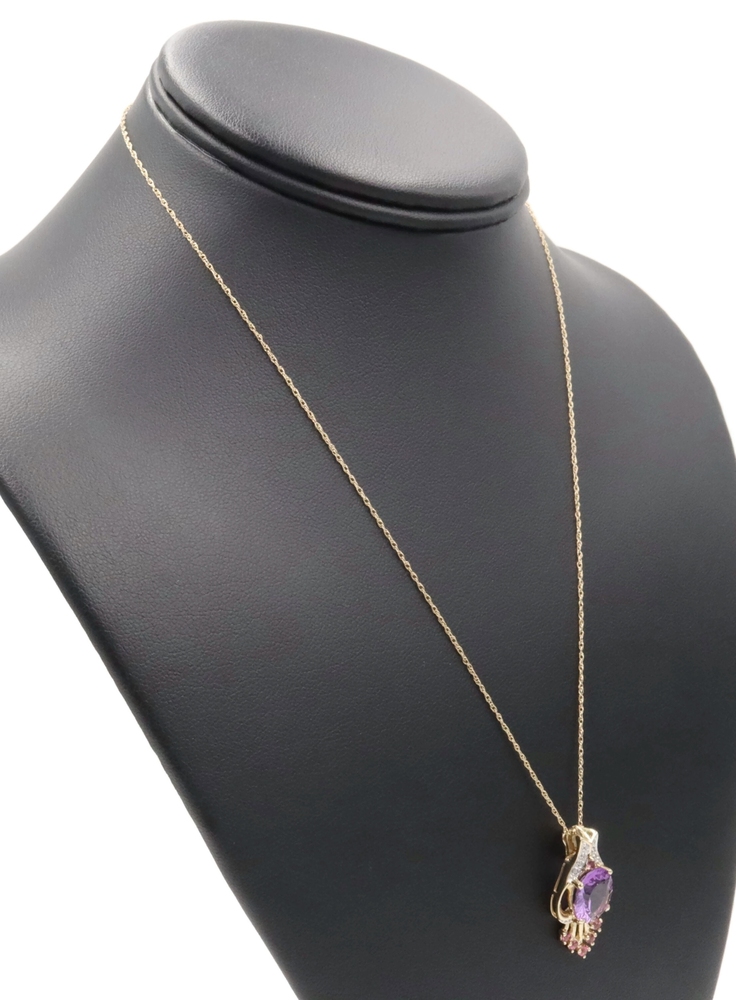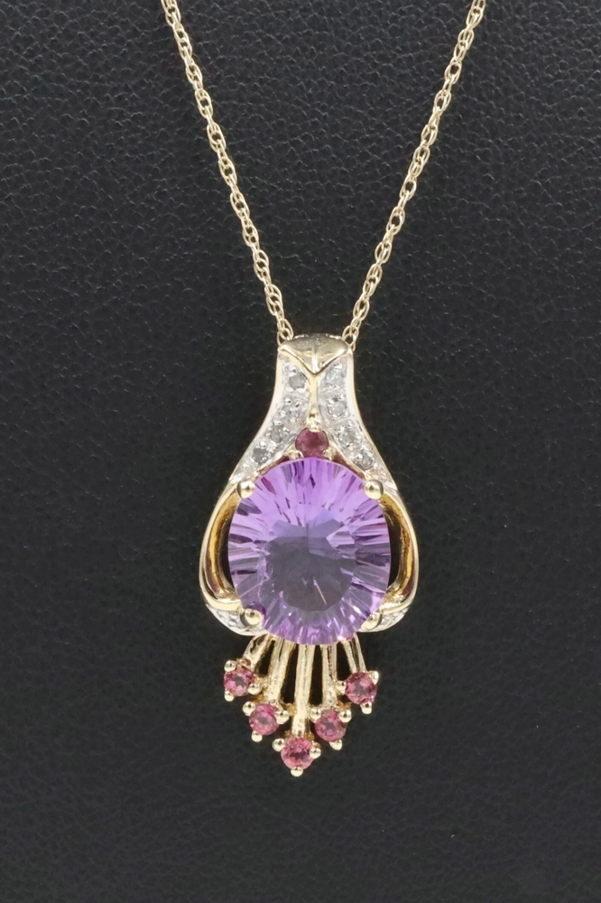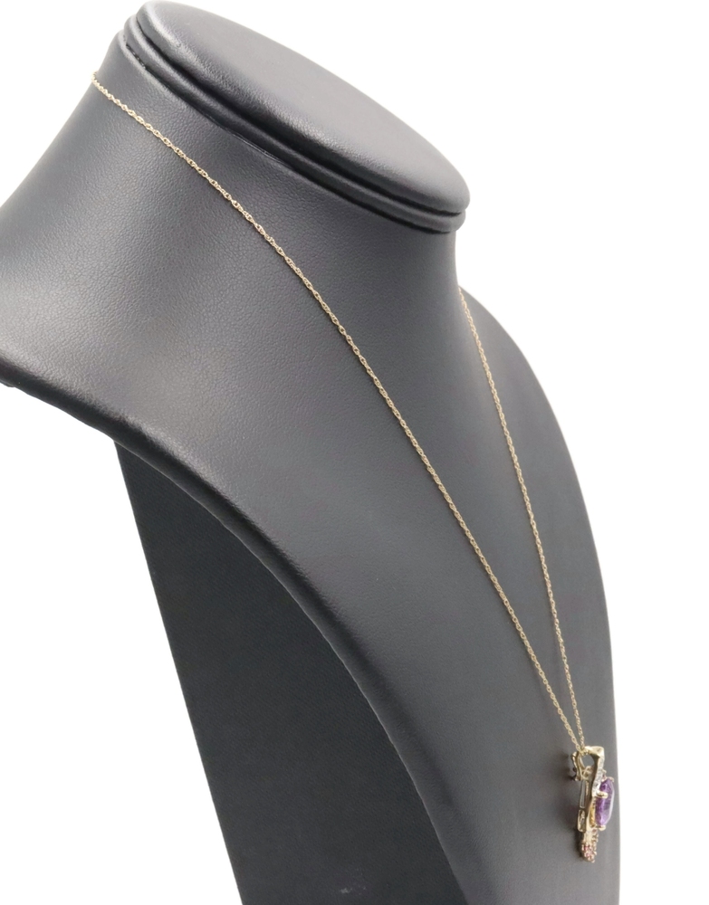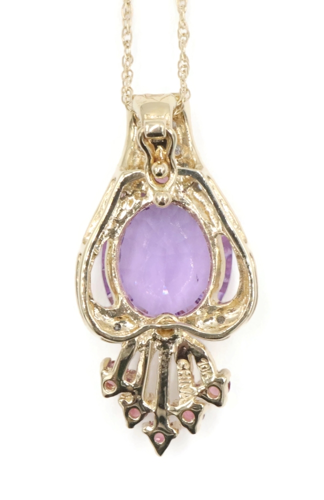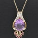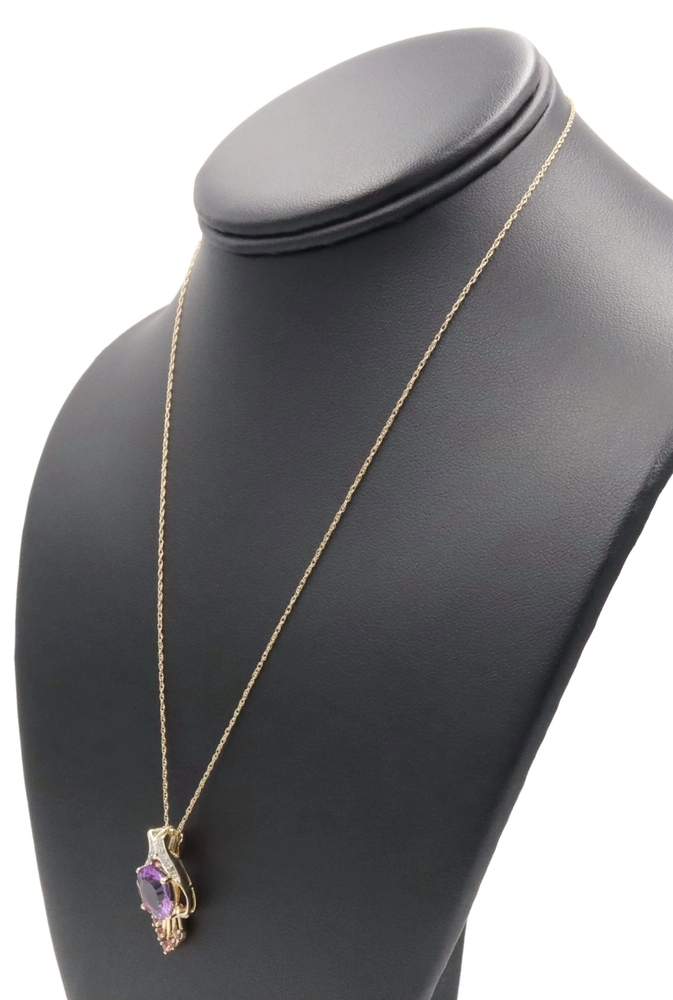 3.15 Ct Fancy Cut Amethyst, Pink CZ & Diamond 10KT Enhancer Pendant on 10K Chain. This pendant is approximately 28mm in length and the rope chain is approximately 18 inches in length.