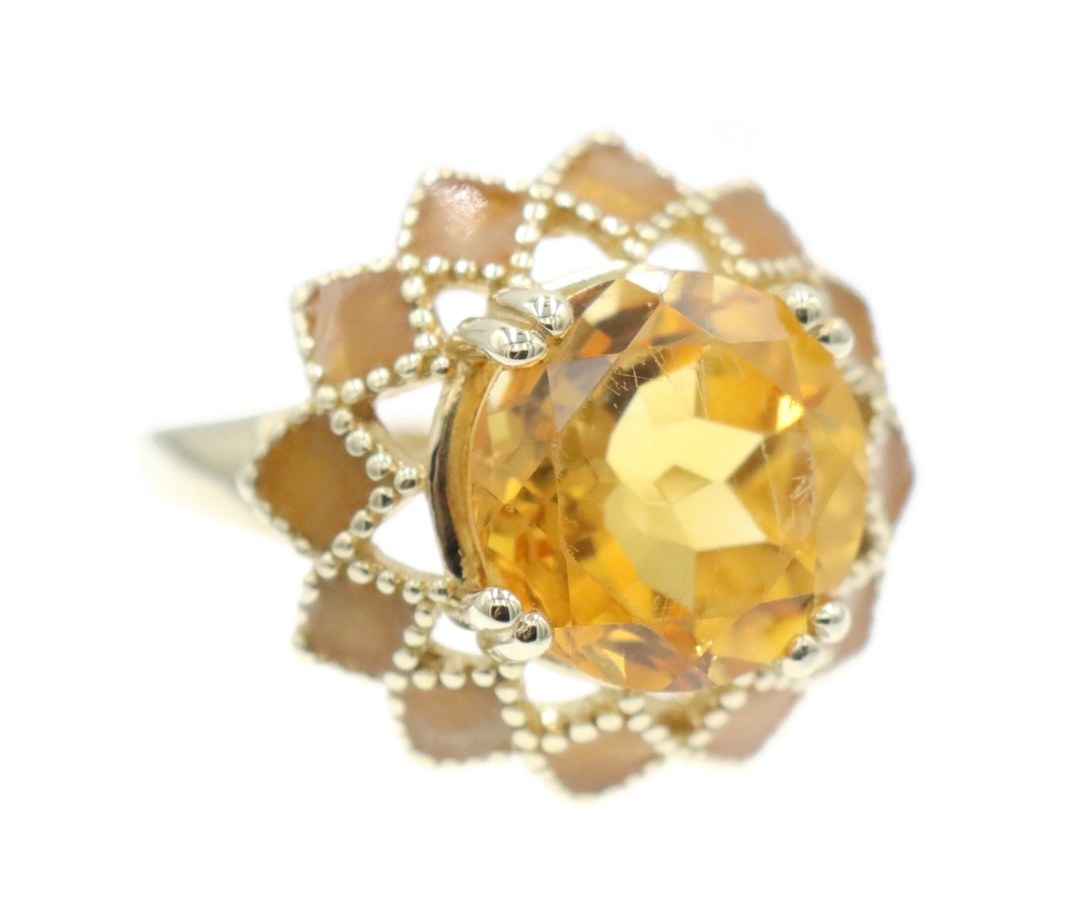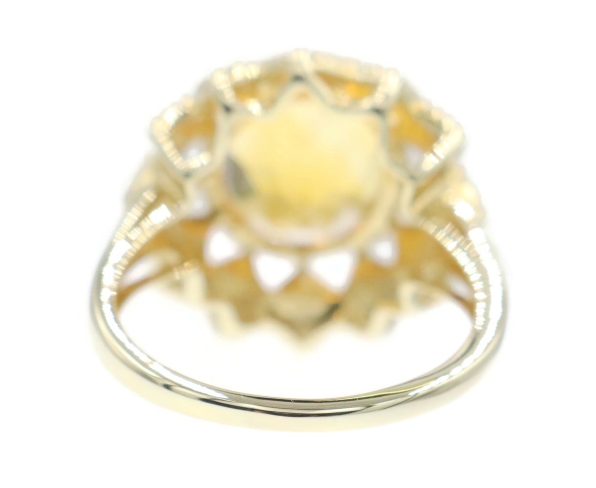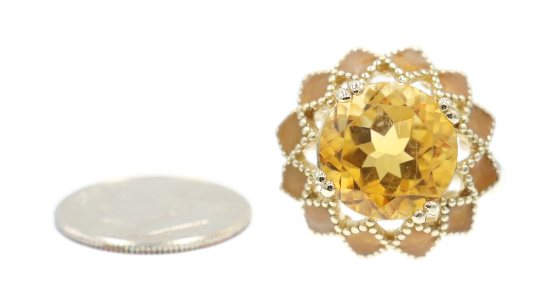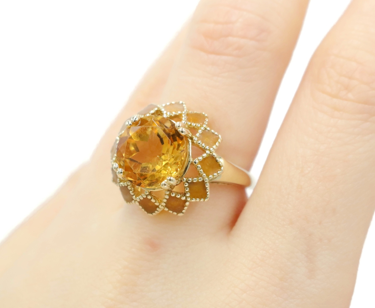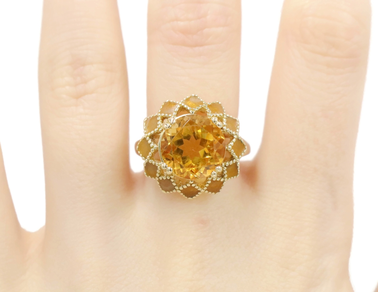 4.42 Ct Round Cut Citrine & Orange Enamel 18.6mm 10KT Yellow Gold Cocktail Ring. This ring is a size 8.