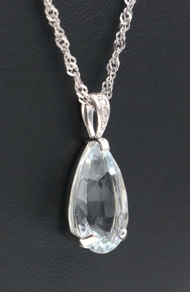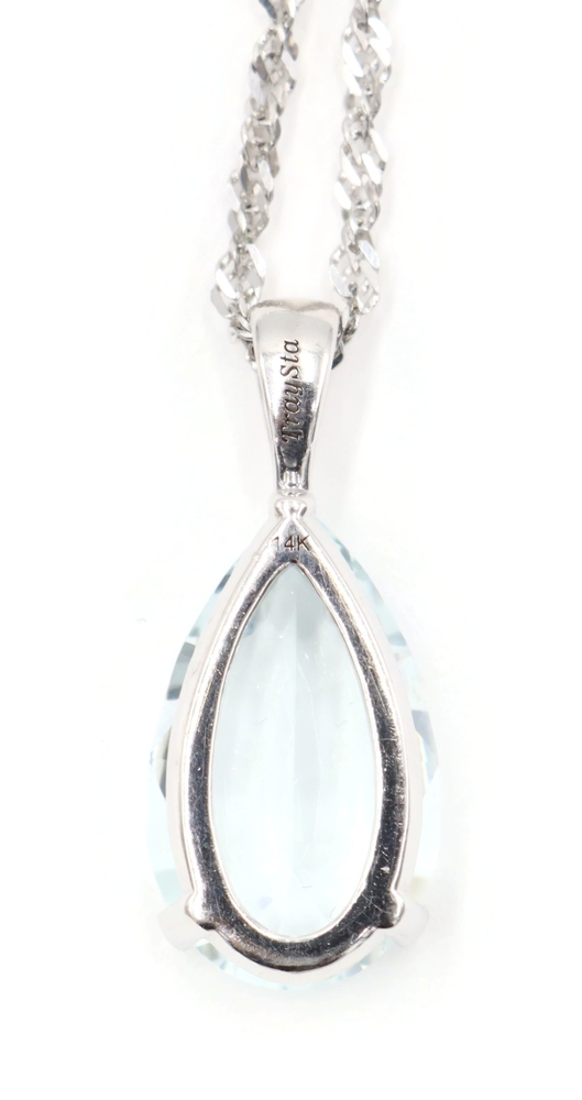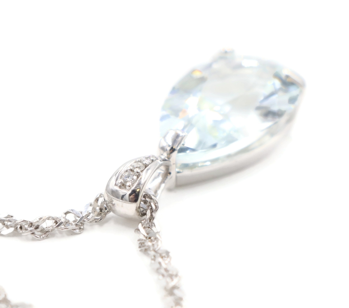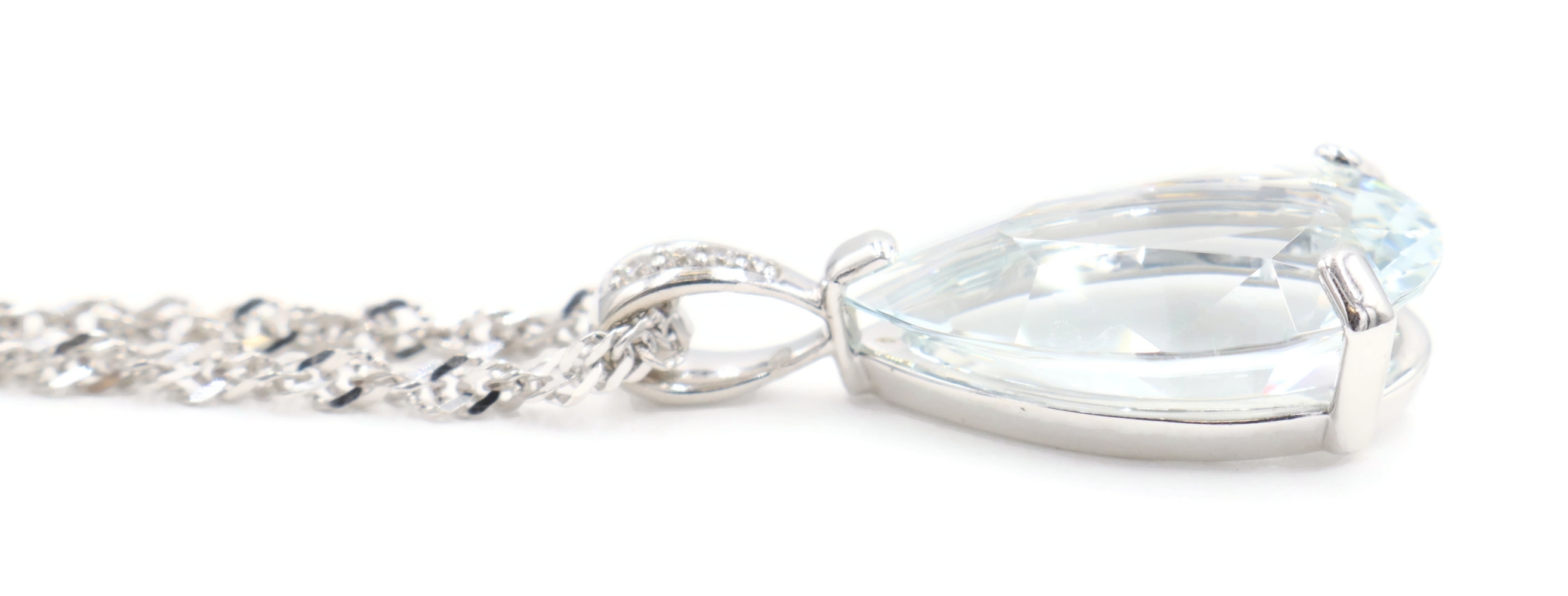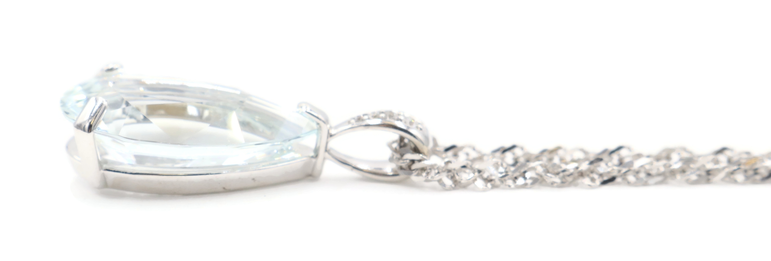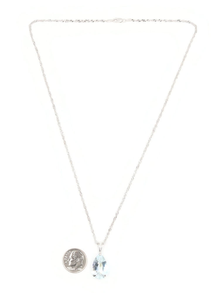 5.90 Ct Pear Cut Aquamarine & Round Diamond 14KT Gold Pendant on 20" 14KT Chain. This pendant is approximately 25.8mm in length (including the bail) and the Singapore chain necklace is approximately 20 inches in length.