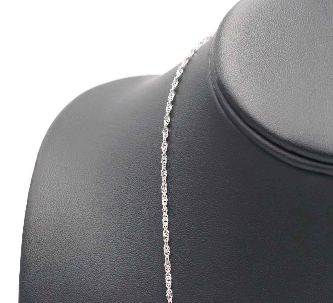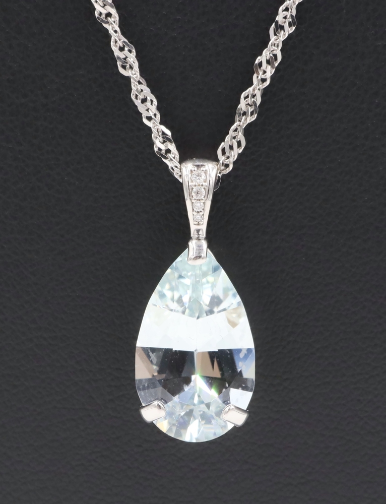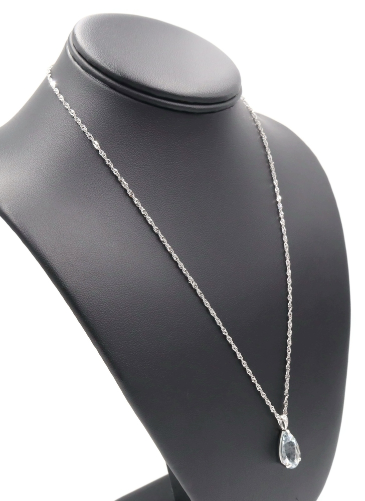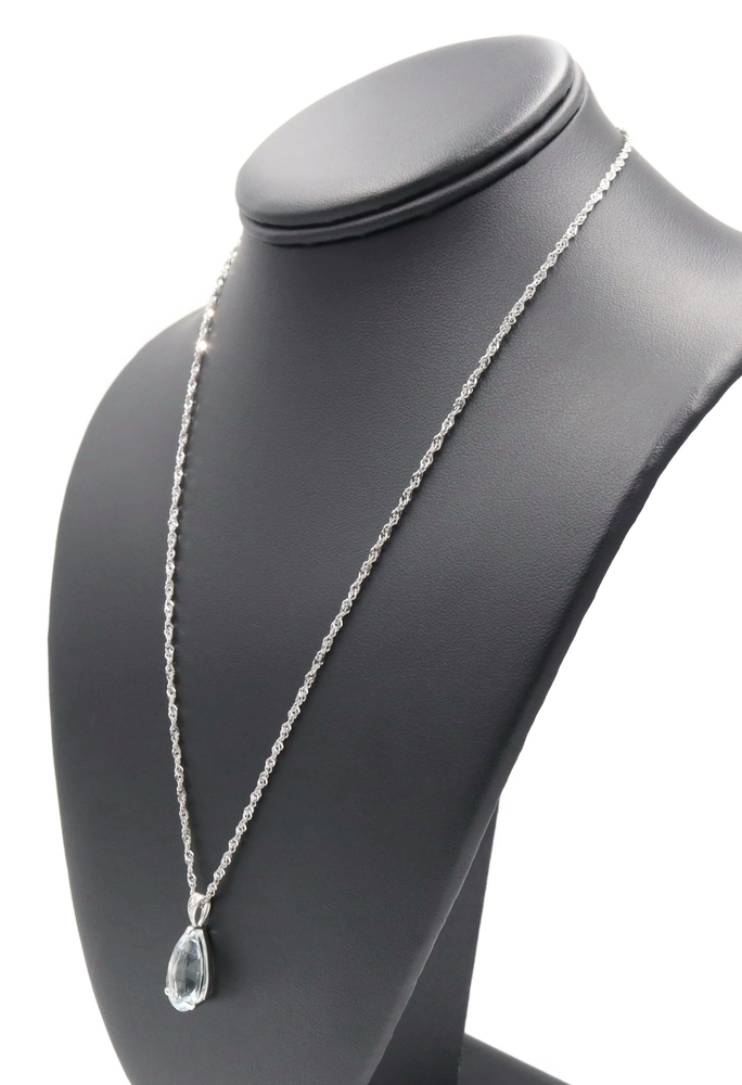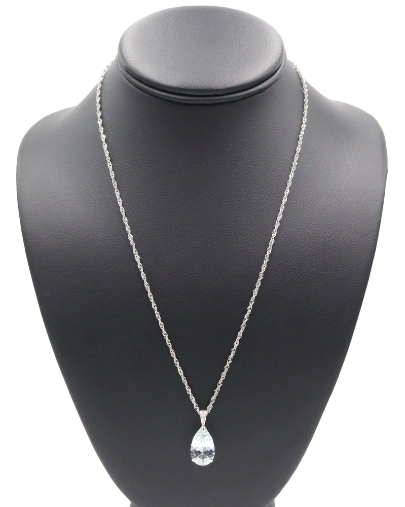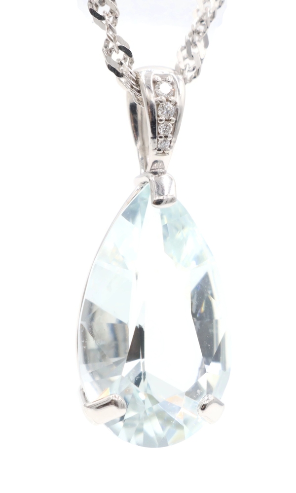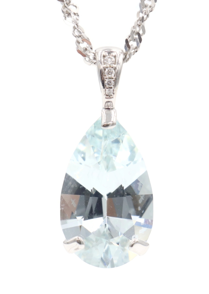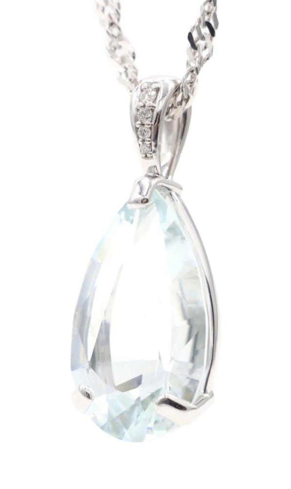 5.90 Ct Pear Cut Aquamarine & Round Diamond 14KT Gold Pendant on 20" 14KT Chain. This pendant is approximately 25.8mm in length (including the bail) and the Singapore chain necklace is approximately 20 inches in length.