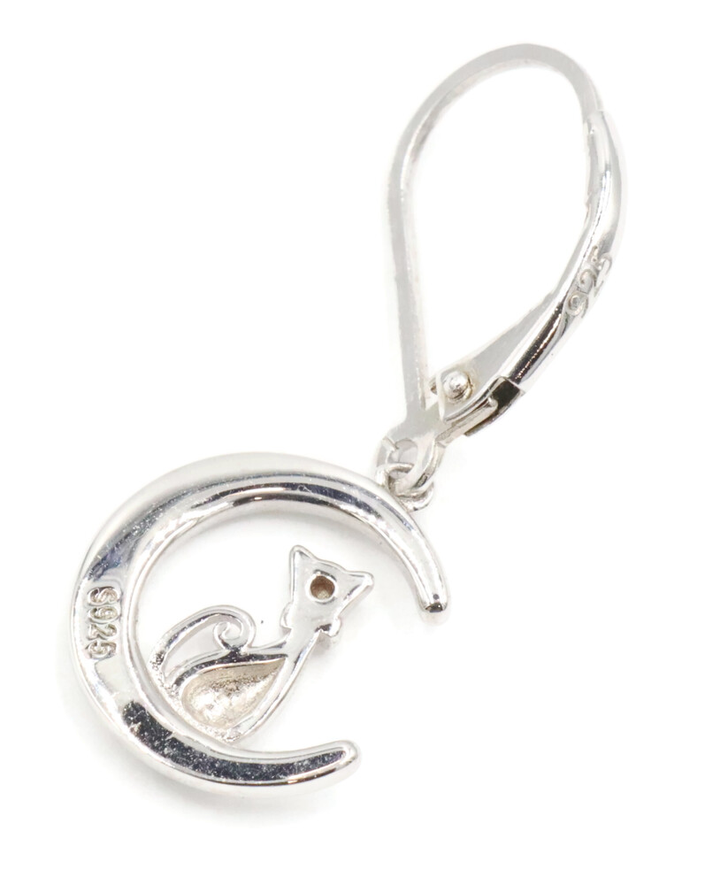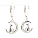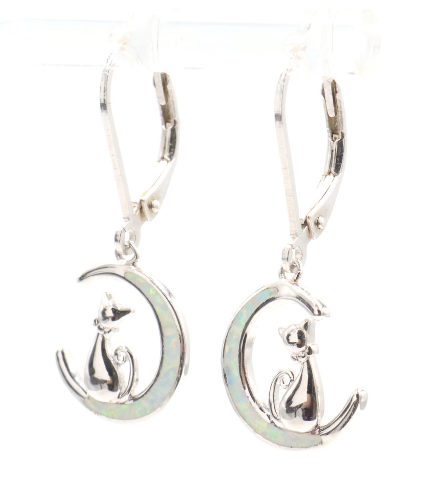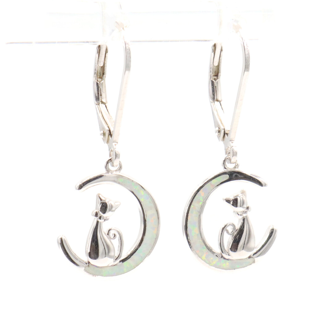 925 Cat Sitting on a Crescent Moon with Lab Created Opal Inlay Dangle Earrings | USA Pawn