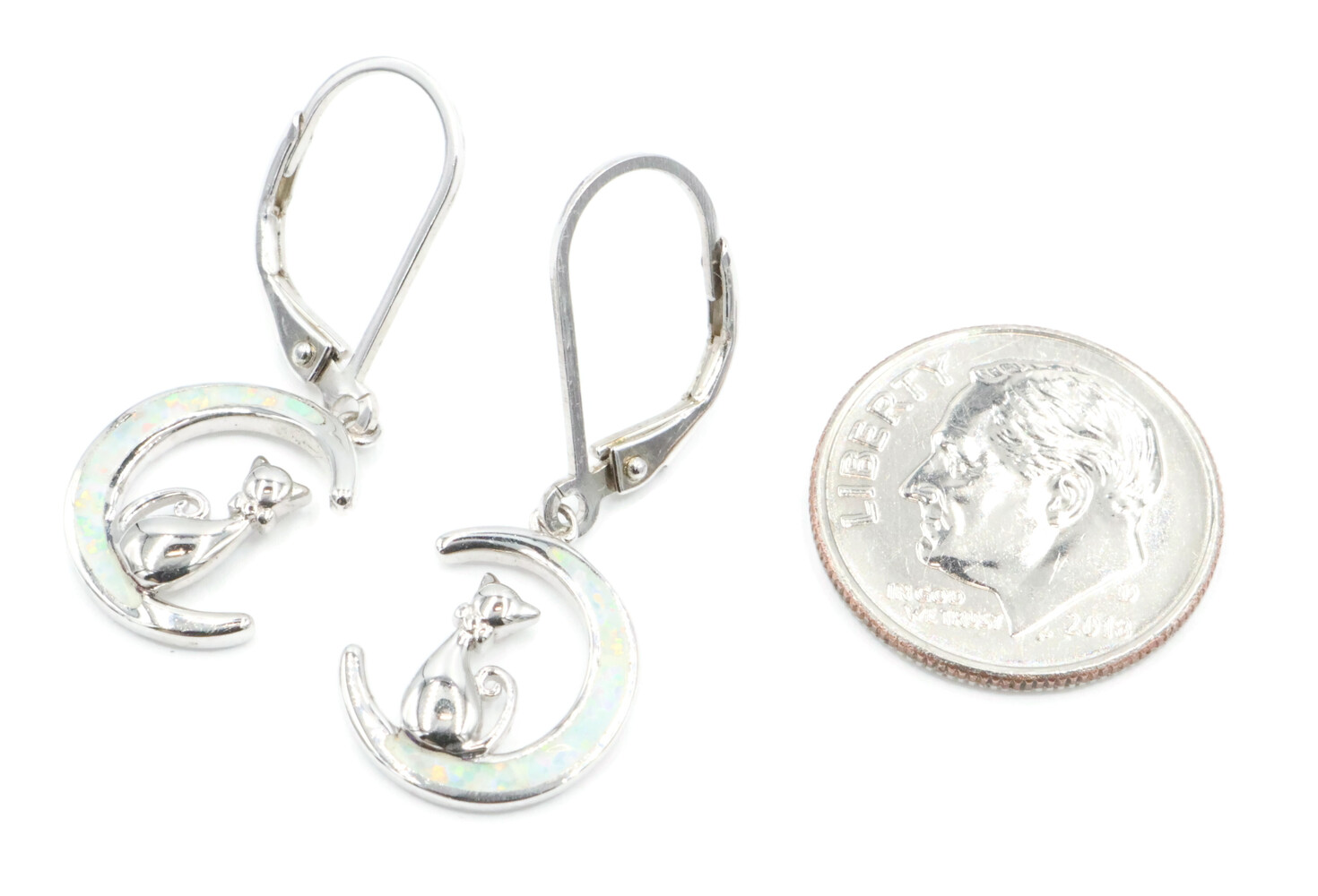 925 Cat Sitting on a Crescent Moon with Lab Created Opal Inlay Dangle Earrings. The total length of these earrings is 29.8mm.