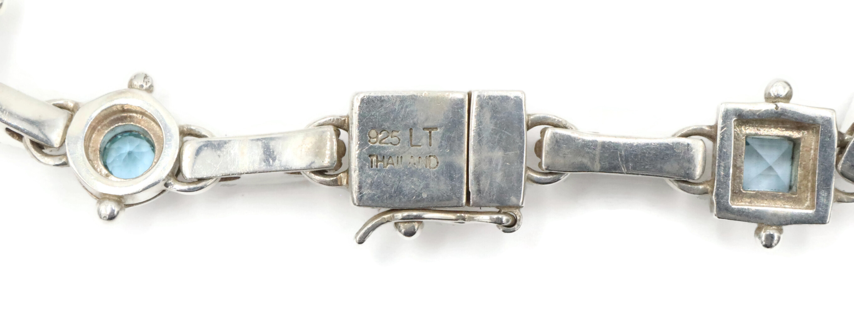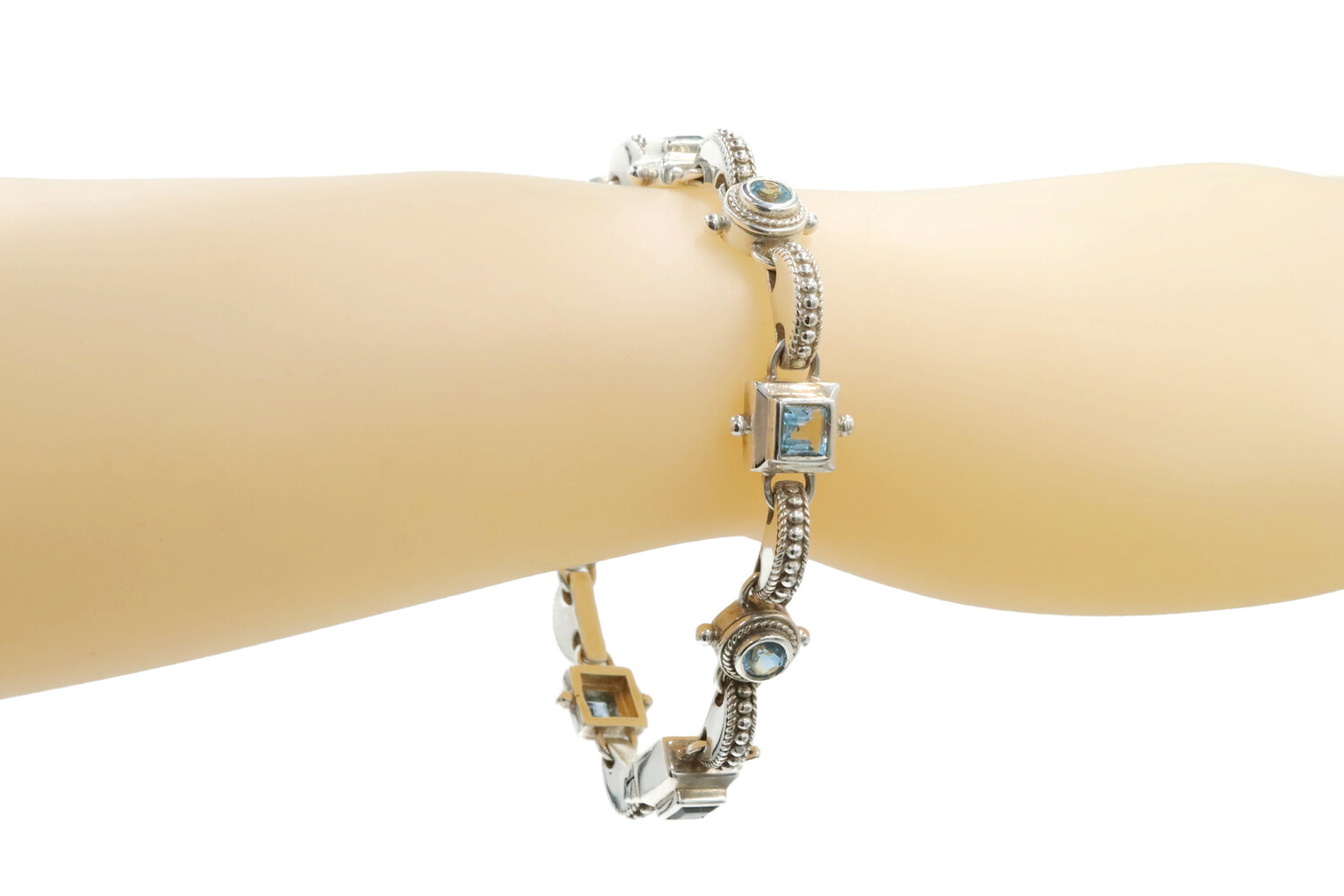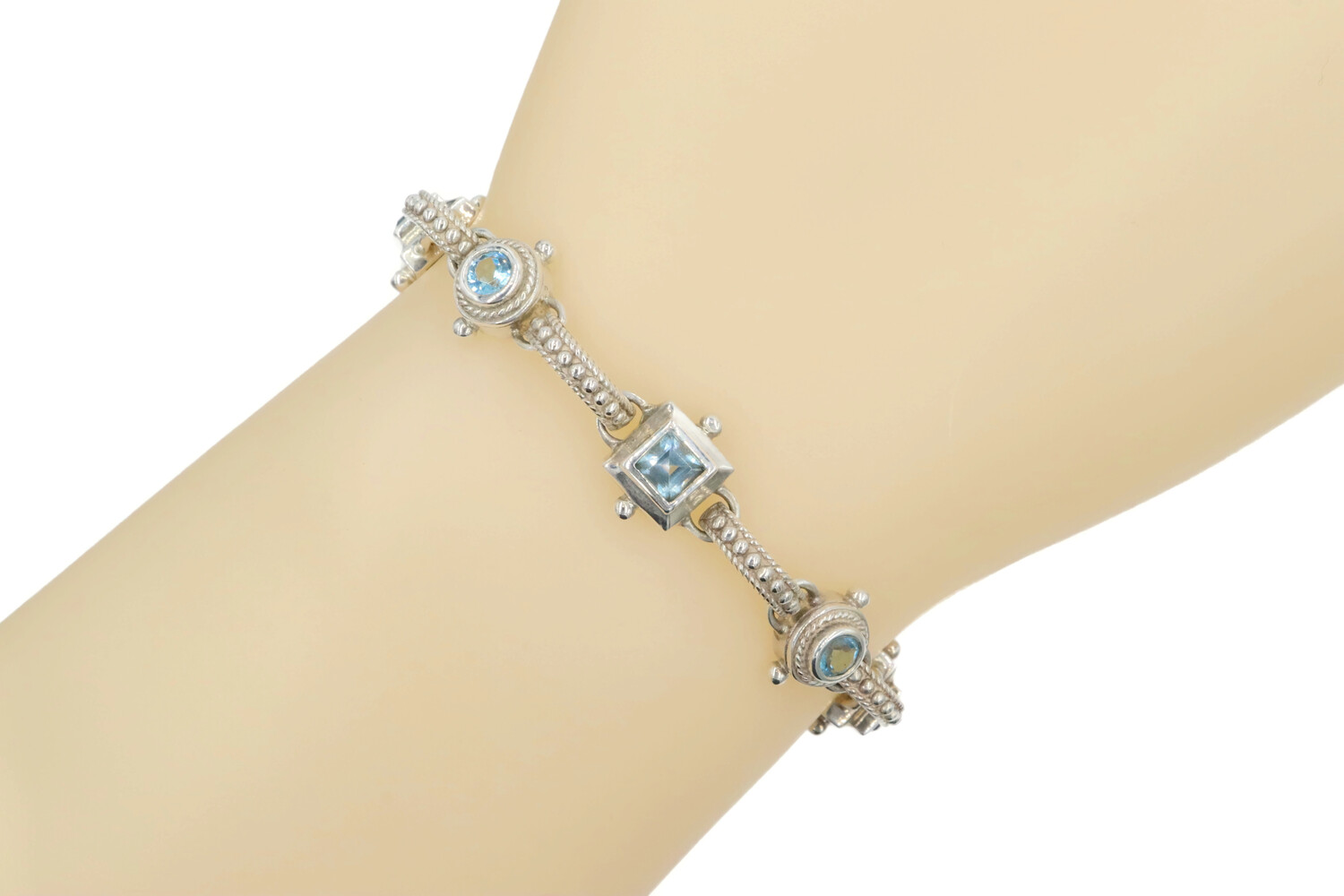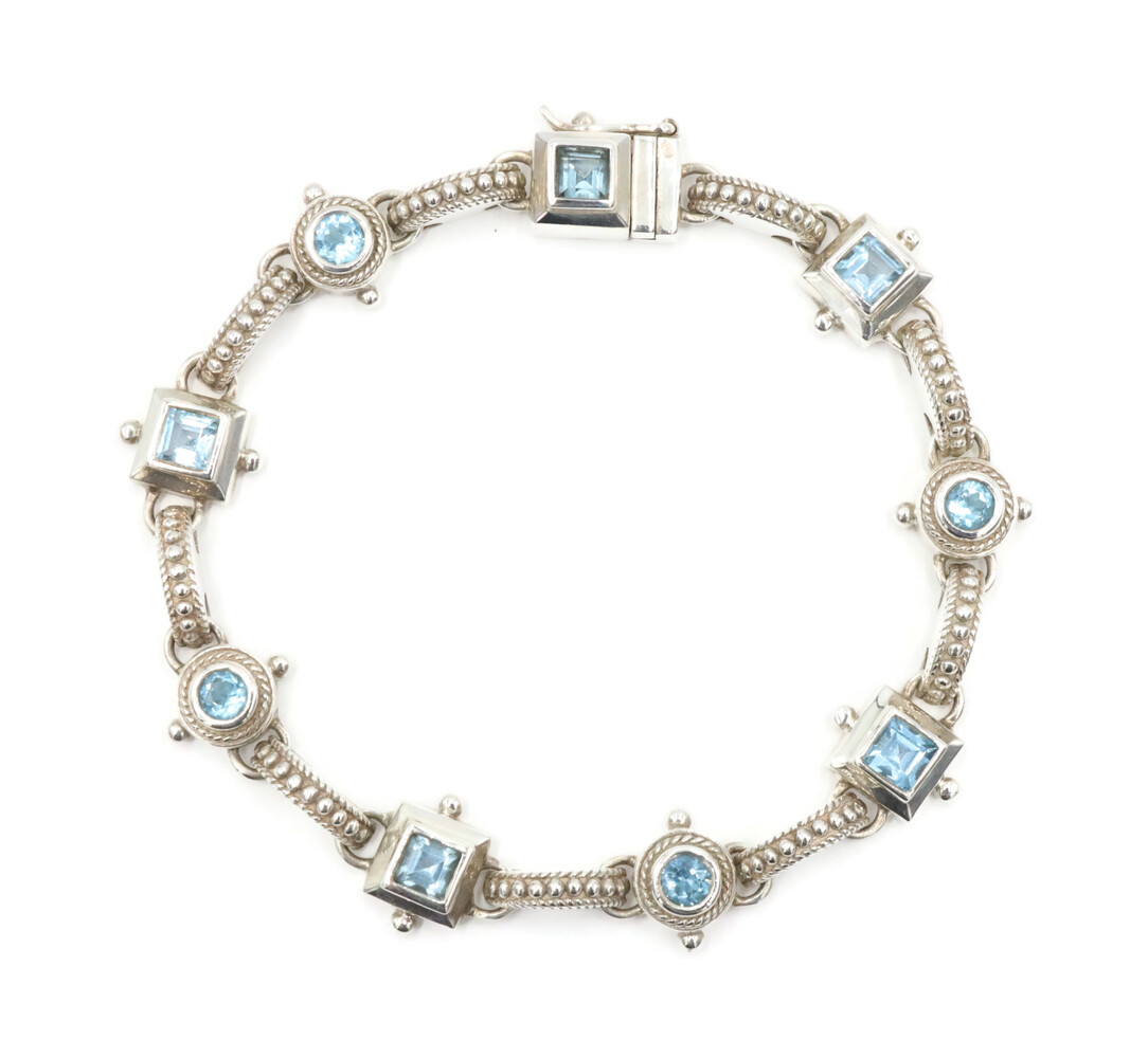Alternating Princess & Round Blue Topaz Sterling Silver 925 Bracelet 7.5" - 24g. This bracelet is approximately 7 1/2 inches in length and 11.5mm in width.