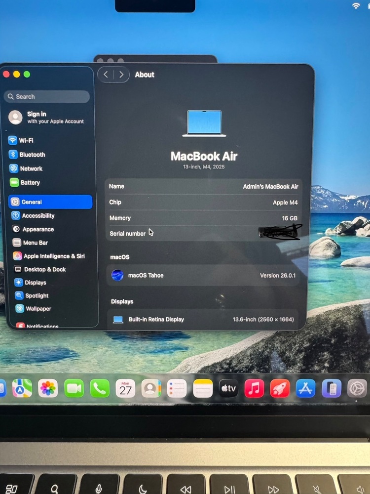 APPLE A3240 / 2025 MACBOOK AIR / M4 PROCESSOR / 16GB RAM / 256GB HD / MAC OS TAHOE / CHARGER