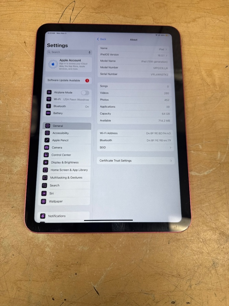 APPLE MPQ33LL/A / 10TH GEN IPAD / 64GB HD / PINK / SLIGHTLY BENT / NO CHARGER