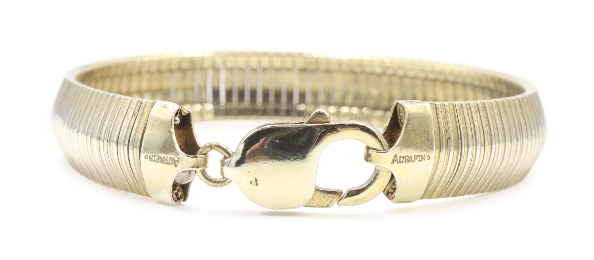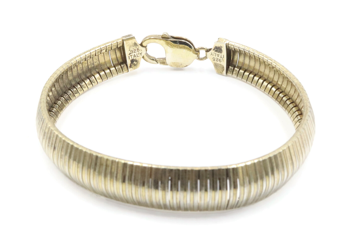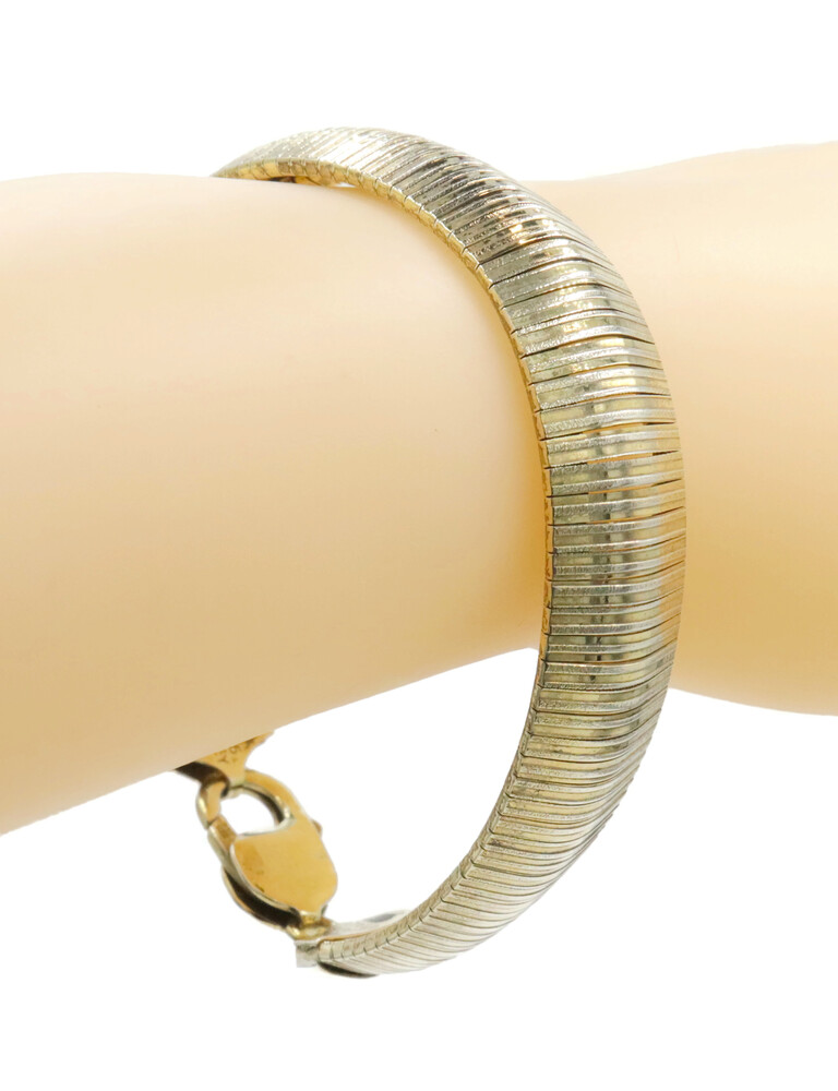 Aurafin Gold-Plated Sterling Silver 925 11mm Italy Omega Bracelet 7 3/4" - 20.0g. This bracelet is approximately 7 3/4 inches in length, 11mm in width, made of sterling silver and plated with yellow gold.