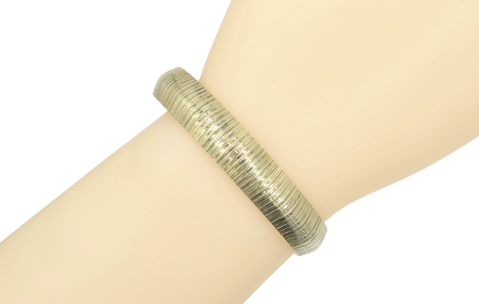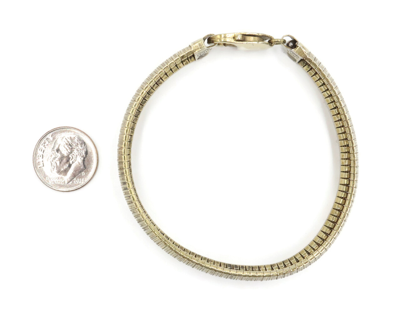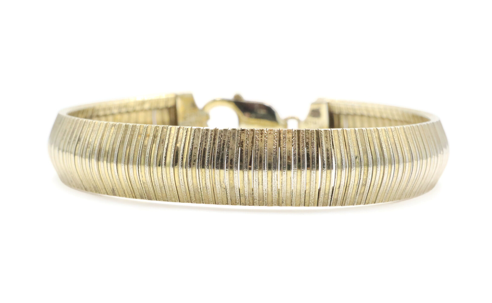 Aurafin Gold-Plated Sterling Silver 925 11mm Italy Omega Bracelet 7 3/4" - 20.0g. This bracelet is approximately 7 3/4 inches in length, 11mm in width, made of sterling silver and plated with yellow gold.