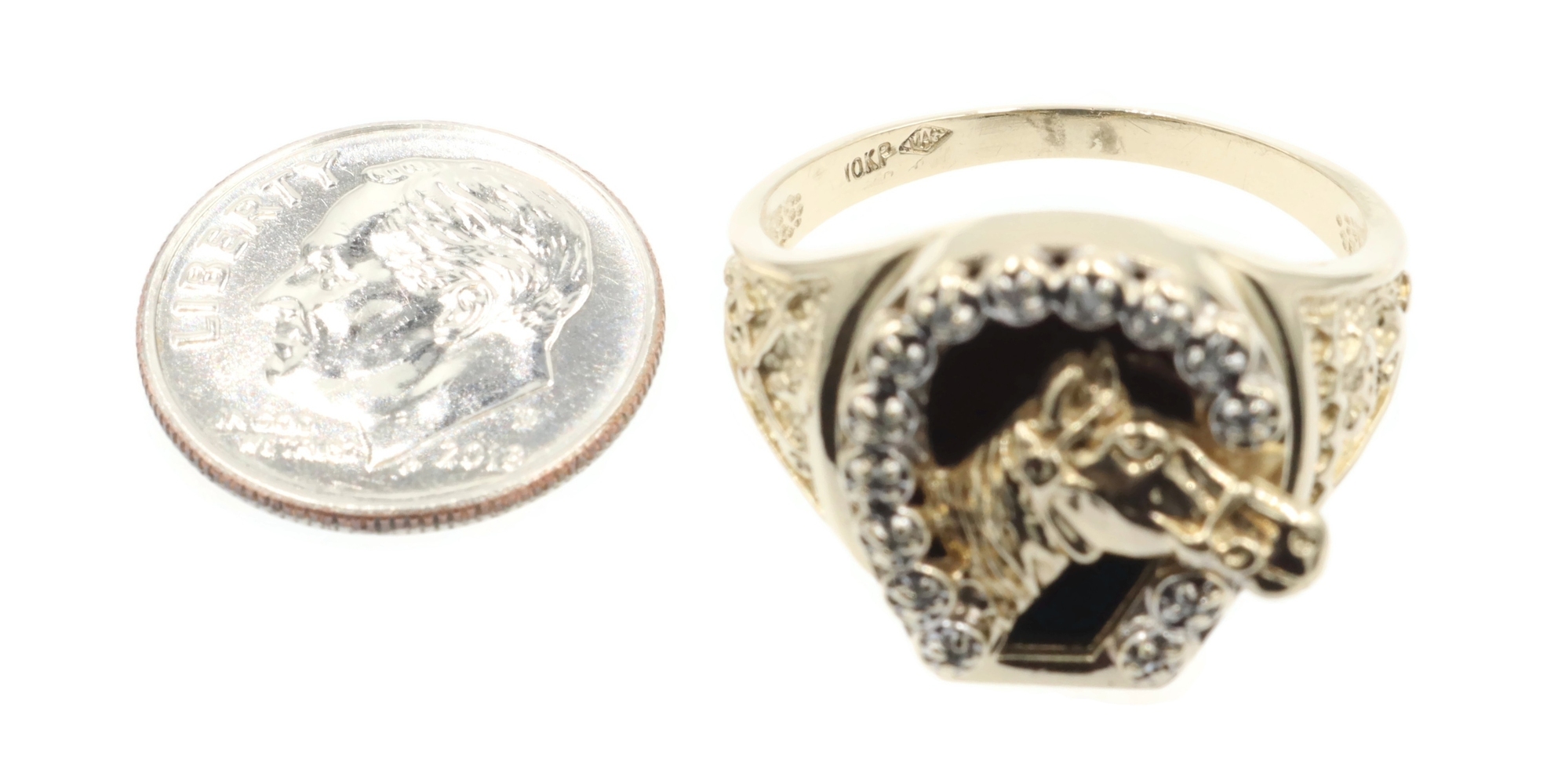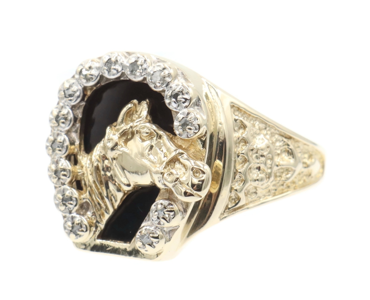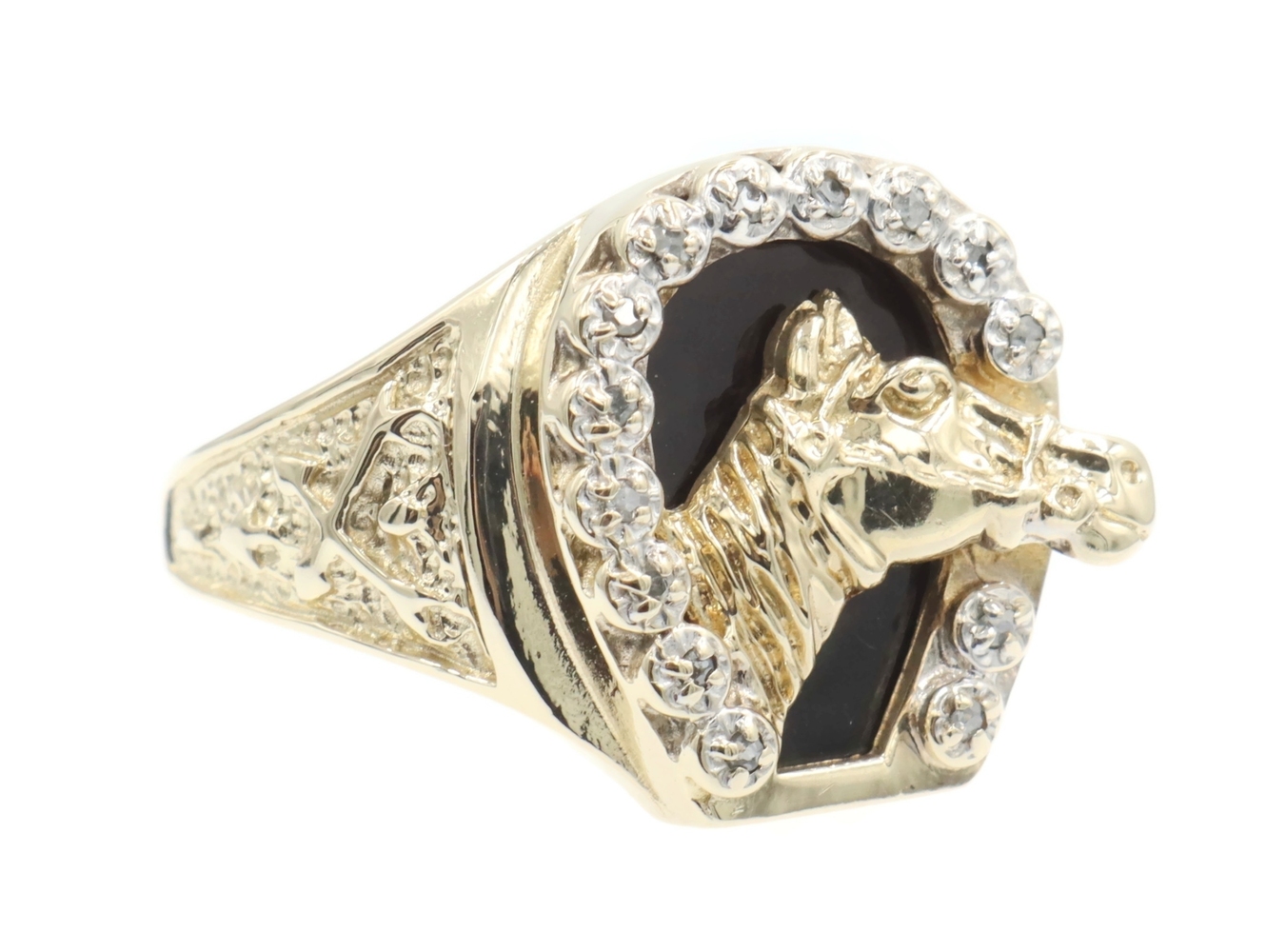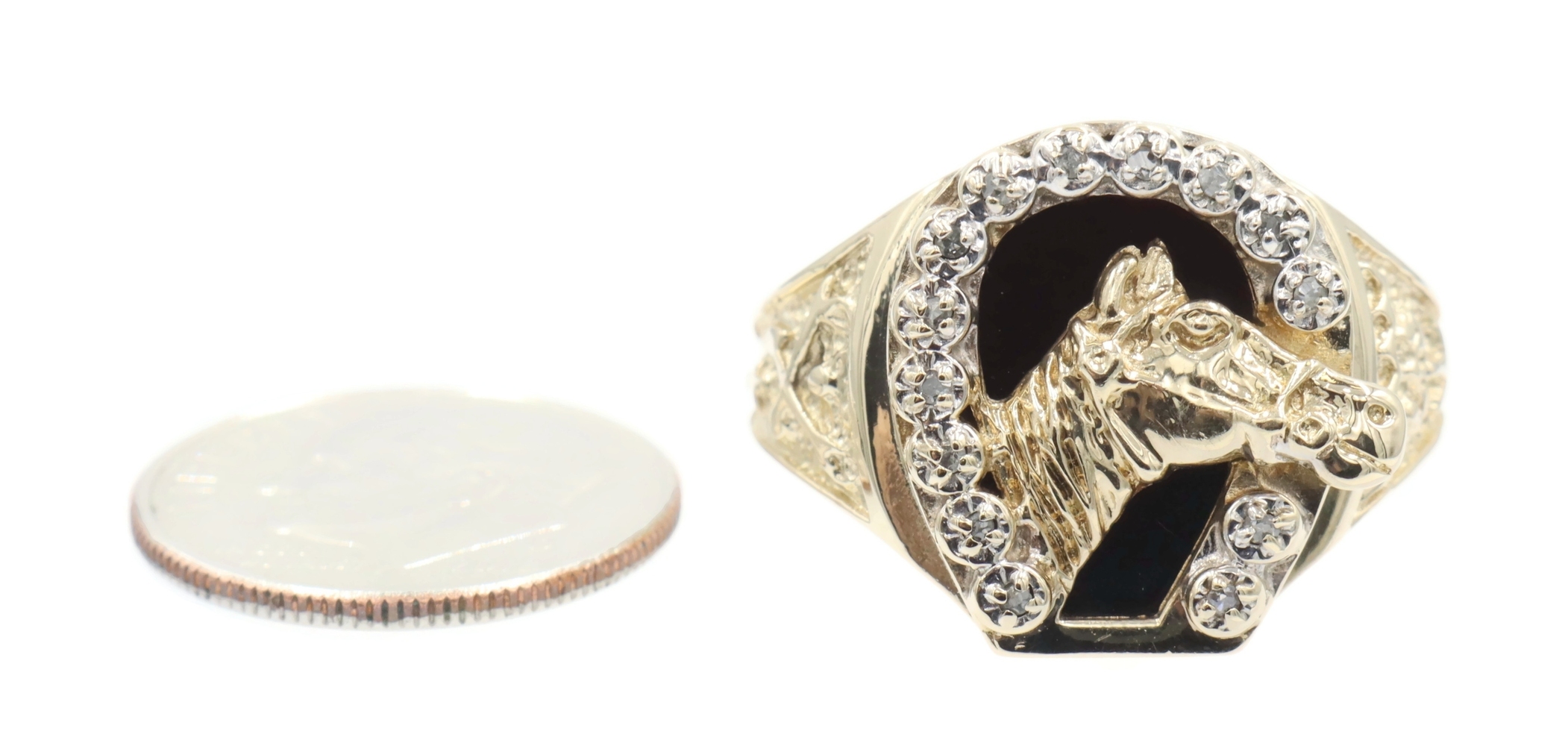 Black Onyx Inlay & 0.08 Ctw Round Diamond 10KT Yellow Gold Horseshoe Ring 6.18g. This ring is a size 9 1/2.