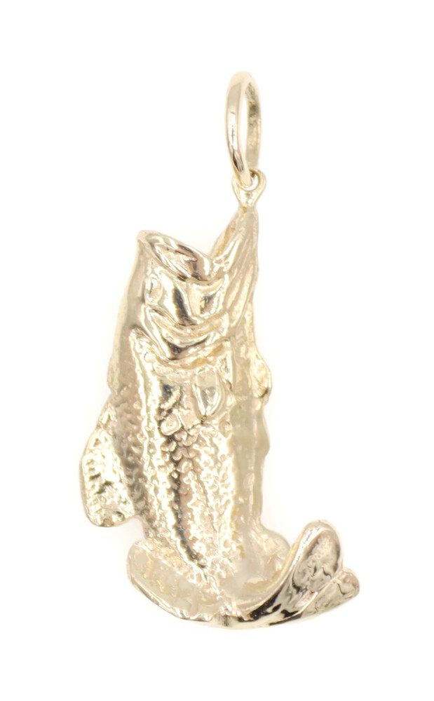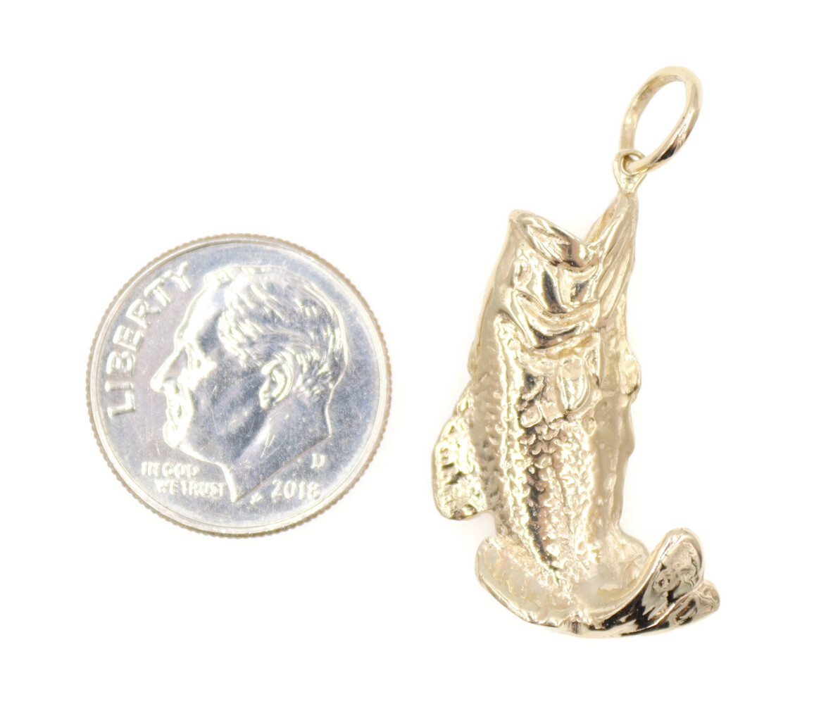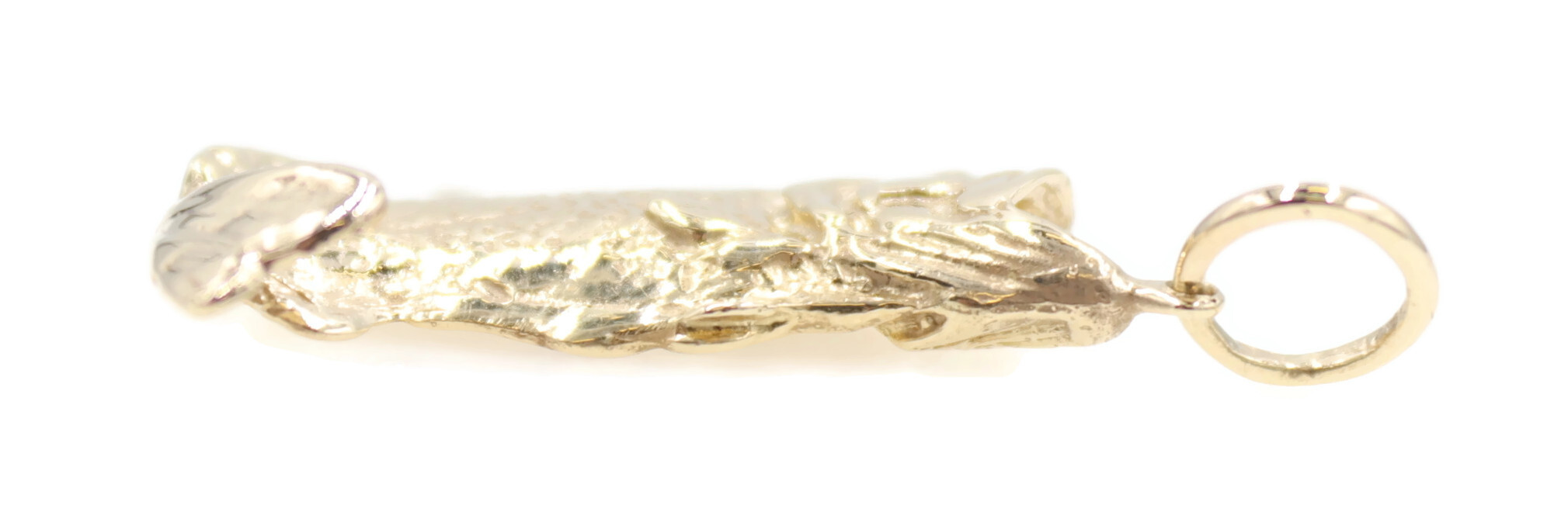 Classic High Shine 10KT Yellow Gold Detailed Bass Fish Necklace Pendant 34.1mm. This pendant is approximately 34.1mm in length (including the bail) and 15.3mm in width.