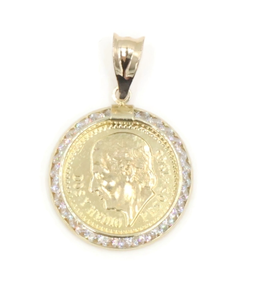 Copy 1945 Dos Y Medio Pesos Round Cubic Zirconia 14KT Yellow Gold Coin Pendant. This is a 14KT yellow gold copy of a gold pesos coin.