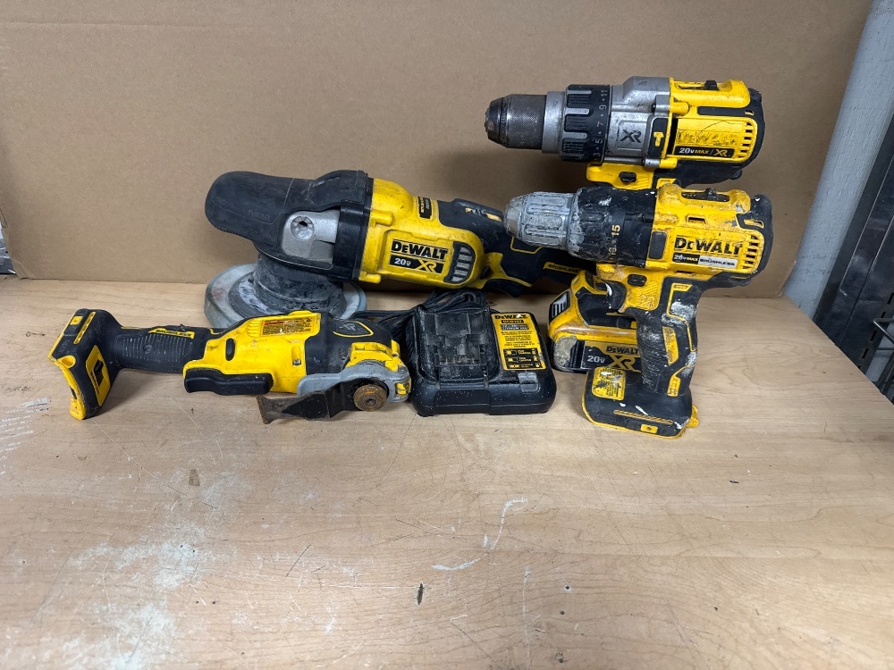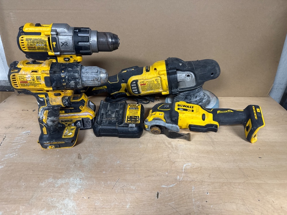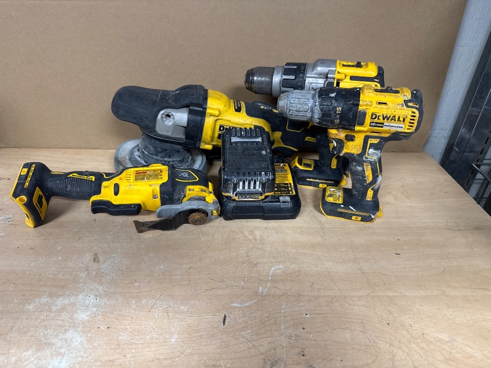 DEWALT 4PC COMBO KIT: DCD996 1/2" HAMMER DRILL / DCS356 MULTI-TOOL / DCD777 1/2" DRILL DRIVER / DCM848 5" RO VS POLISHER / BATTERY / CHARGER