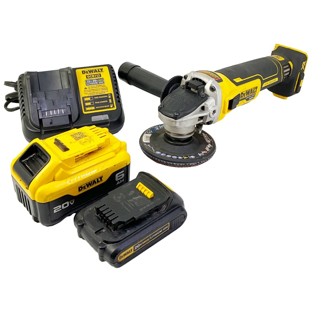Dewalt DCG405 20V MAX XR Cordless Brushless 4.5 in. Slide Switch Small Angle Grinder with Kickback Brake. Comes With Two Batteries and Charging Dock