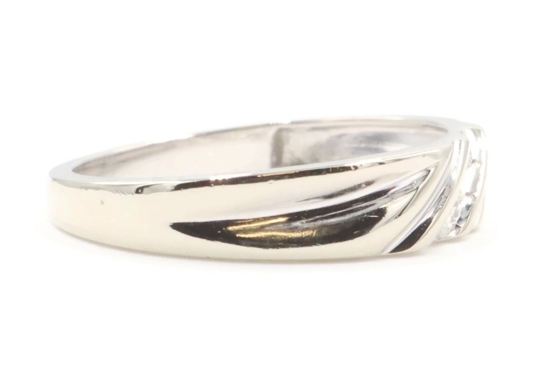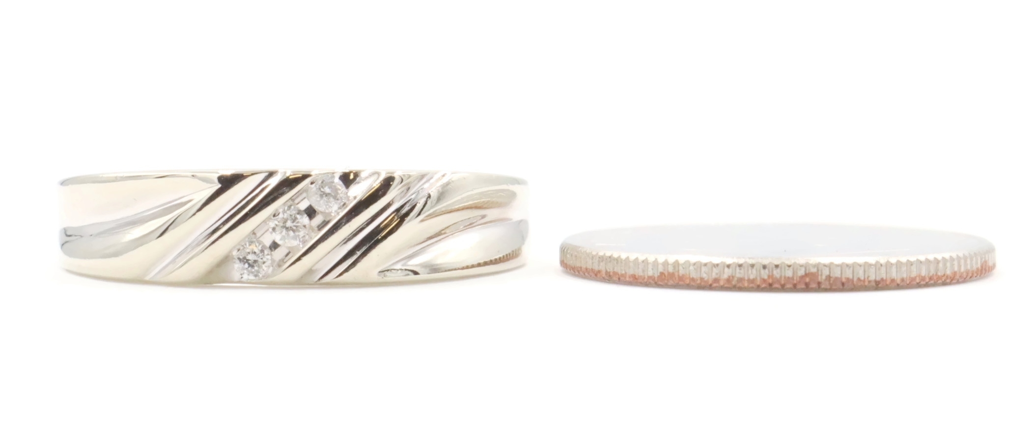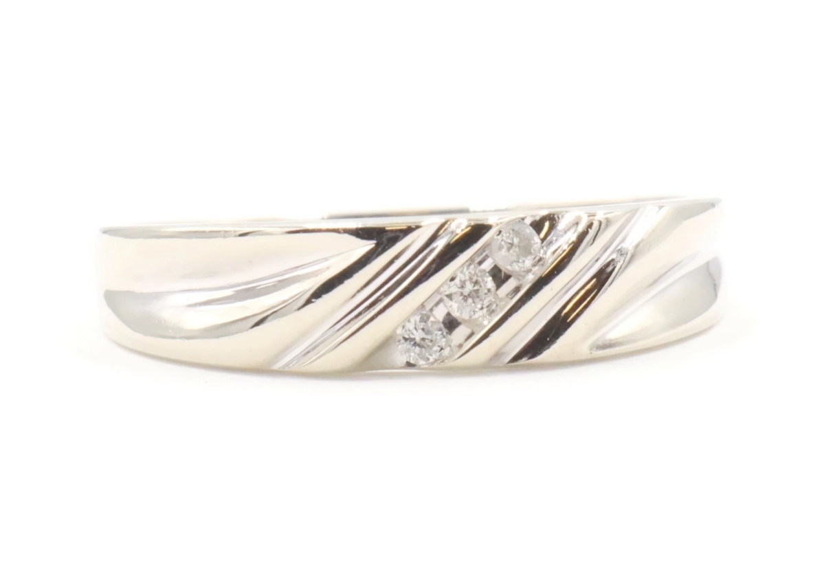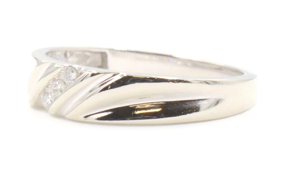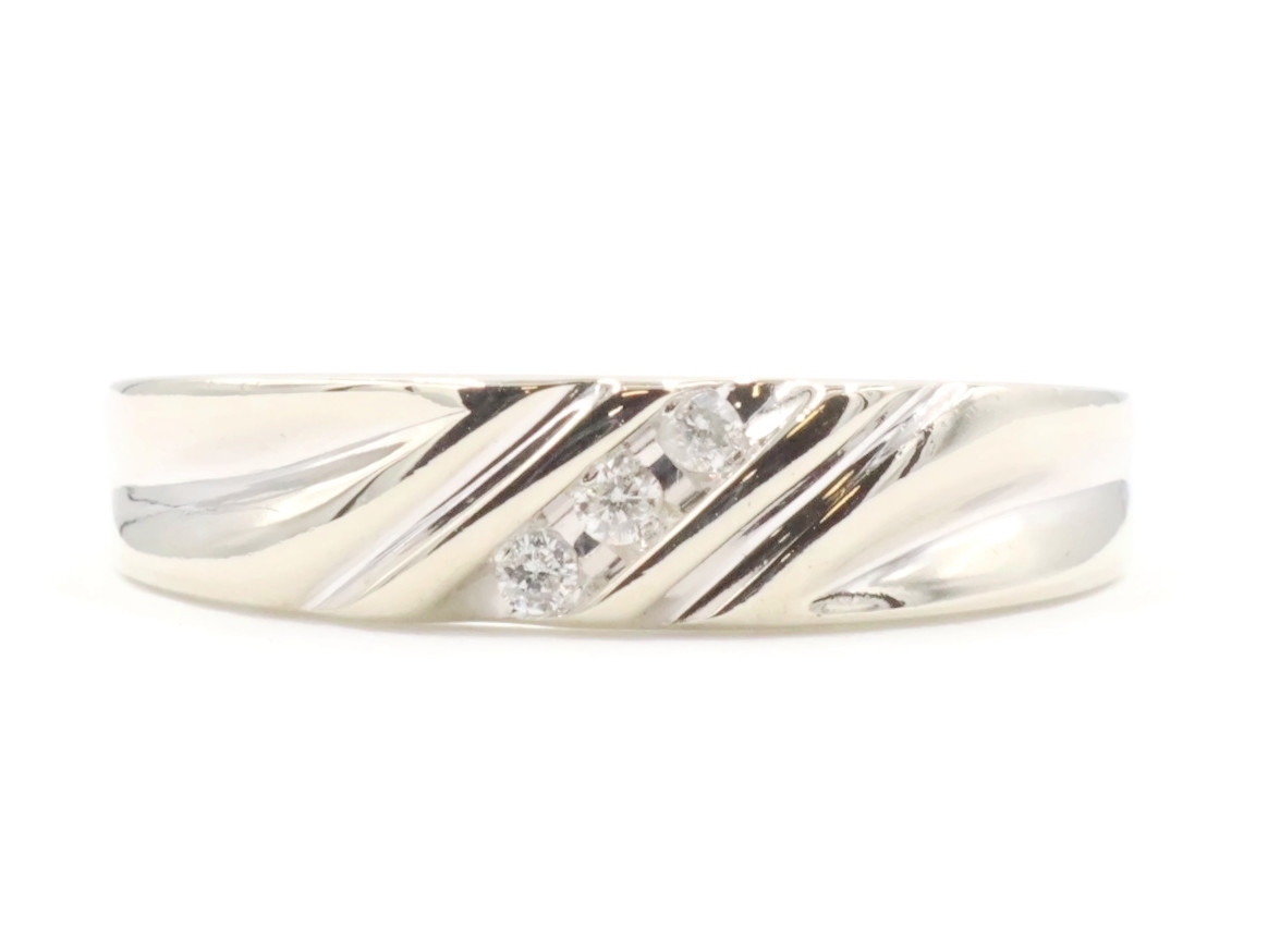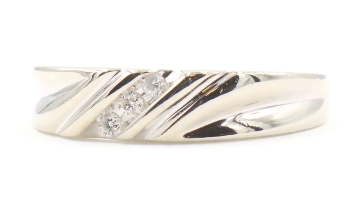 Diagonal Channel 0.04 ctw Round Diamond 10KT White Gold Wedding Ring - 1.84g. This ring is a size 7.