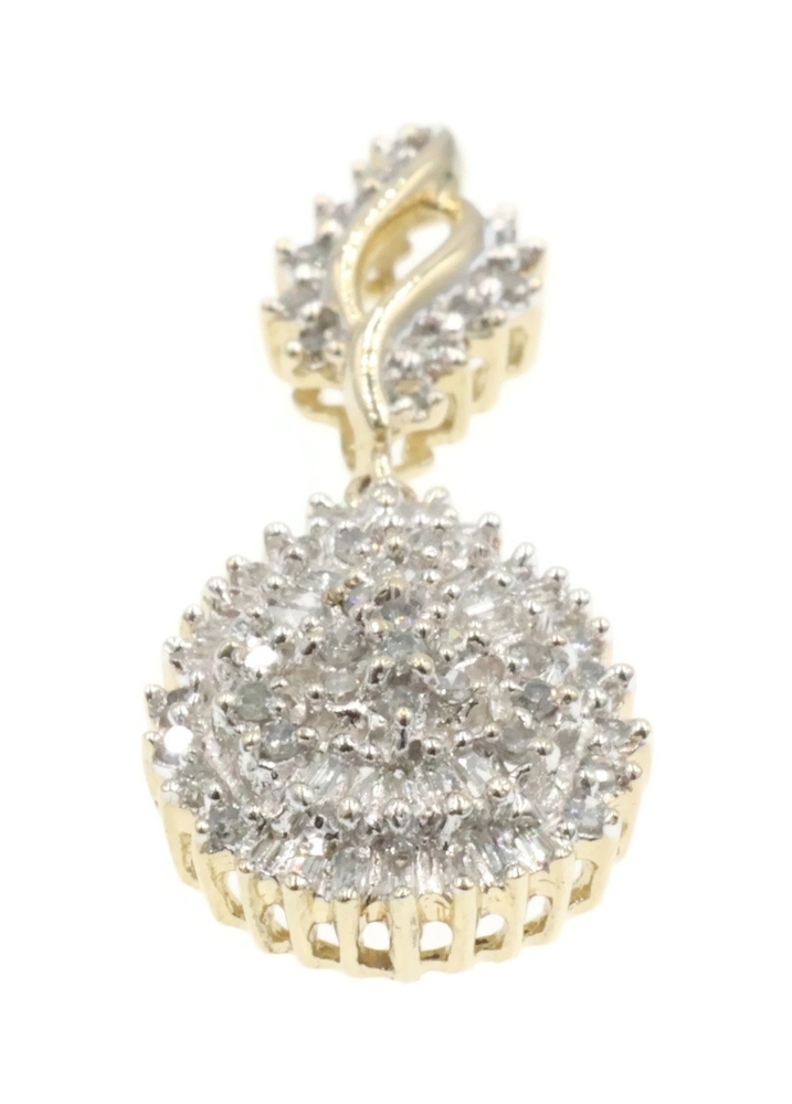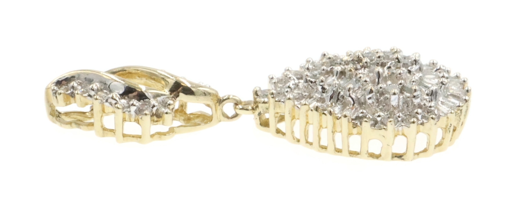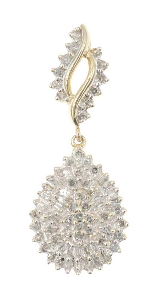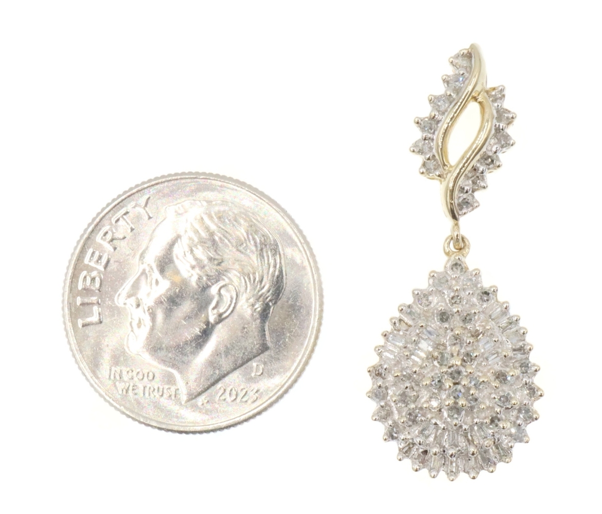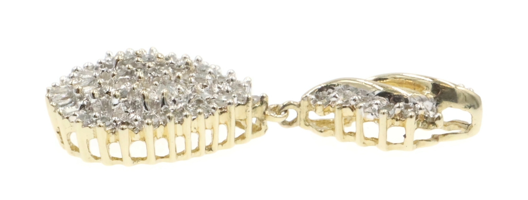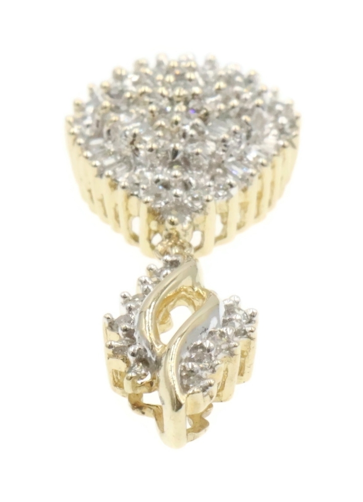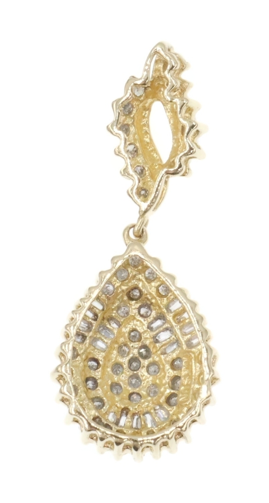 Estate 0.60 Ctw Round & Baguette Diamond Pear Cluster 10KT Gold Pendant 1.1" SUN. This pendant is approximately 29.5mm in length (including the bail) and 11.7mm in width.