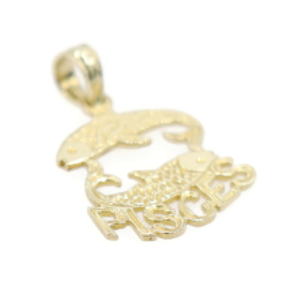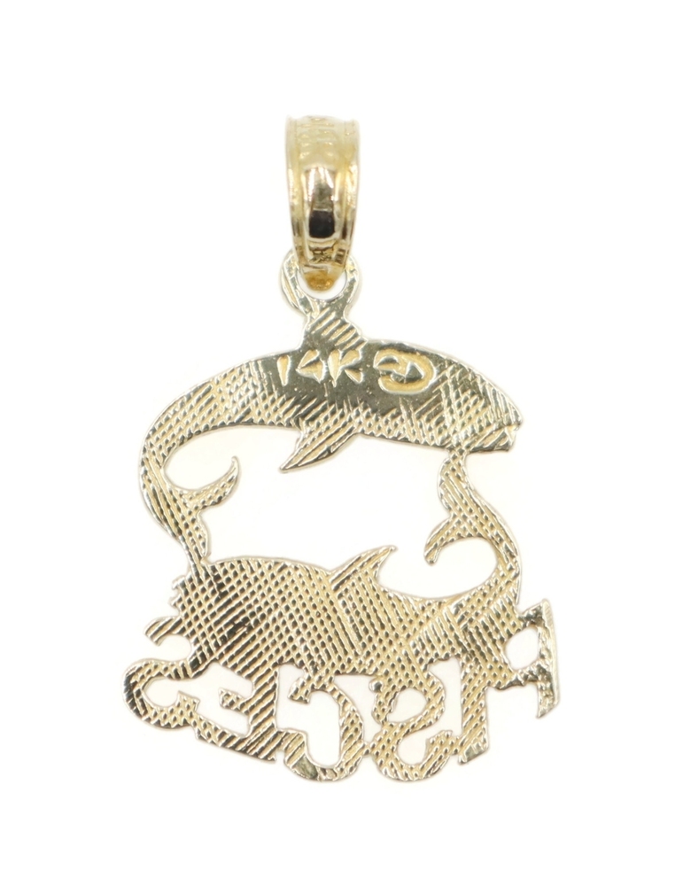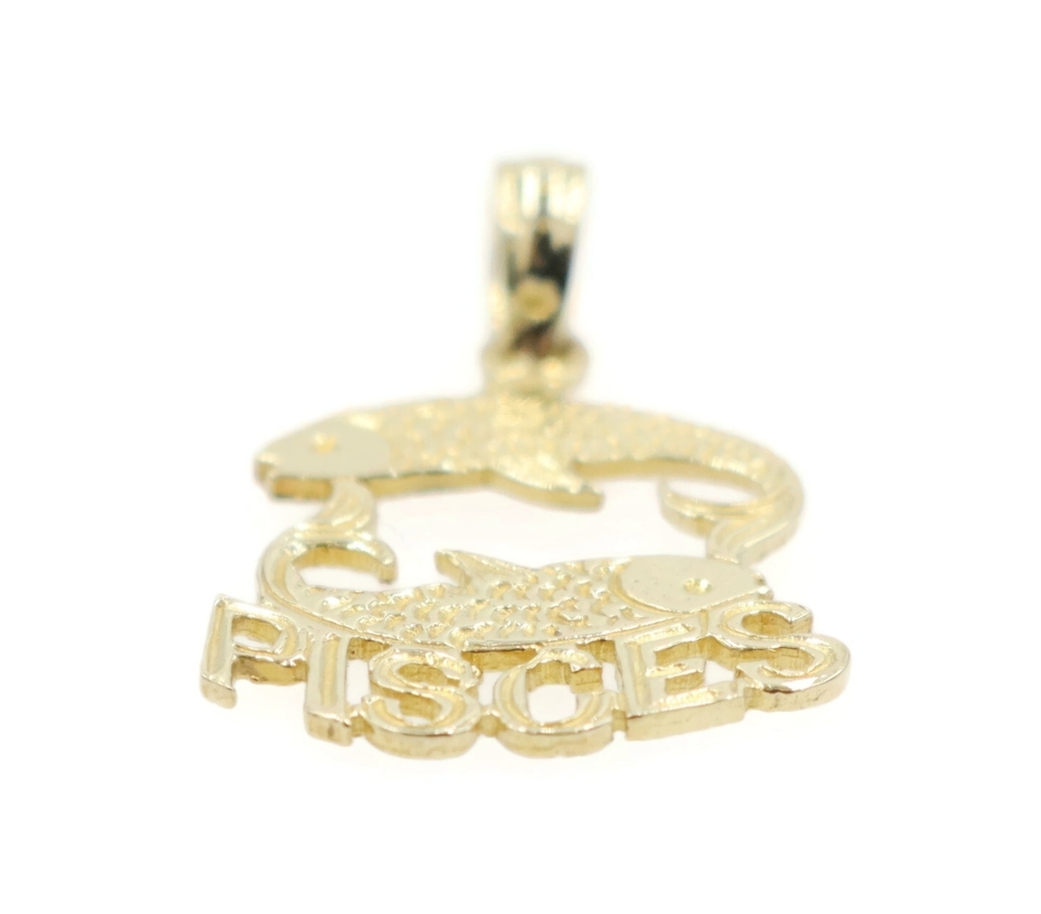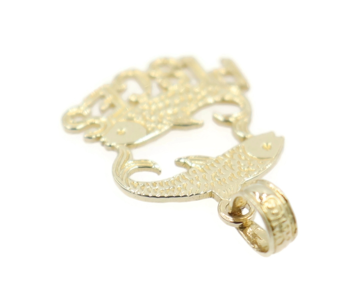 Estate 14KT Yellow Gold 19.6mm Classic Pisces Zodiac Swimming Fish Pendant 0.74g. This pendant is approximately 19.6mm in length (including the bail) and 12.6mm in width.