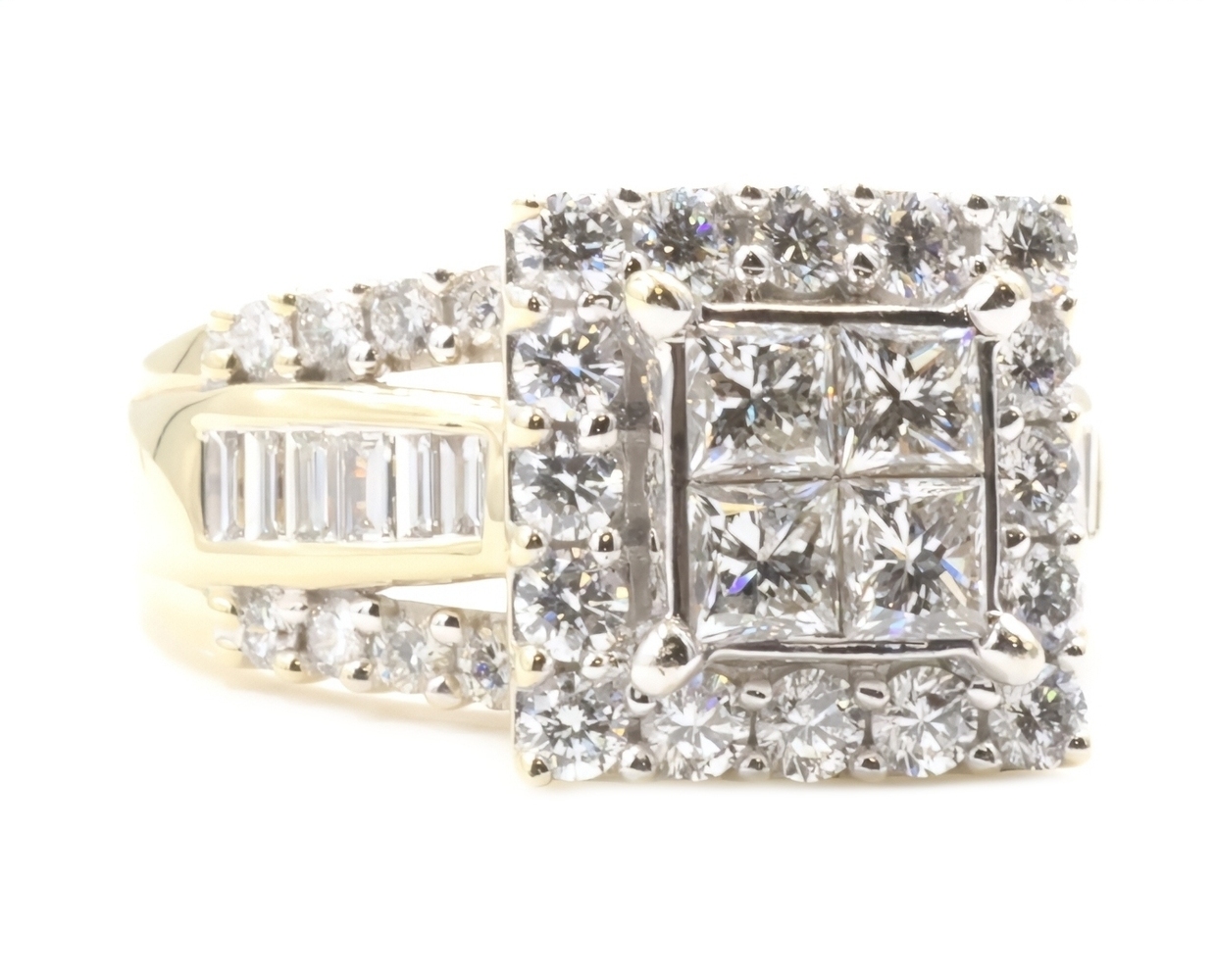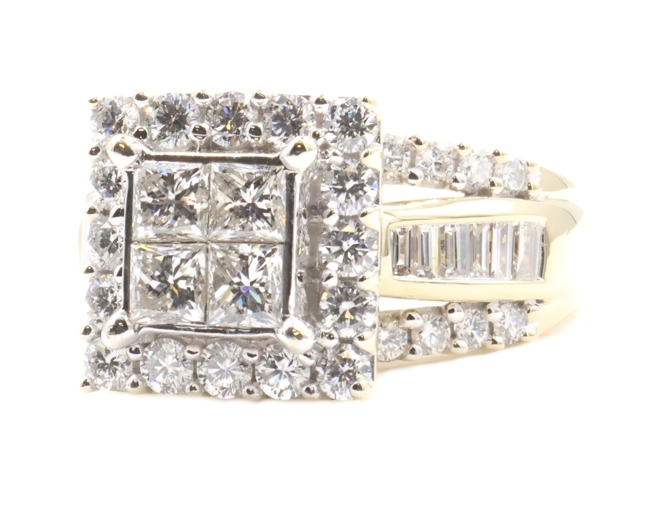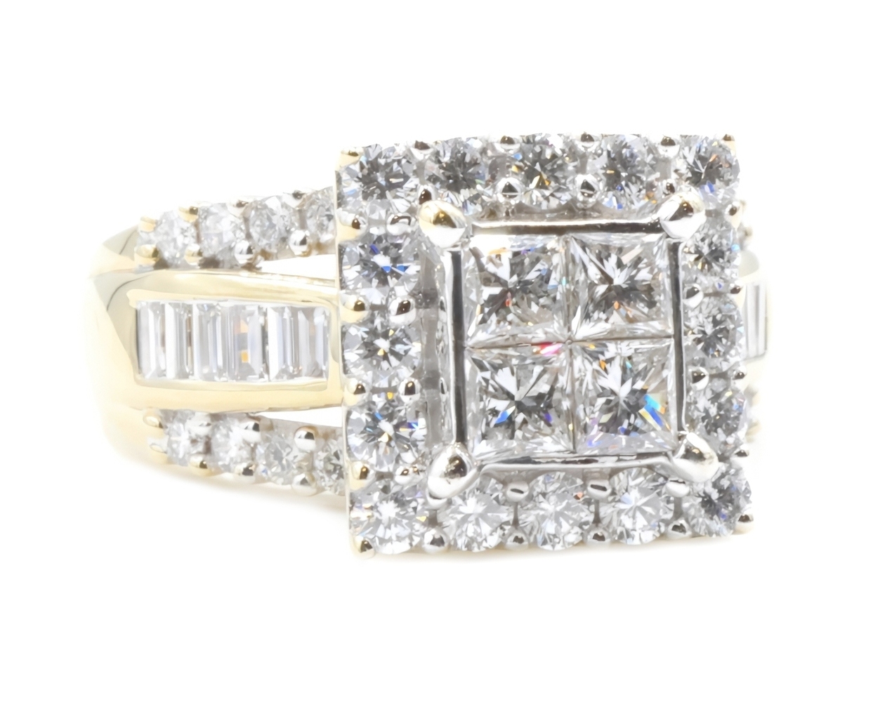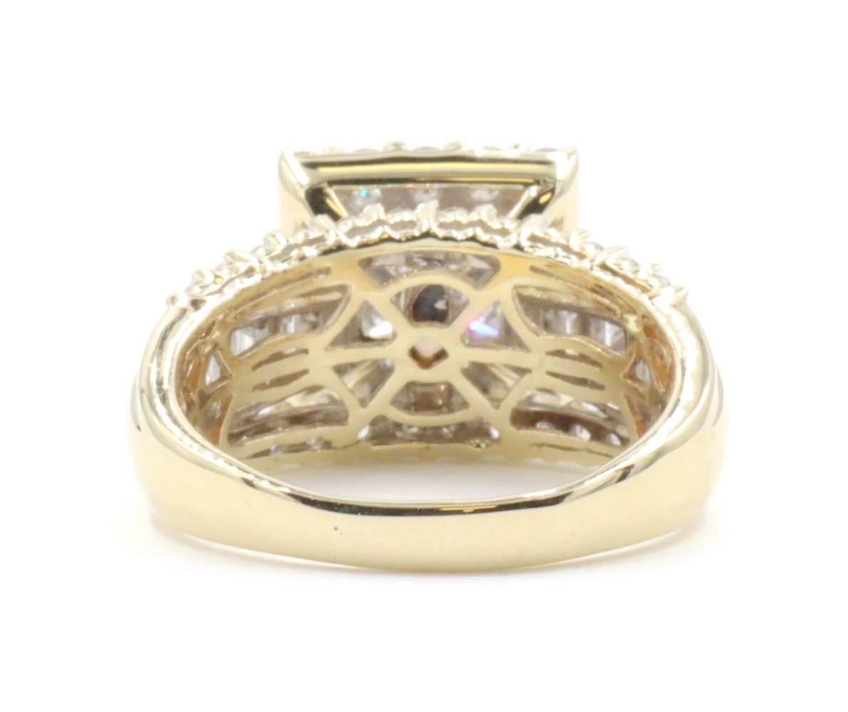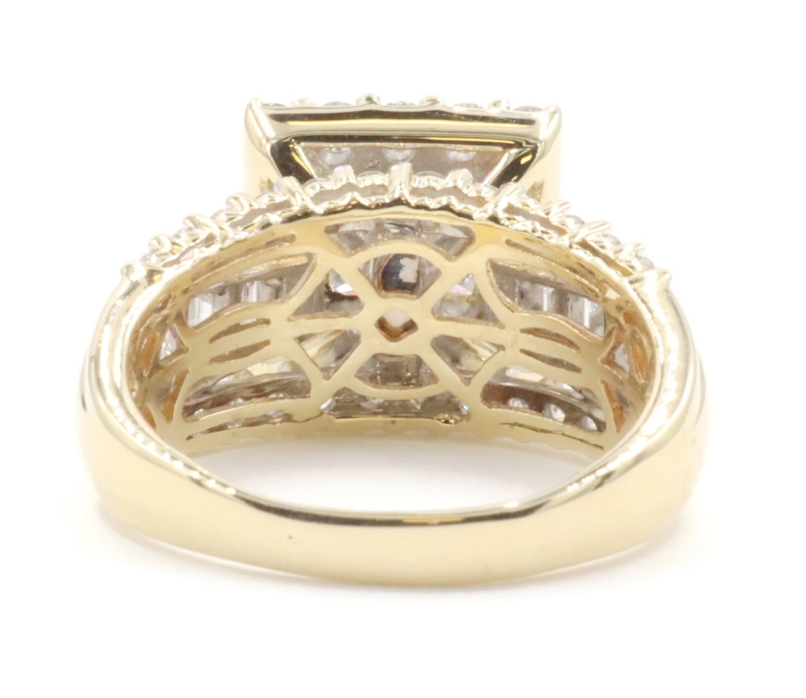 Estate 3.25 ctw Princess Round & Baguette 14KT Yellow Gold Halo Engagement Ring. This ring is a size 10.