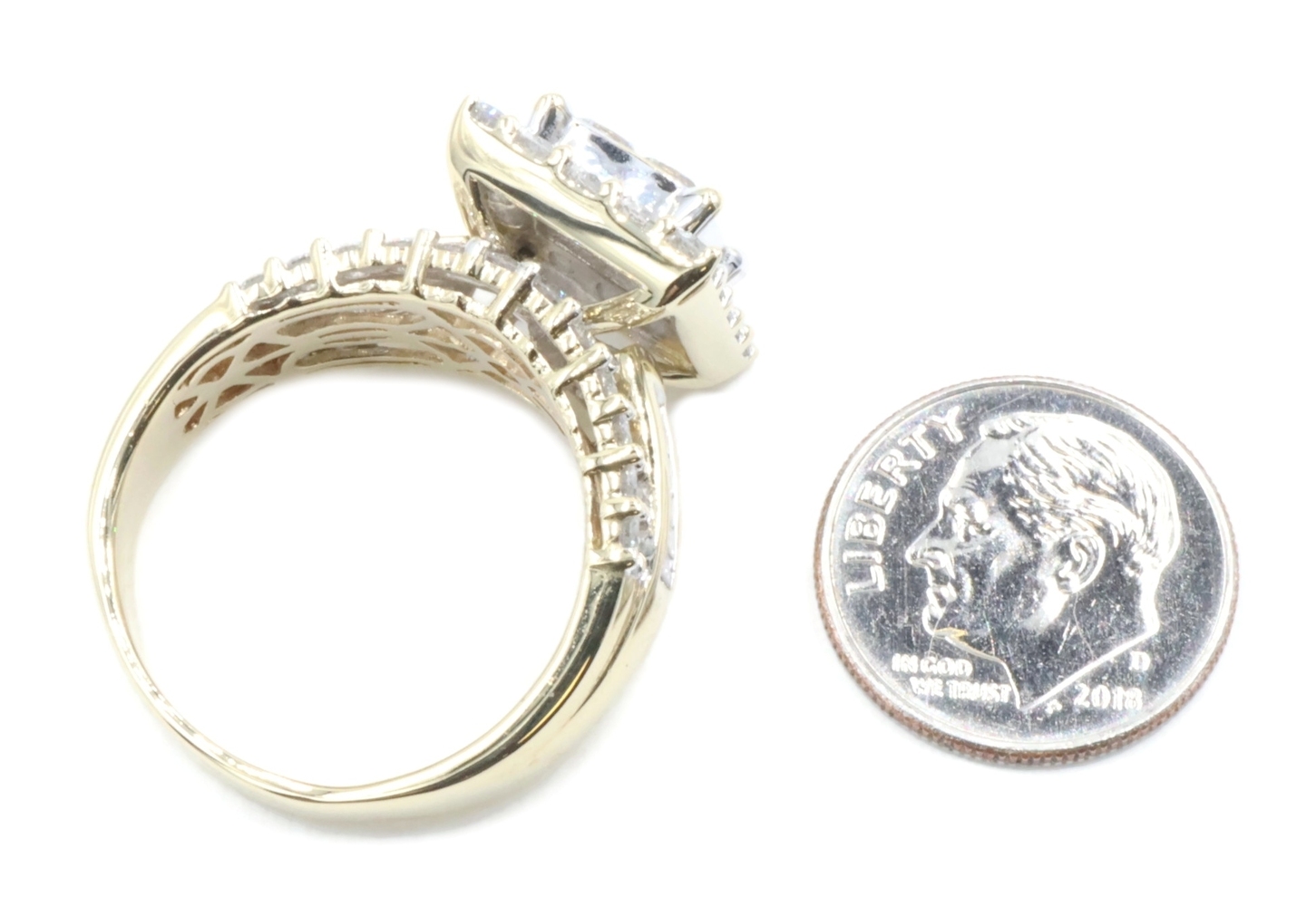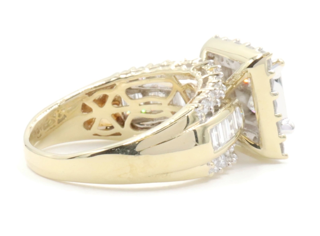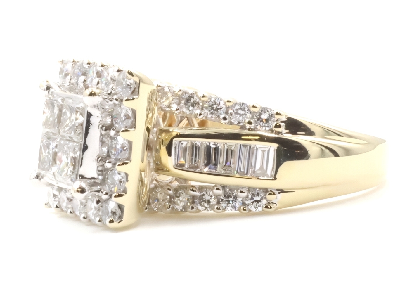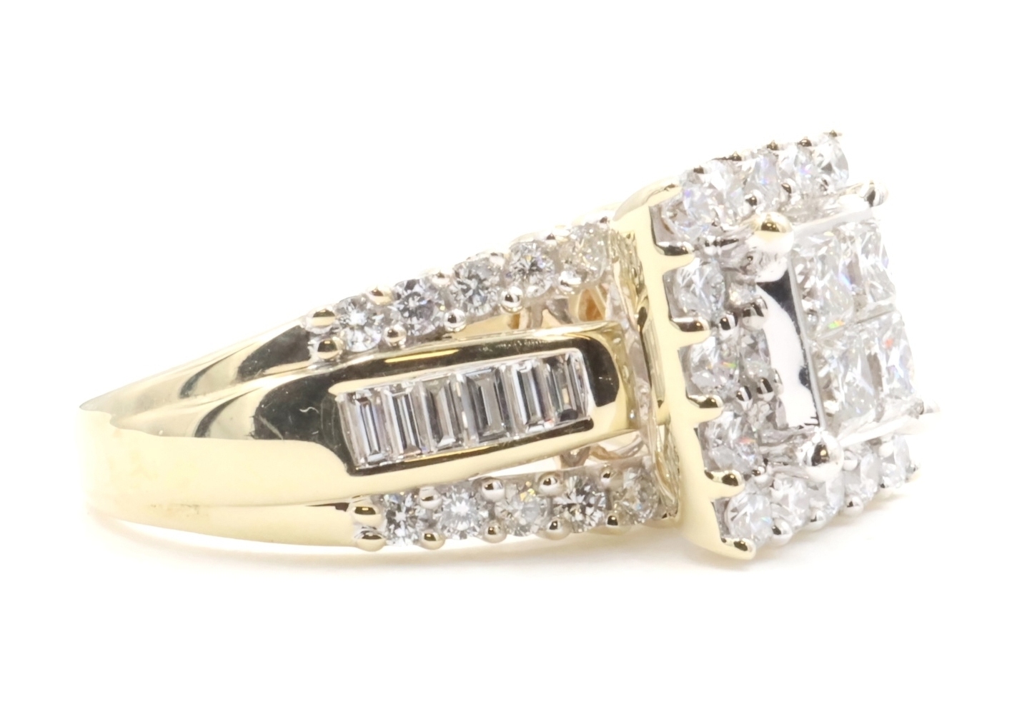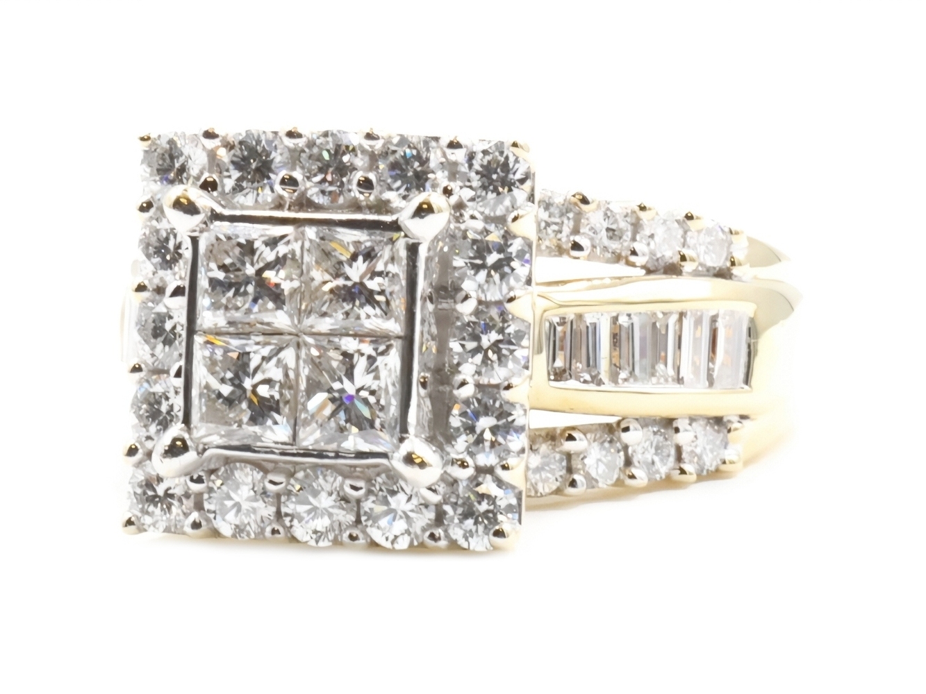 Estate 3.25 ctw Princess Round & Baguette 14KT Yellow Gold Halo Engagement Ring. This ring is a size 10.