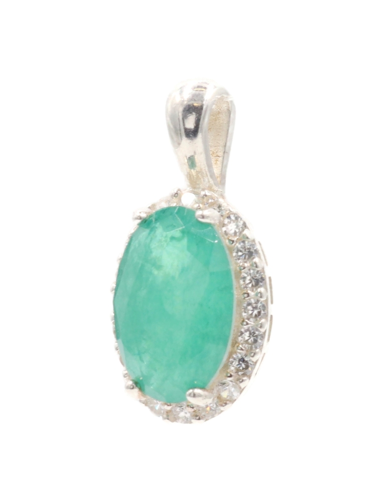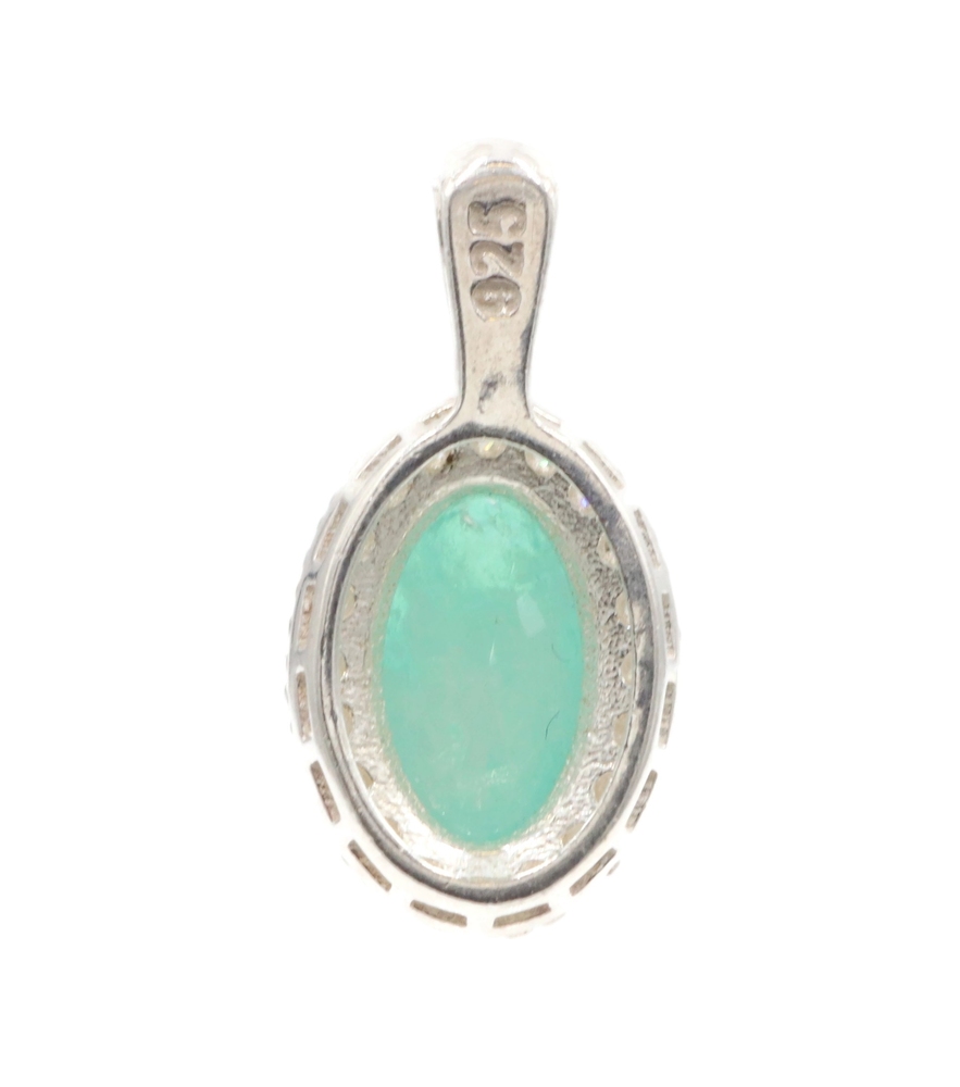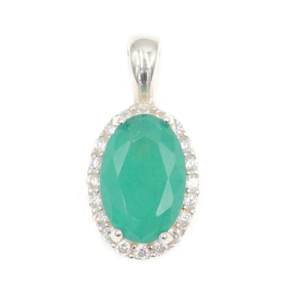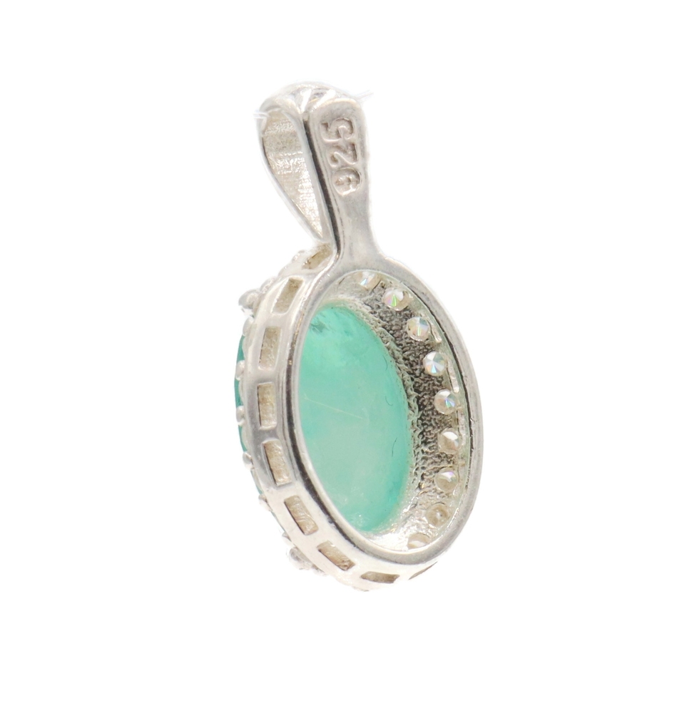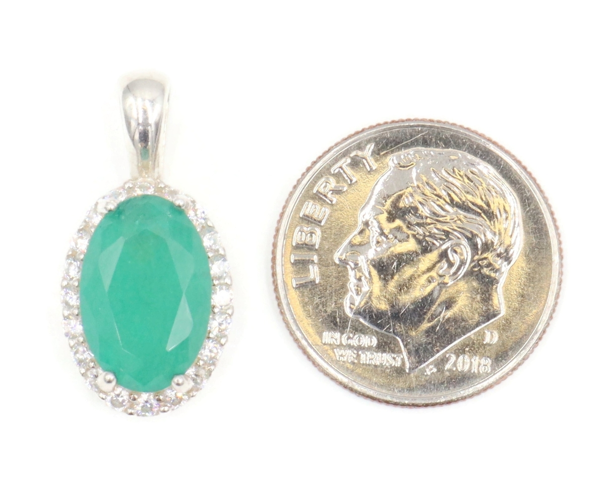 Estate Emerald Green Oval Cut CZ with Round Cut CZ Halo Sterling Silver Pendant. The total approximate length of this pendant (including the bail) 21.1mm.