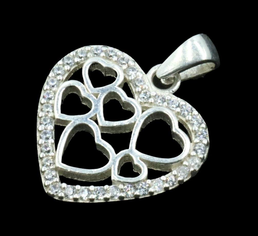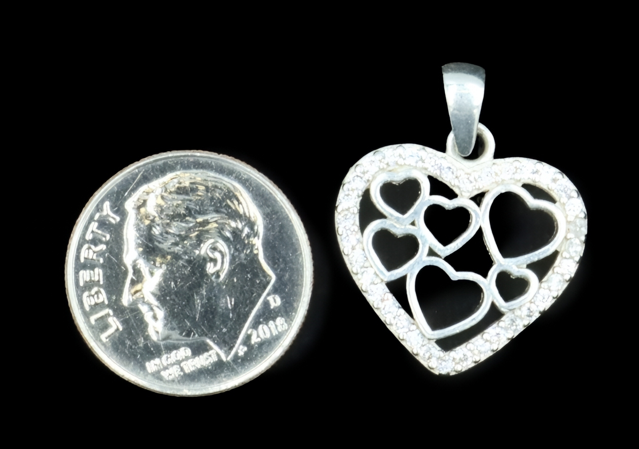 Estate Sterling Silver 925 Heart Shaped Necklace Pendant with Round Cut CZ Halo. This pendant features a halo of round cut cubic zirconia (CZ) stones. The pendant meaures 22.7mm (including bail) by 18.2mm wide.