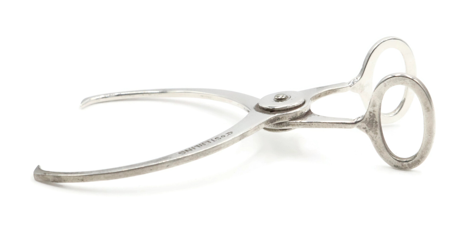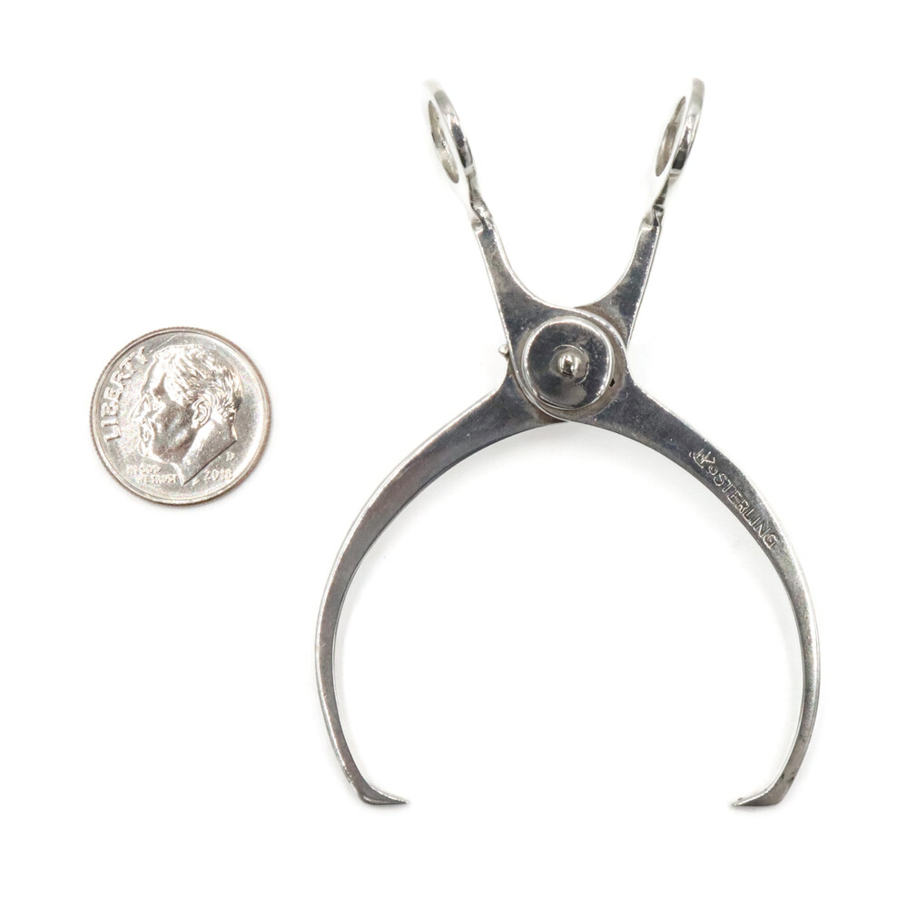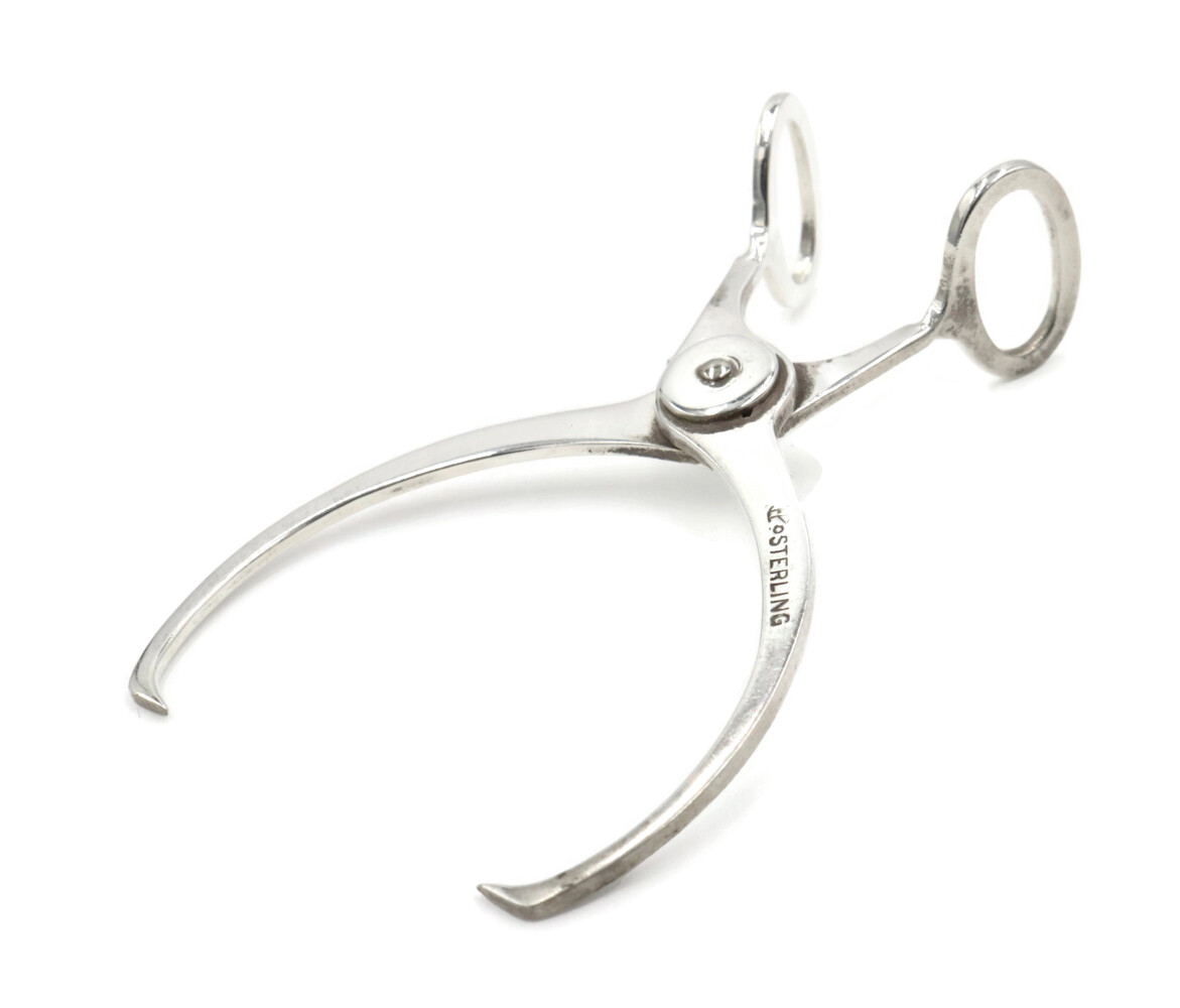 Estate Sterling Silver Hay Hook Motif 3 Inch Spring Loaded Sugar Tongs - 11.99g. These sugar tongs have an approximate length of 3 inches and a maximum opening size of 1 1/8 inches.
