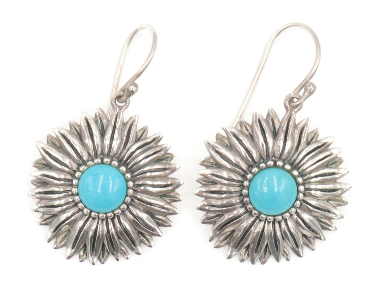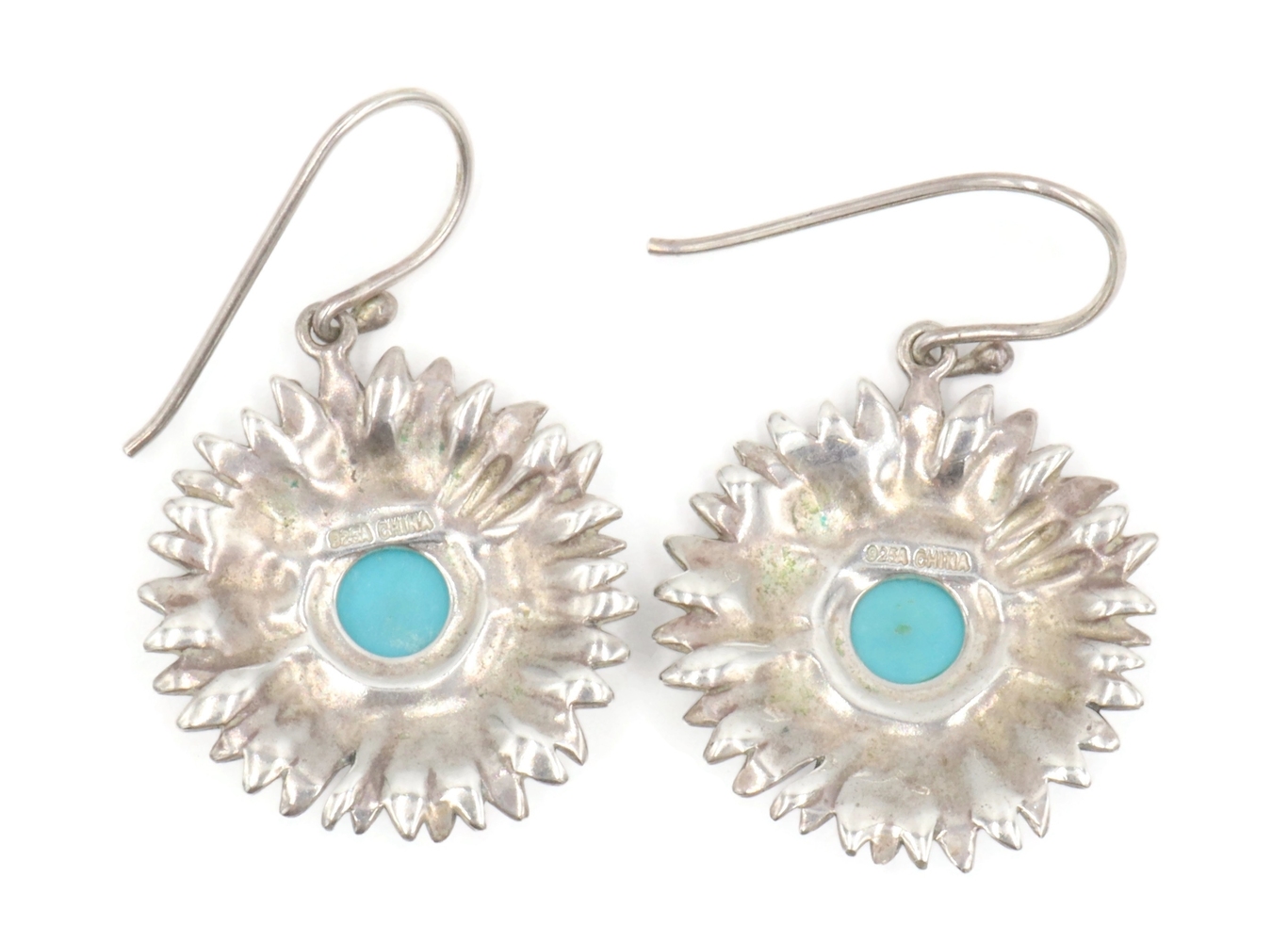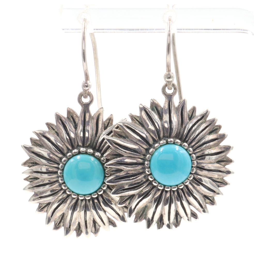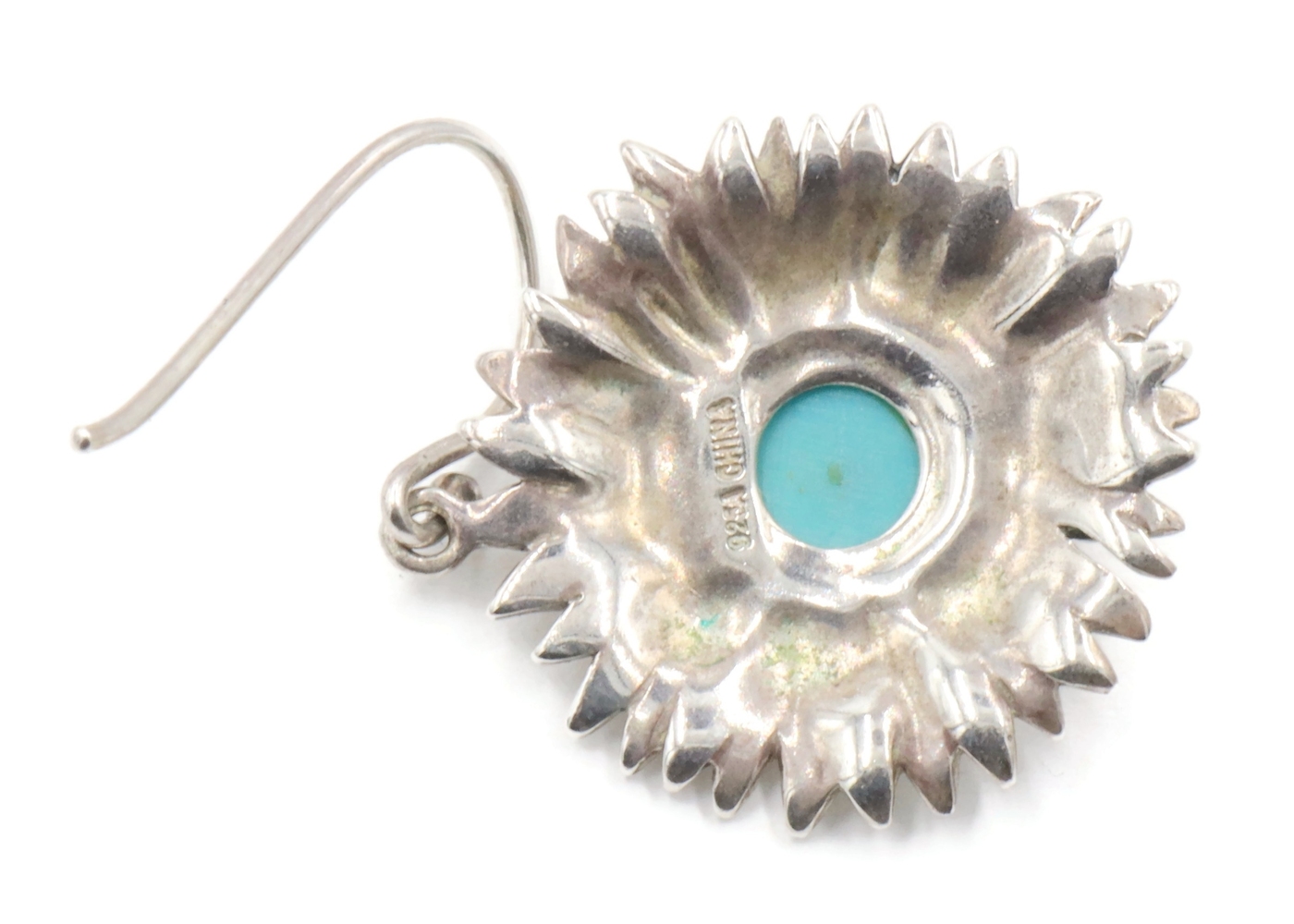 Estate Sterling Silver Round Cabochon Turquoise 36.3mm Sunflower Dangle Earrings | USA Pawn