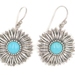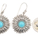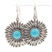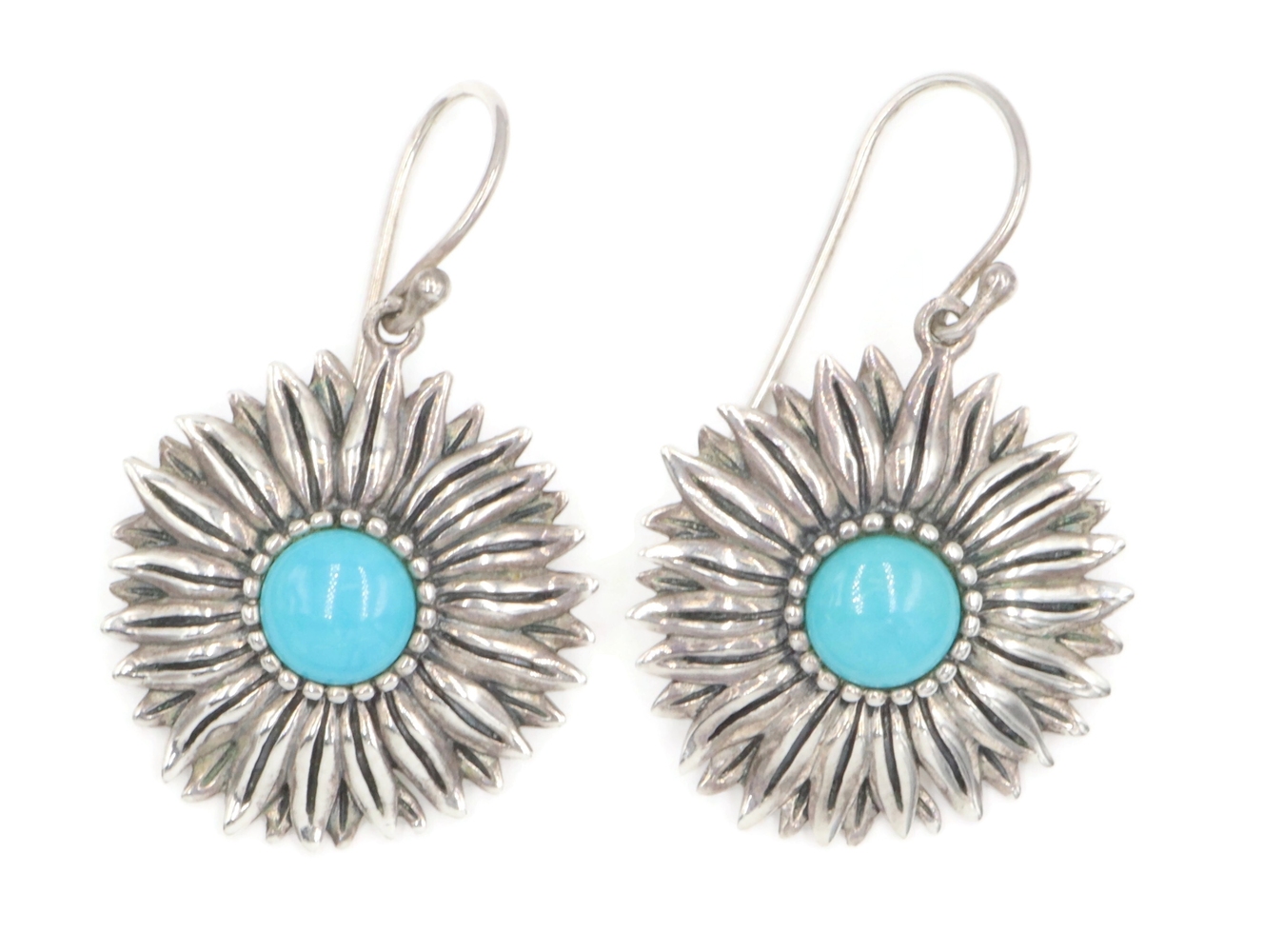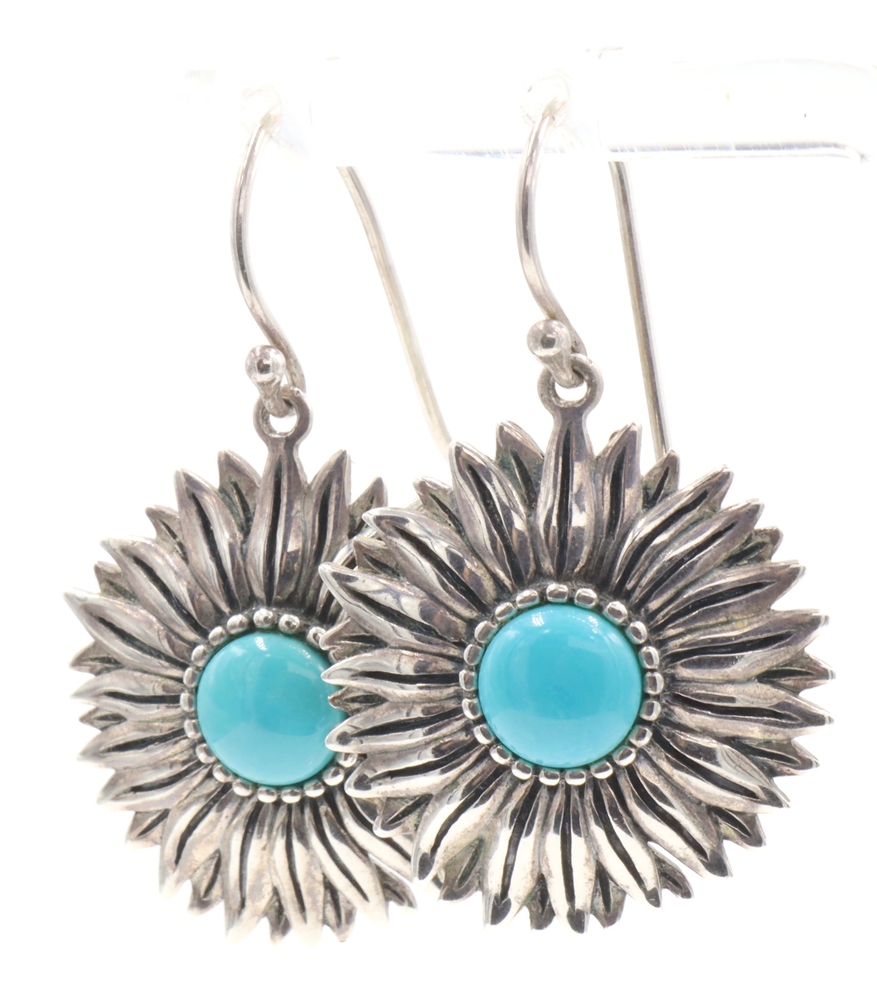 Estate Sterling Silver Round Cabochon Turquoise 36.3mm Sunflower Dangle Earrings. The sunflower has a max width of 23.1mm.