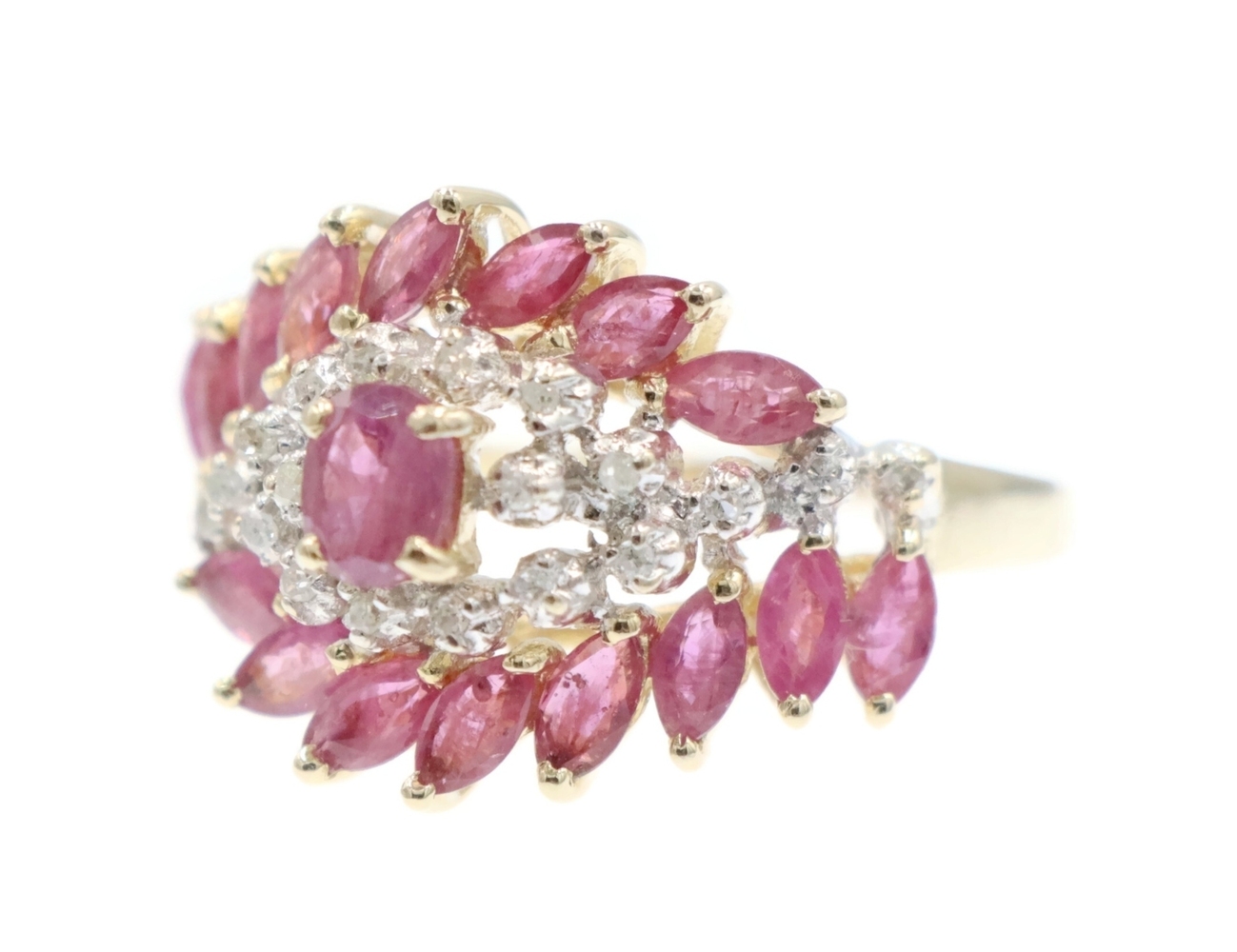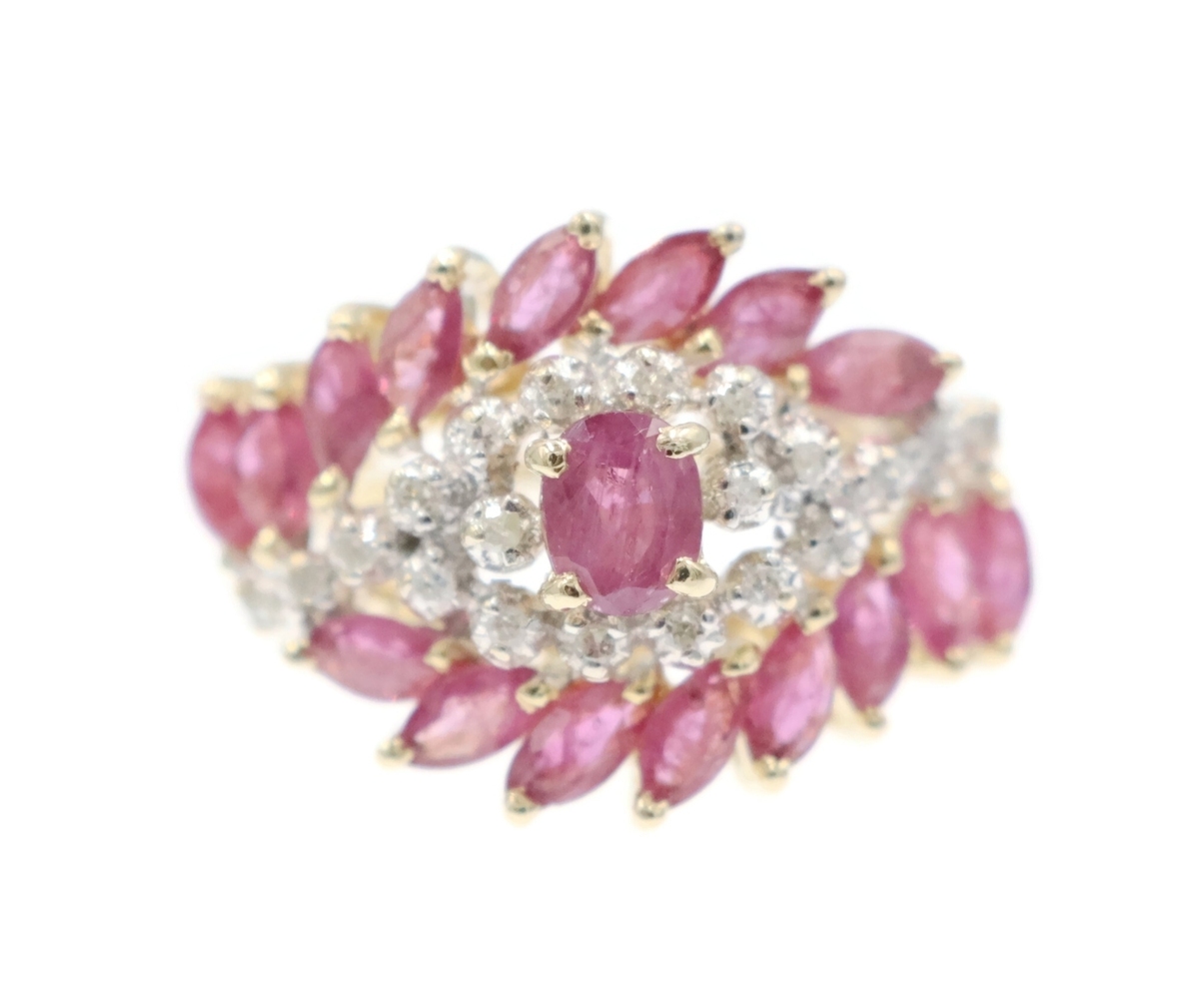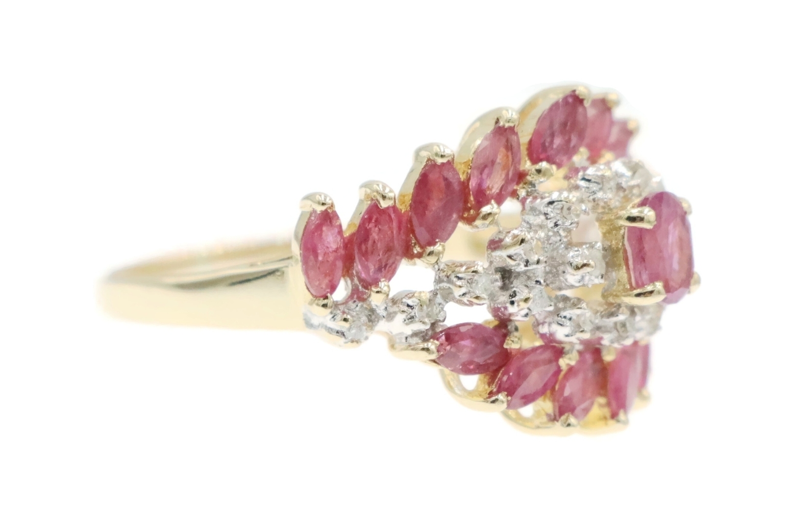 Fancy 1.30 Ctw Oval & Marquise Natural Ruby with Diamond Accents 14KT Gold Ring. This ring is a size 7 1/2.