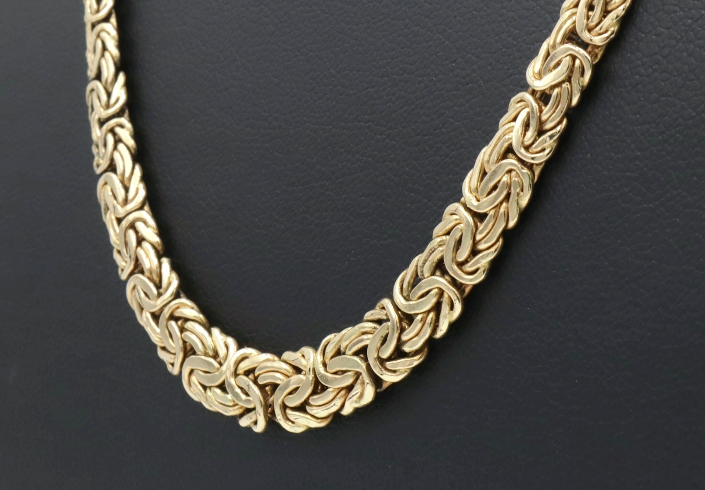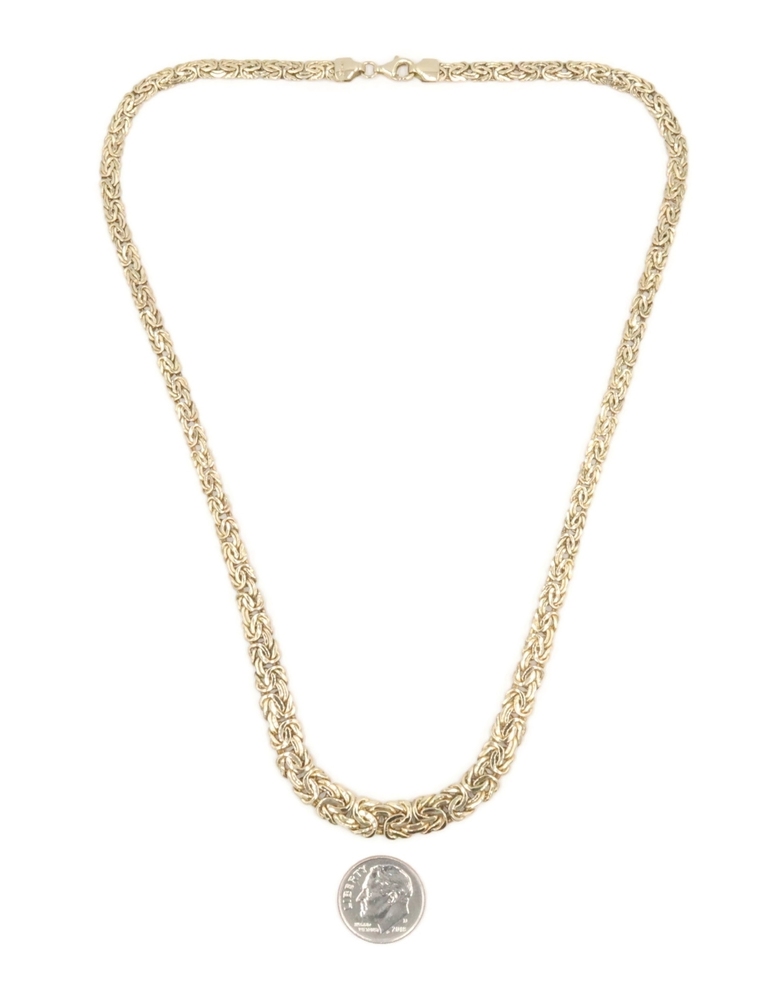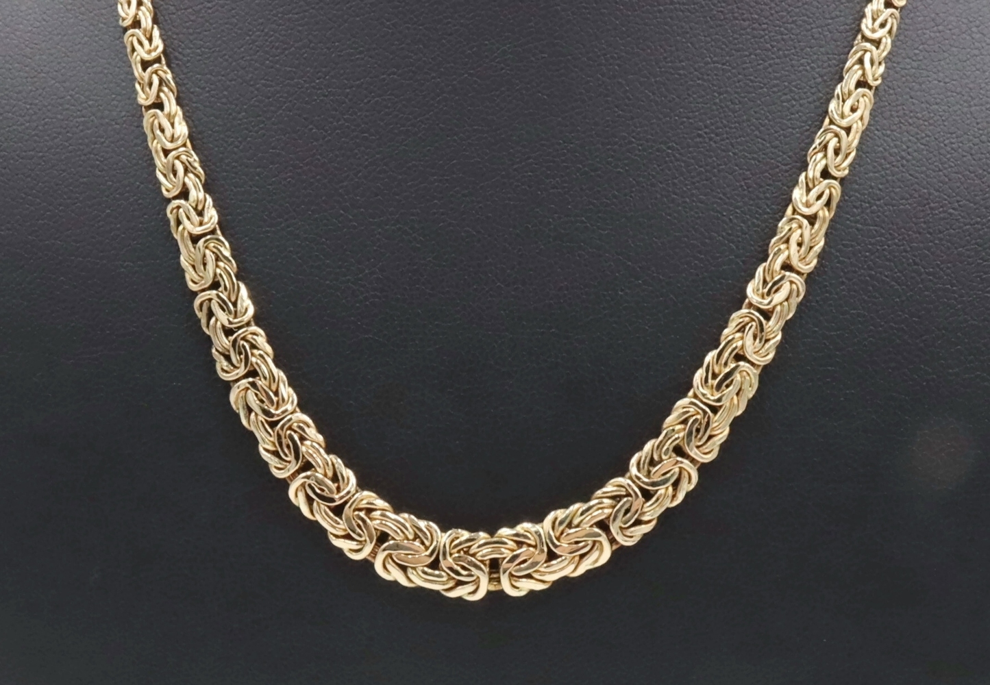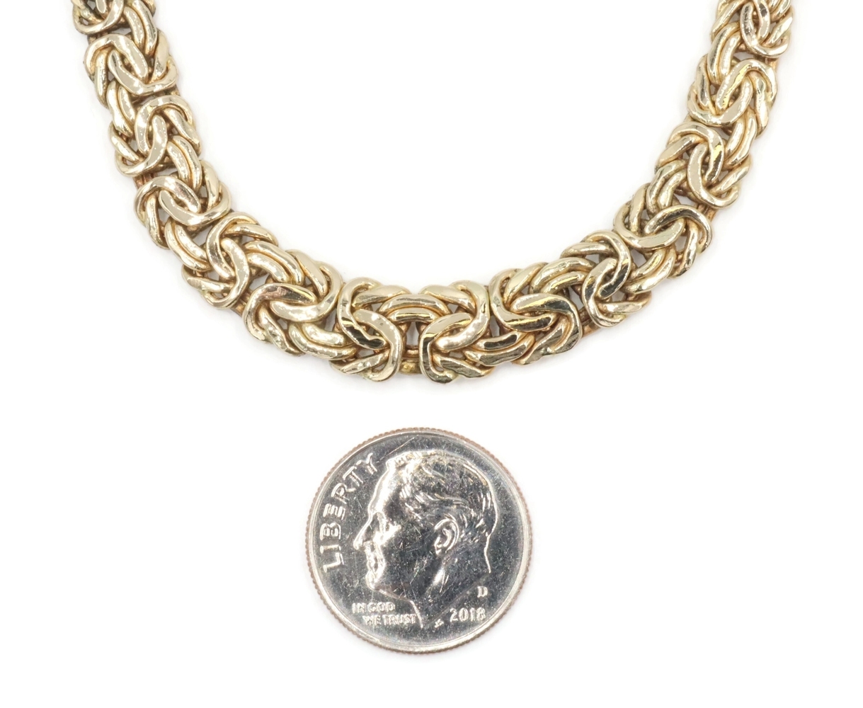 Fancy Graduated 14KT Yellow Gold Flat Byzantine Necklace 18" AK Turkey - 11.03g. This necklace is approximately 18 1/4 inches in length with a maximum width of 7.9mm.