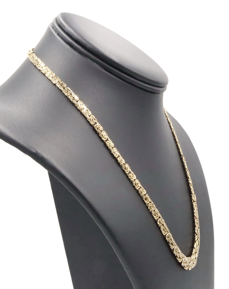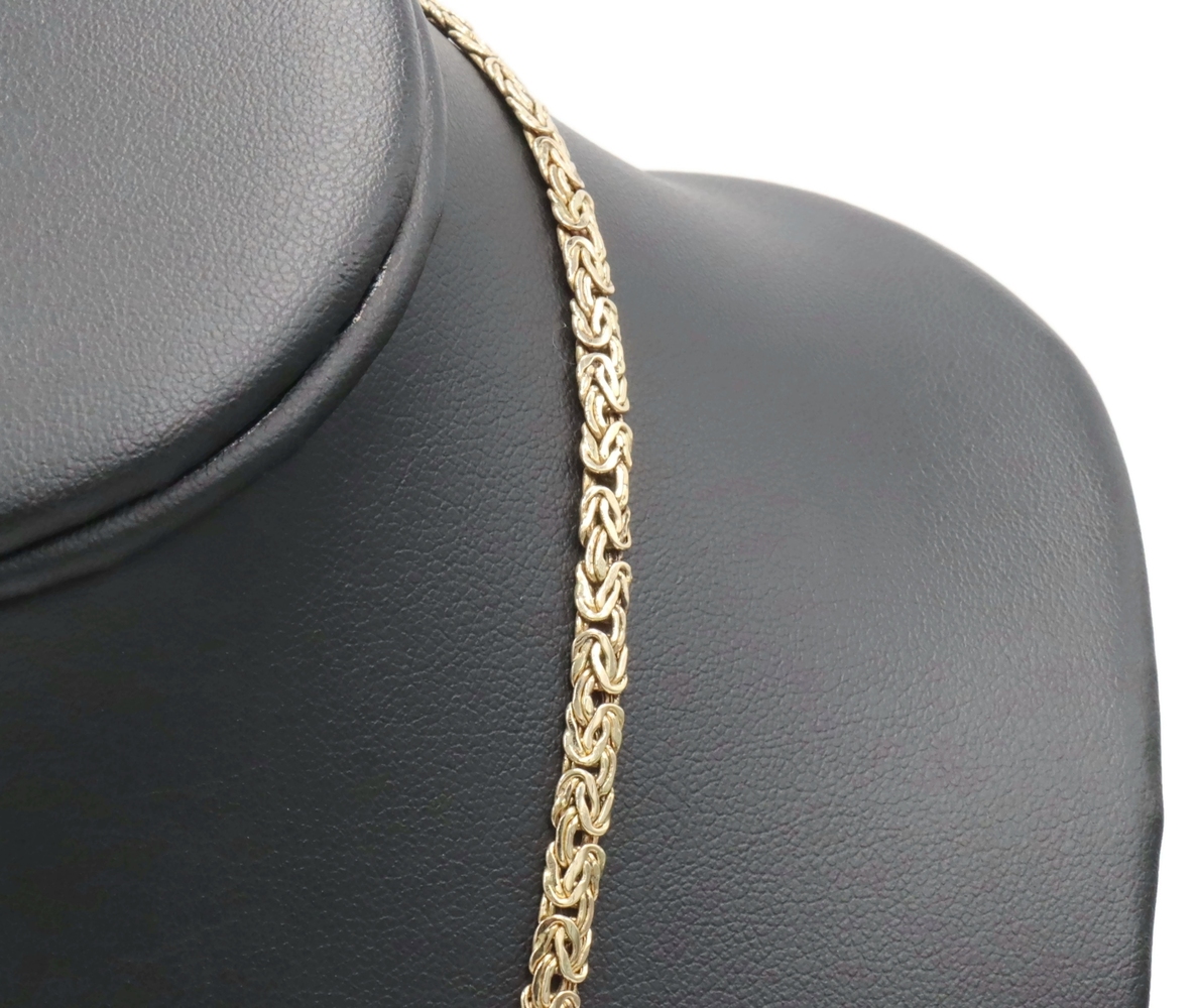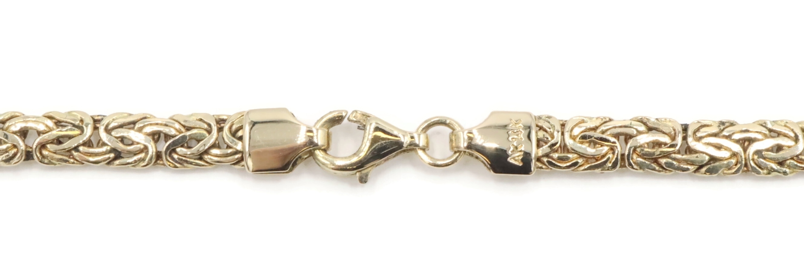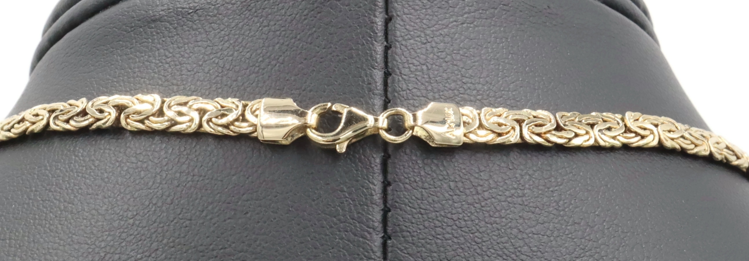 Fancy Graduated 14KT Yellow Gold Flat Byzantine Necklace 18" AK Turkey - 11.03g. This necklace is approximately 18 1/4 inches in length with a maximum width of 7.9mm.