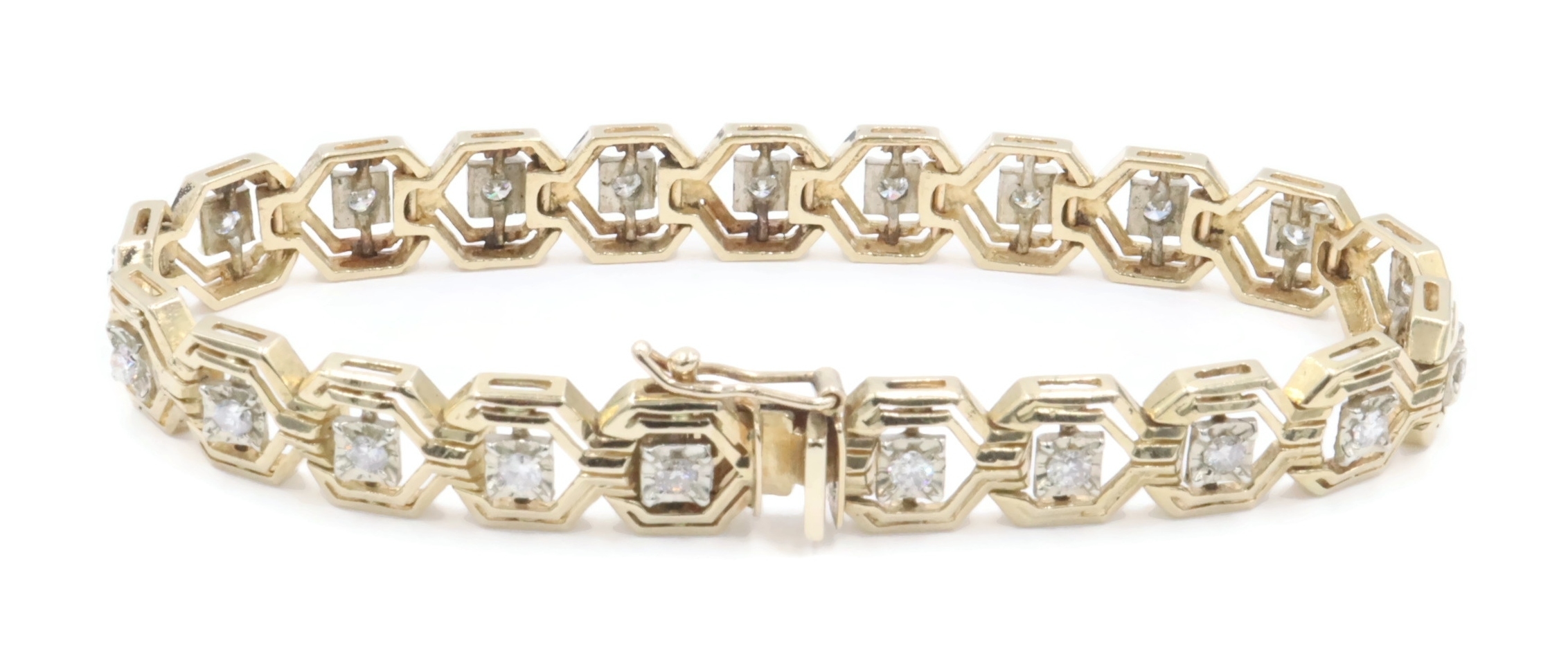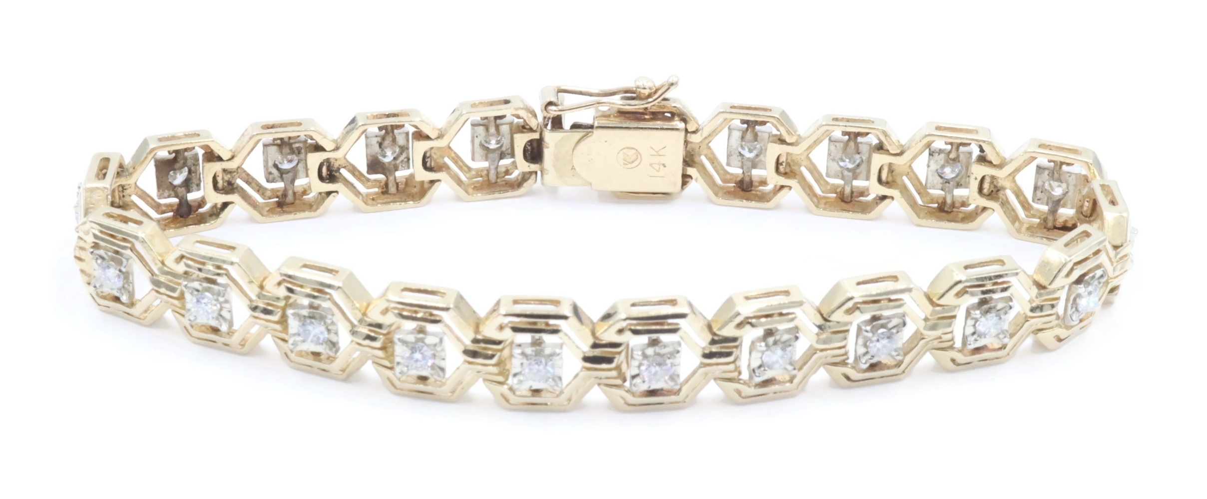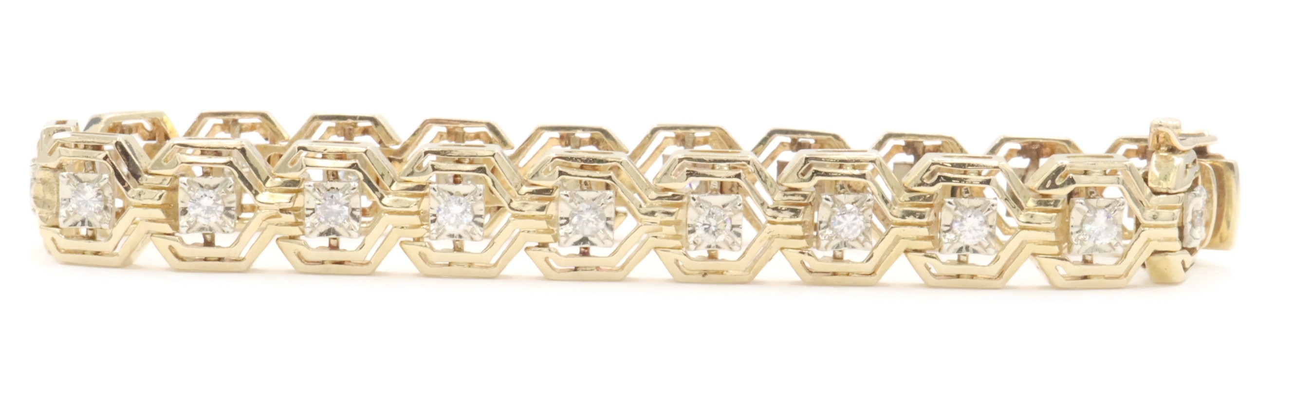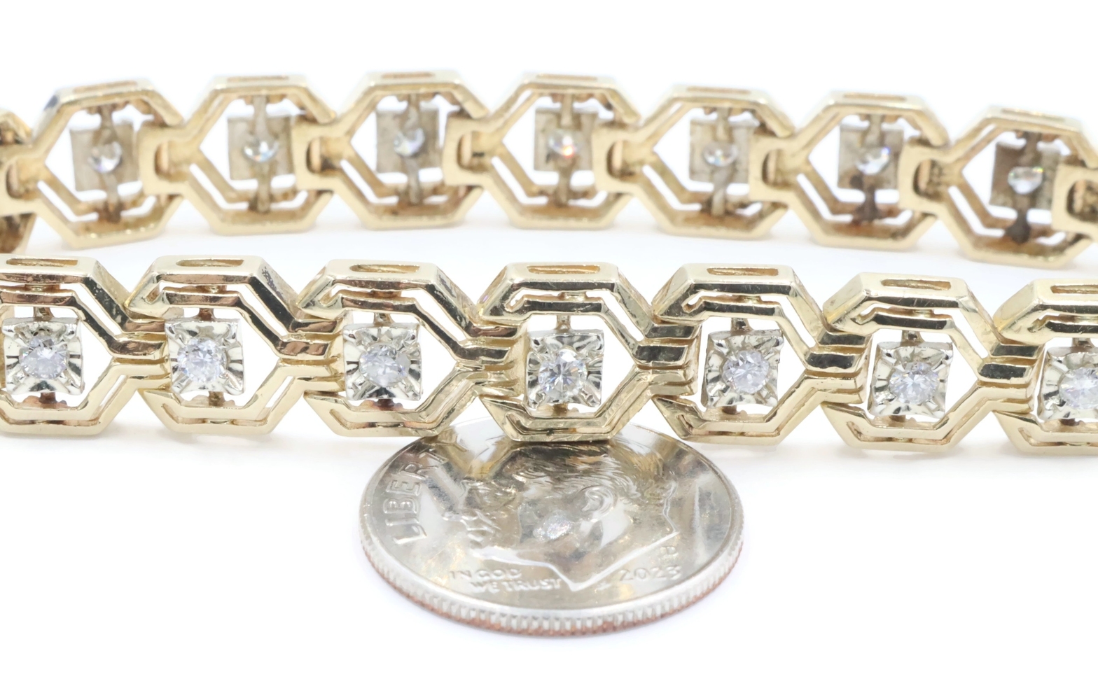 Fancy Hexagon Link 0.52 Ctw Round Diamond 14KT Yellow Gold Tennis Bracelet 7". This bracelet is approximately 7 inches in length and 8.8mm in width.