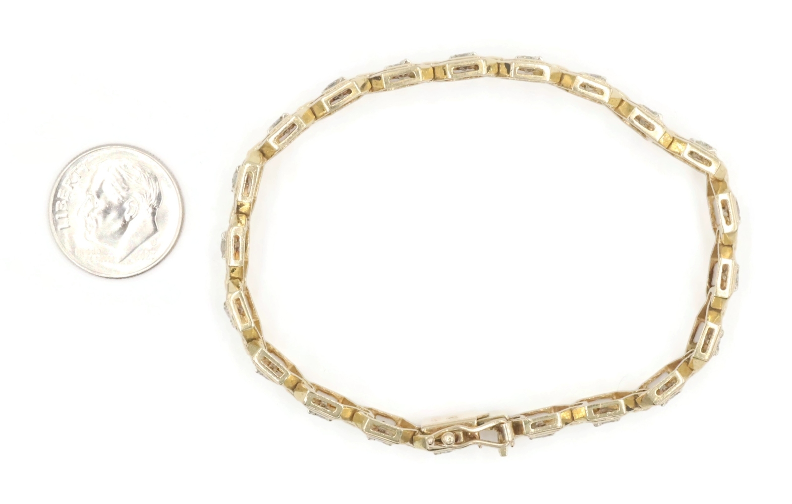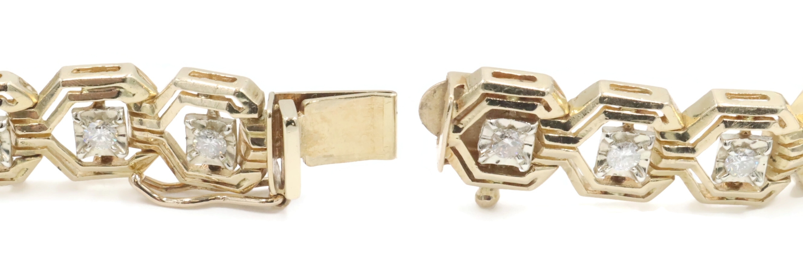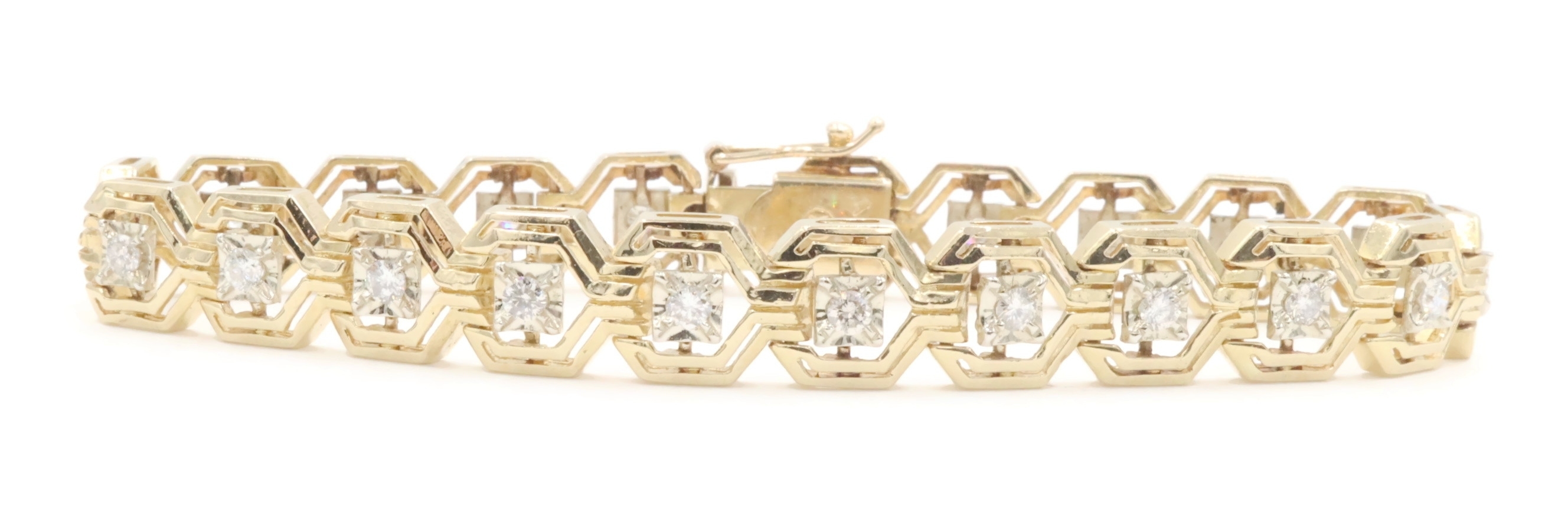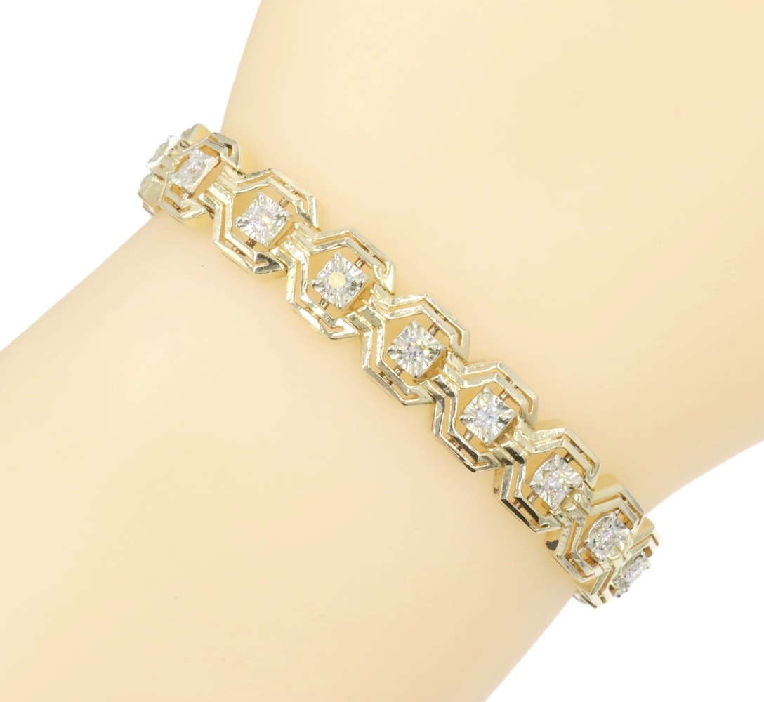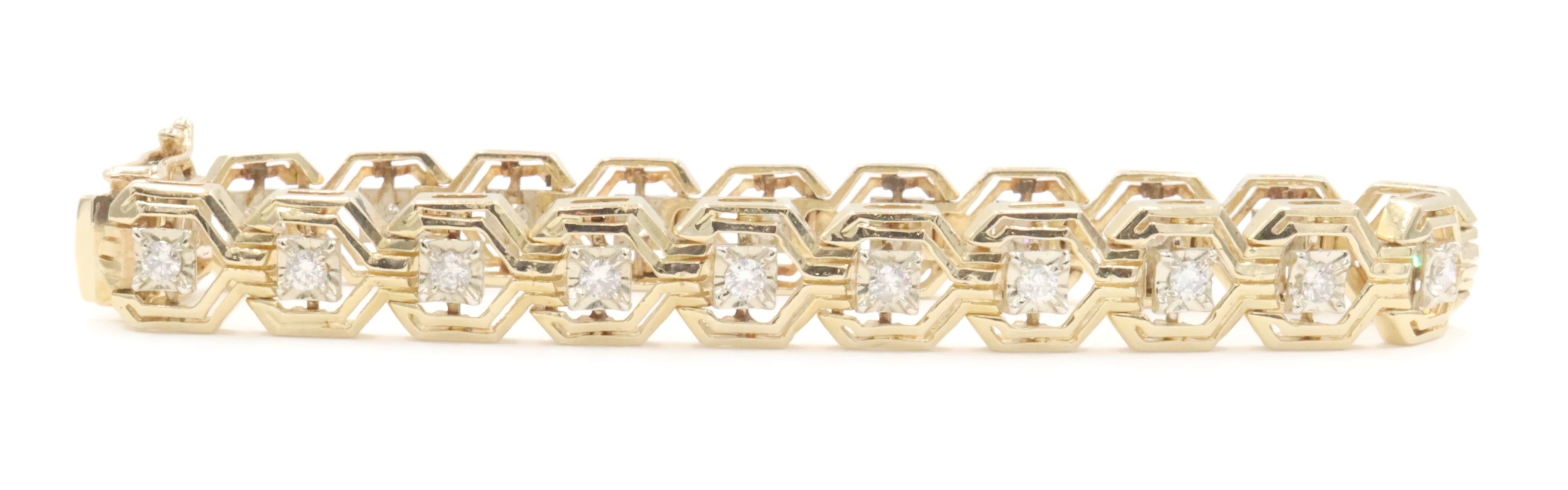 Fancy Hexagon Link 0.52 Ctw Round Diamond 14KT Yellow Gold Tennis Bracelet 7". This bracelet is approximately 7 inches in length and 8.8mm in width.