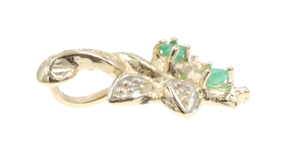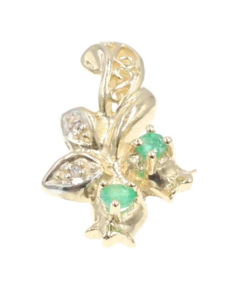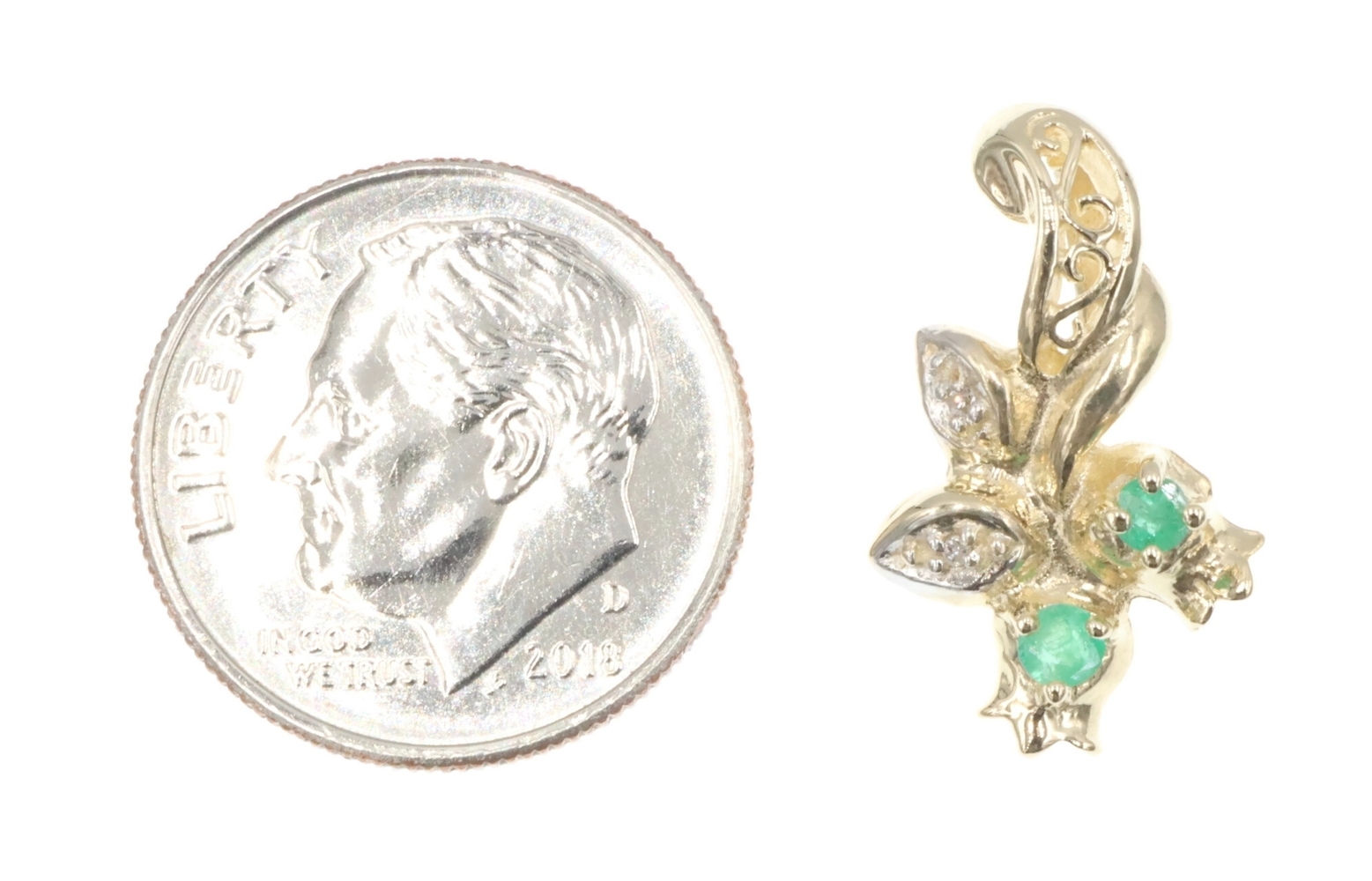 Floral Filigree 0.06 Ctw Natural Emerald & Diamond 10KT Gold 18.5mm Pendant 1.2g. This pendant is approximately 18.5mm in length and 11.1mm in width.