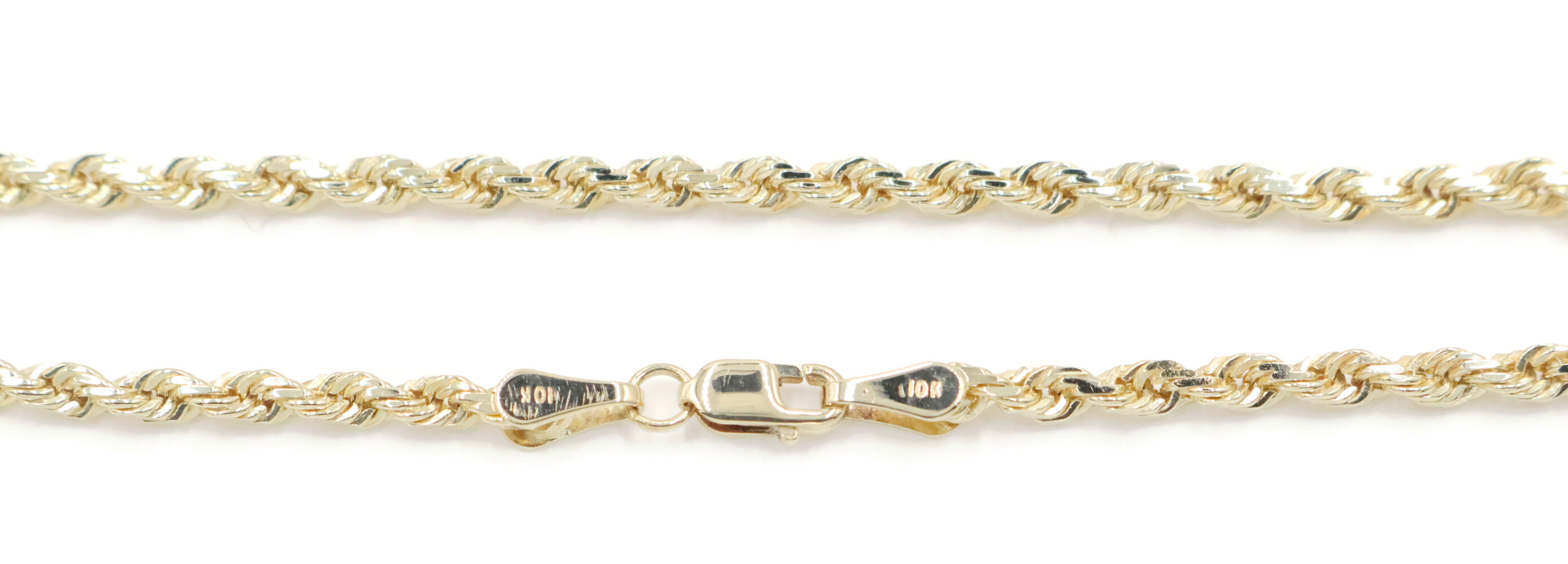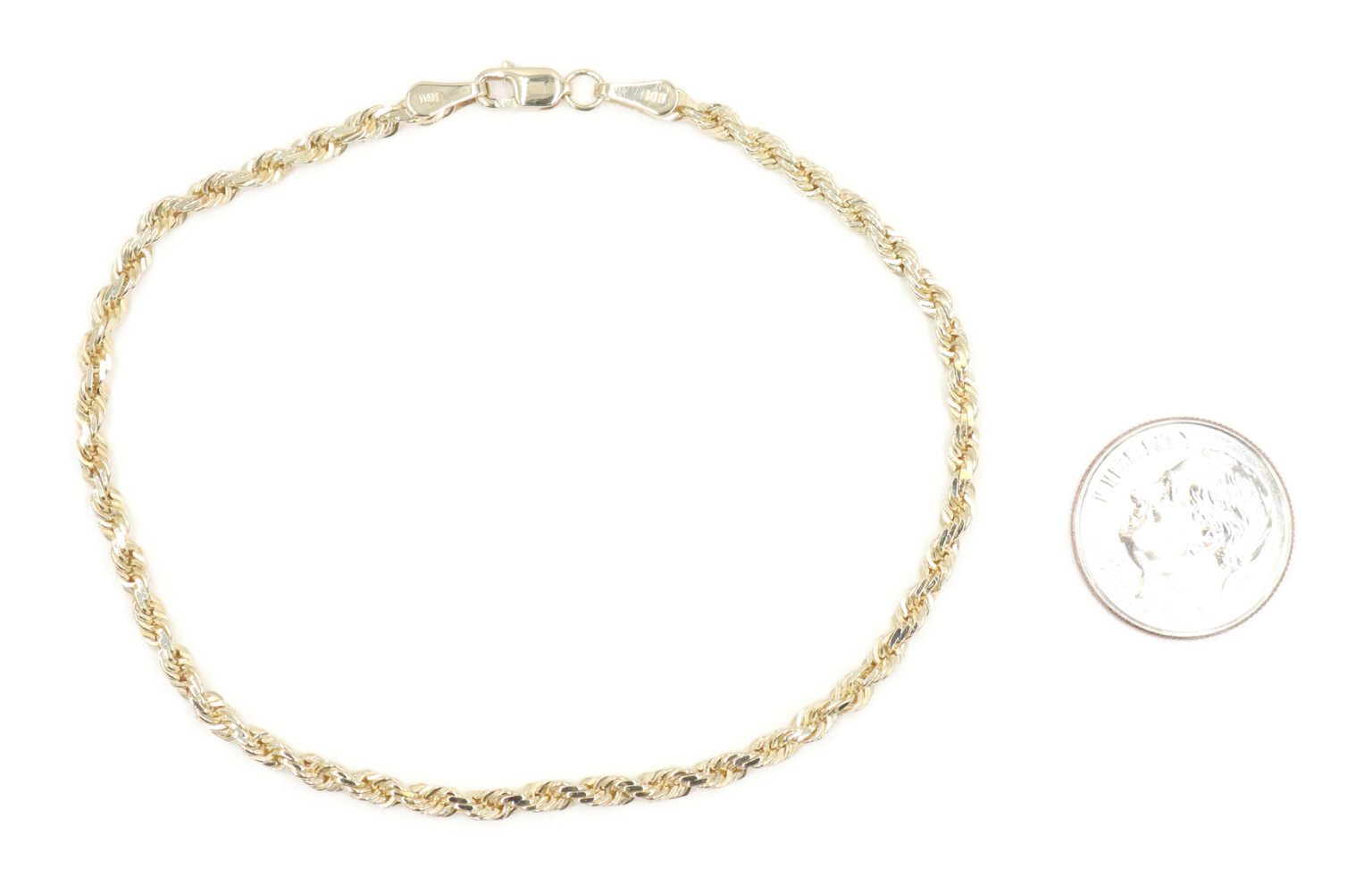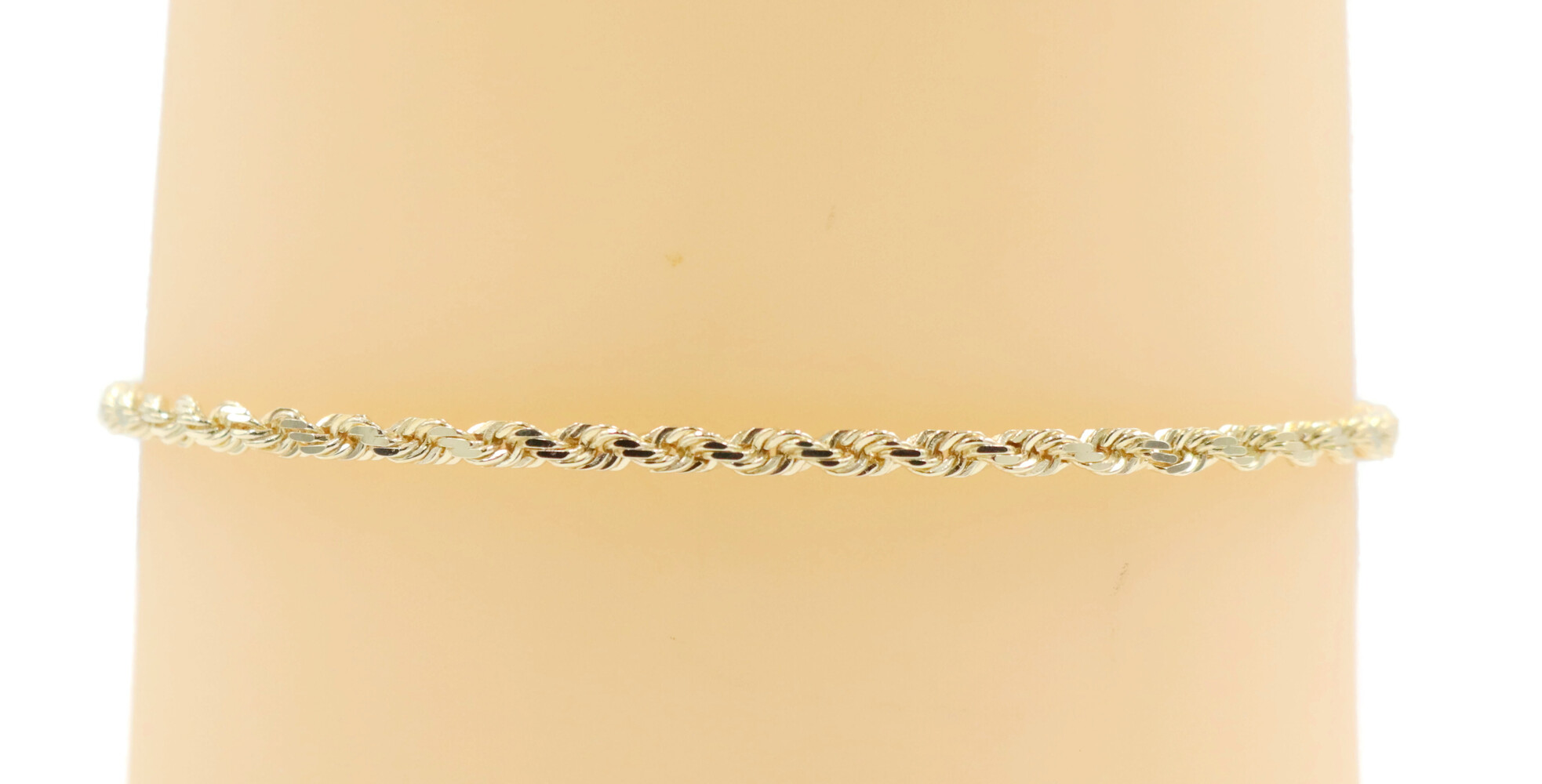 High Shine 10KT Yellow Gold 2.8mm Wide Semi-Hollow Rope Chain Bracelet 8" - 4.8g. This bracelet is approximately 8 inches in length and 2.8mm in width.