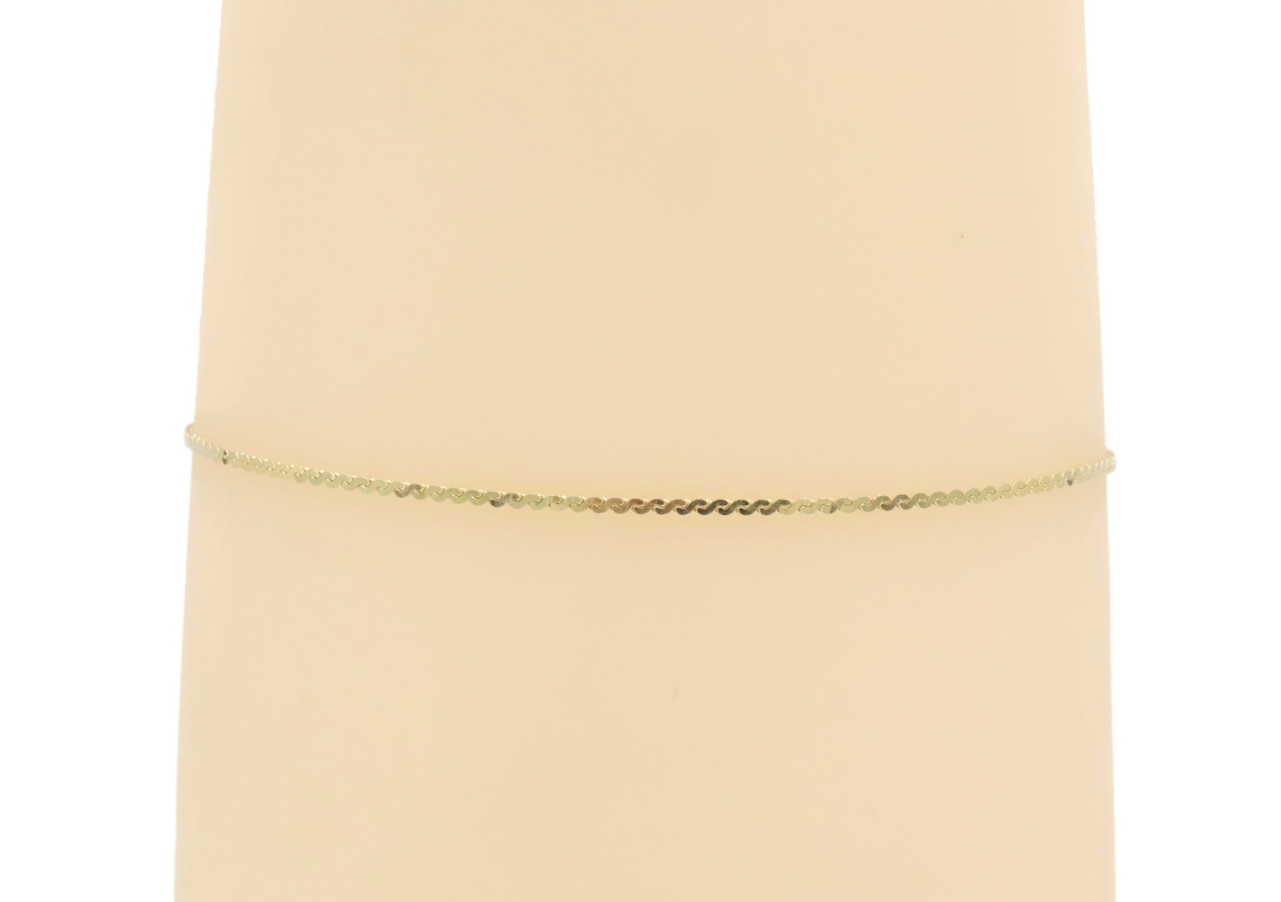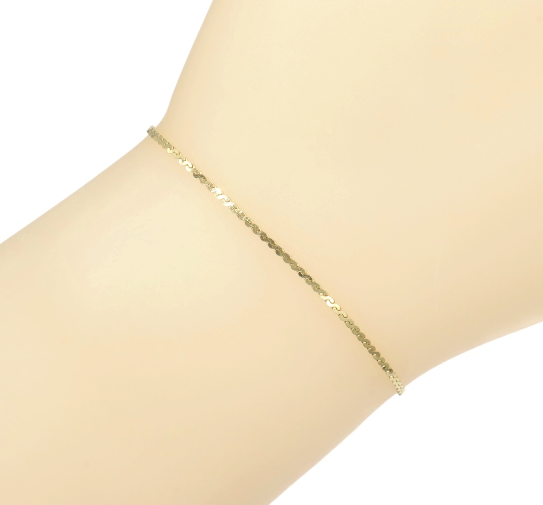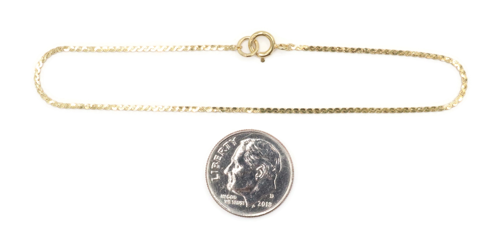 High Shine 14KT Yellow Gold 1.1mm Classic Serpentine Chain Bracelet 7.5" - 1.20g. This bracelet is approximately 7 1/2 inches in length and 1.1mm in width.