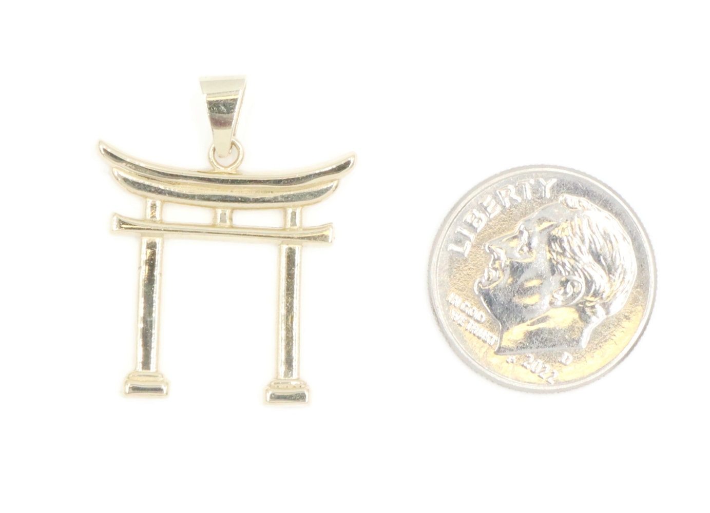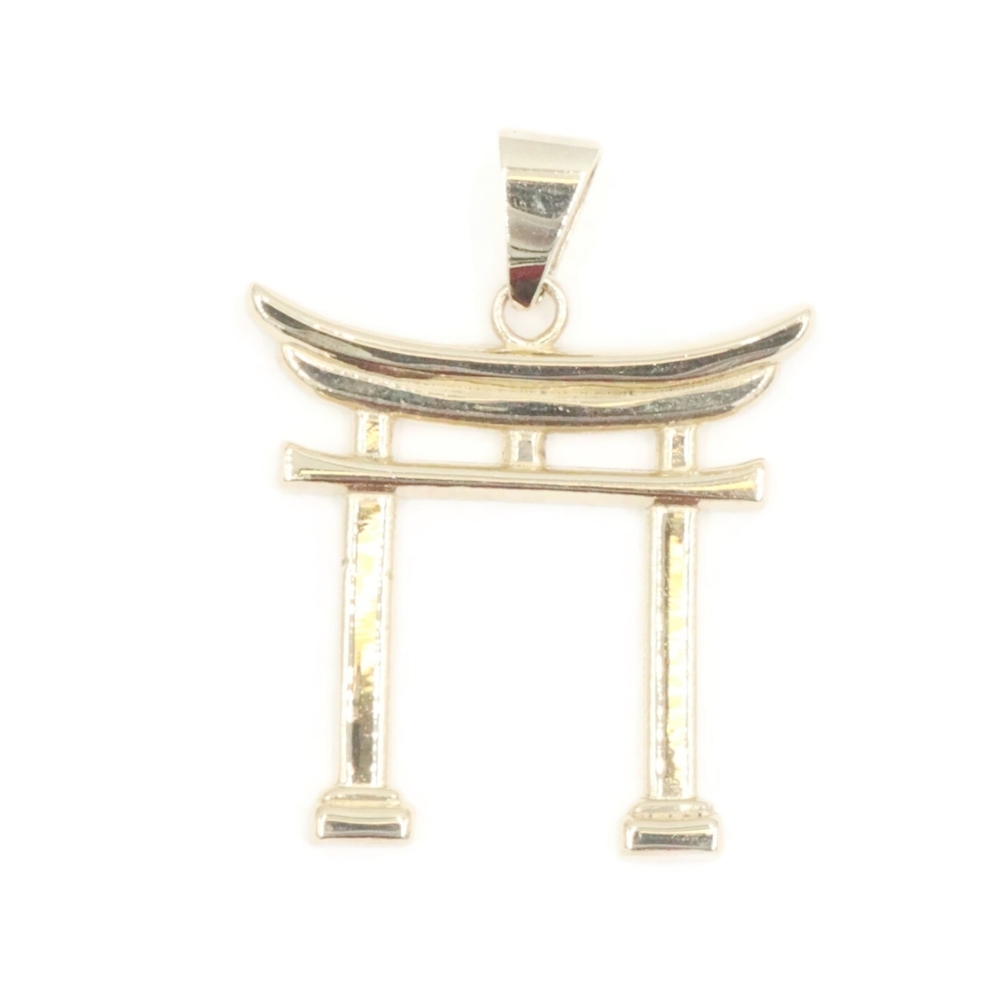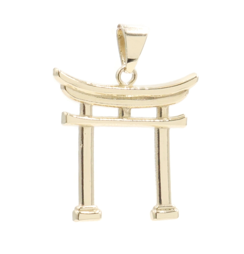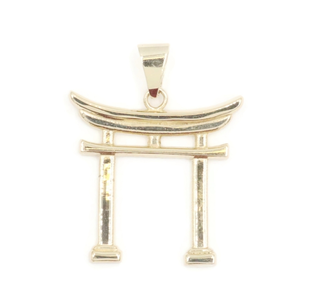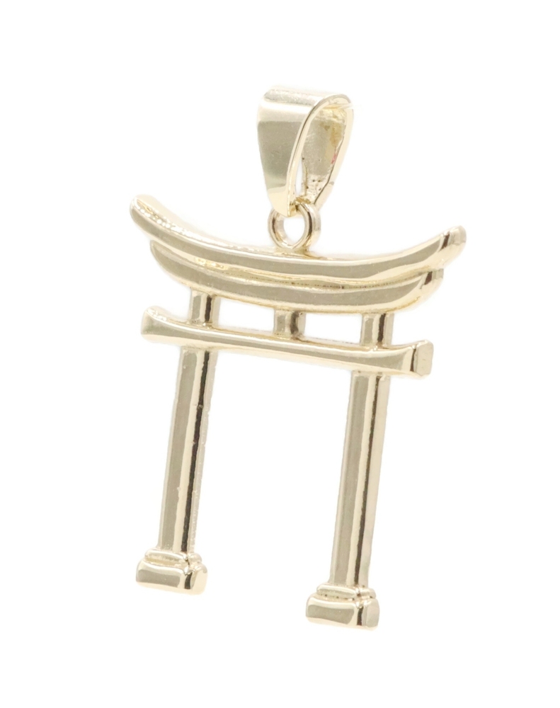 High Shine 14KT Yellow Gold 1" Japanese Torii Gate Shinto Necklace Pendant - 2g. This pendant is approximately 26.1mm in length (including the bail) and 20.3mm in width.