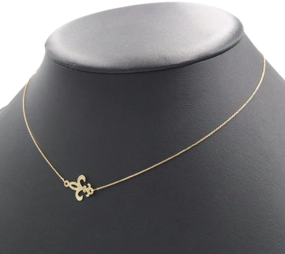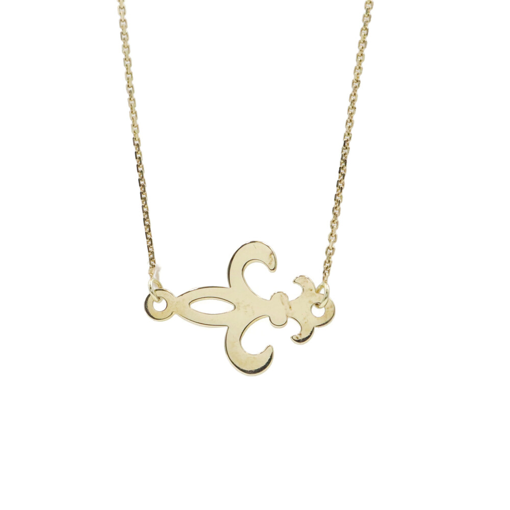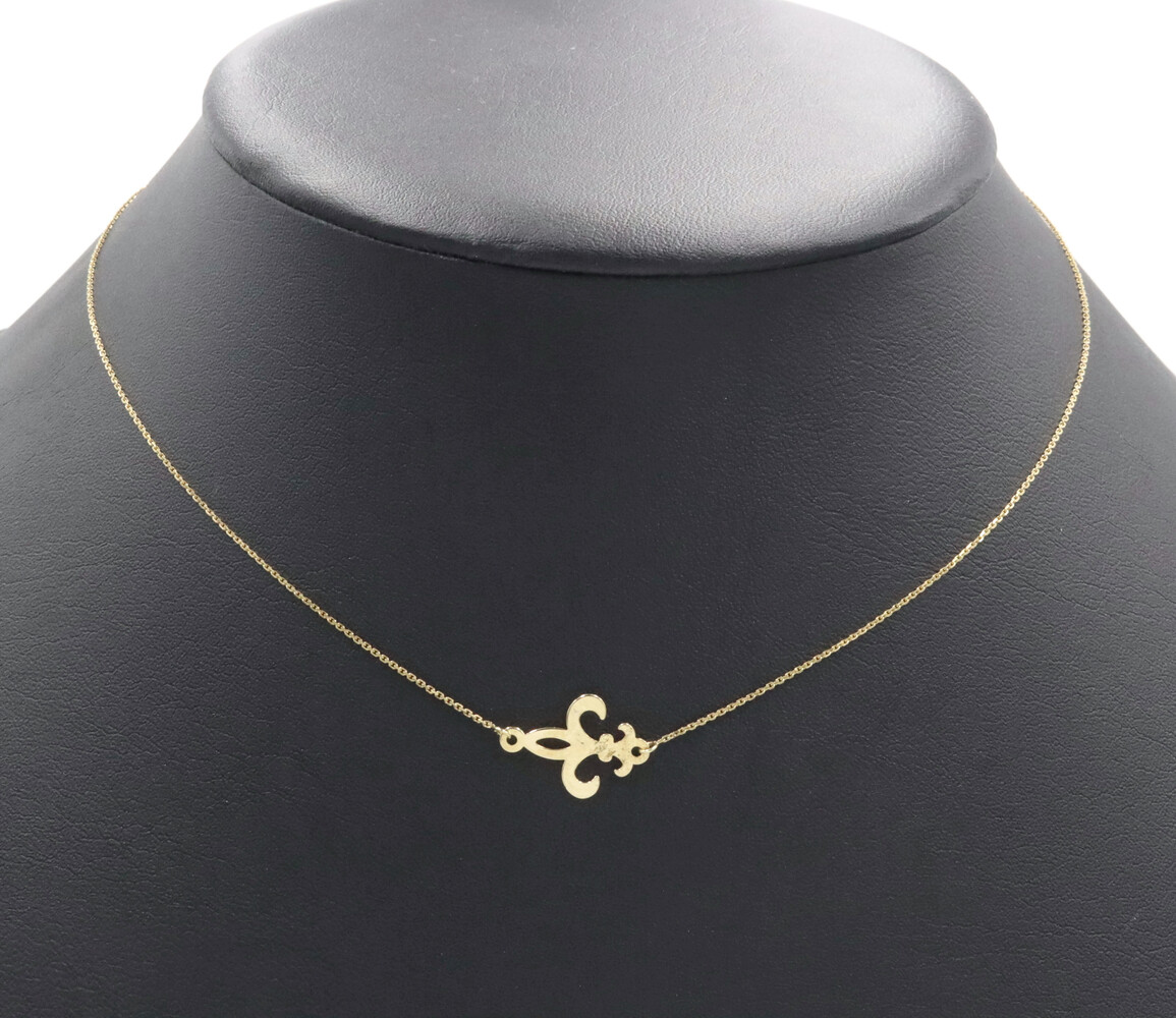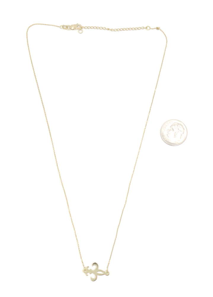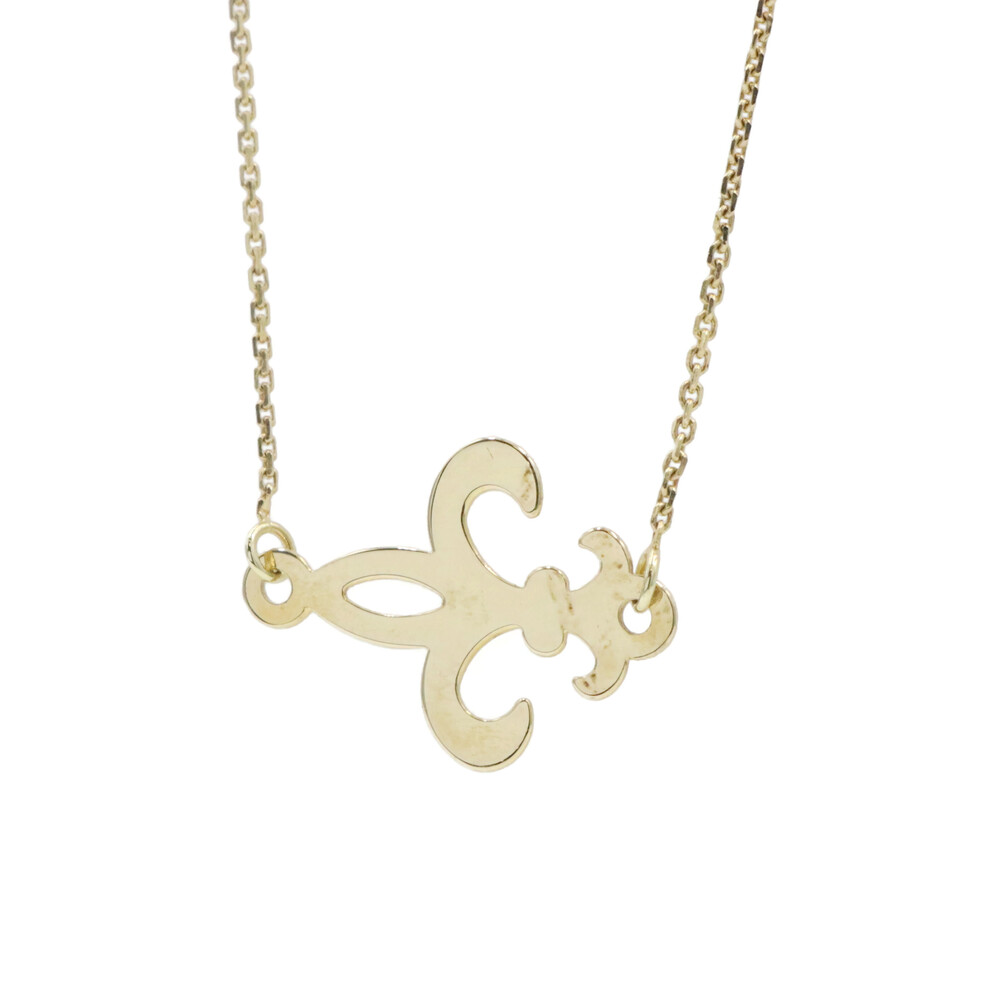 High Shine 14KT Yellow Gold 17mm Fleur-De-Lis Adjustable 17 3/4" Necklace - 1.8g. This fixed fleur-de-lis pendant is approximately 12mm in length and 17mm in width. The length of this necklace is adjustable between 15 inches and 17 3/4 inches.