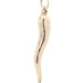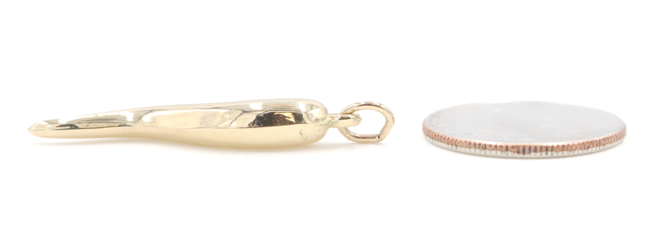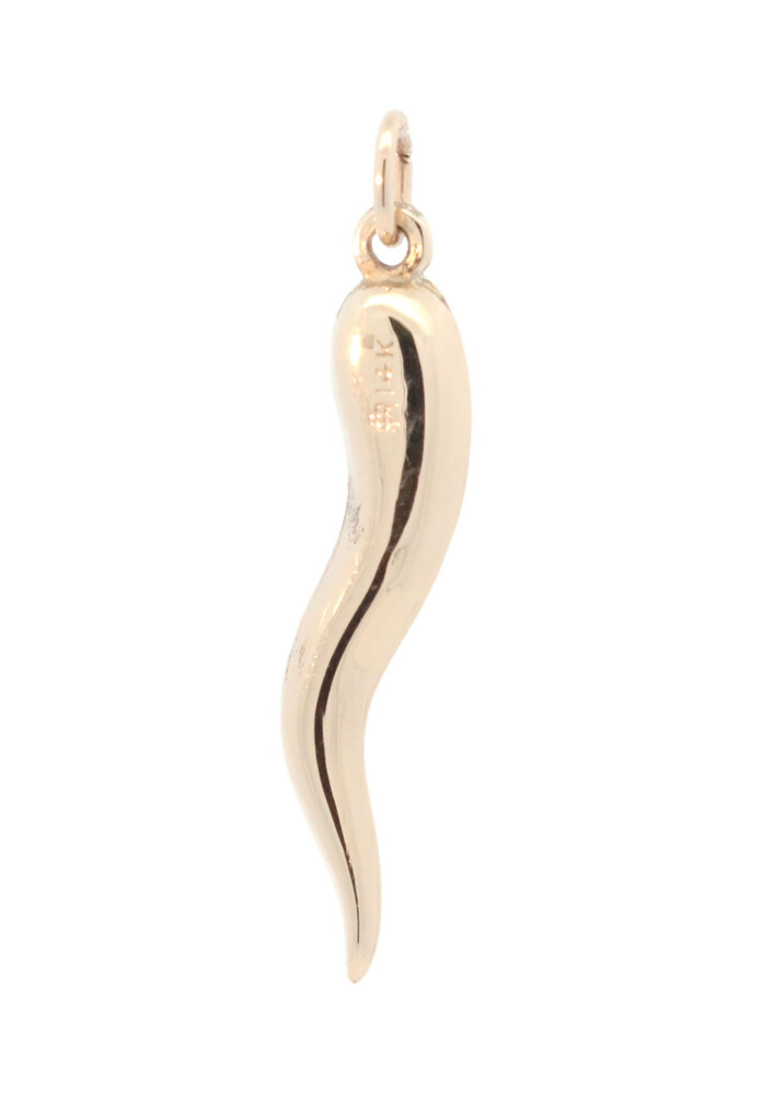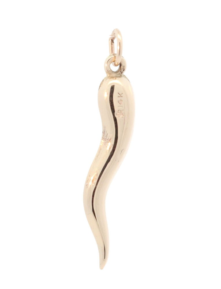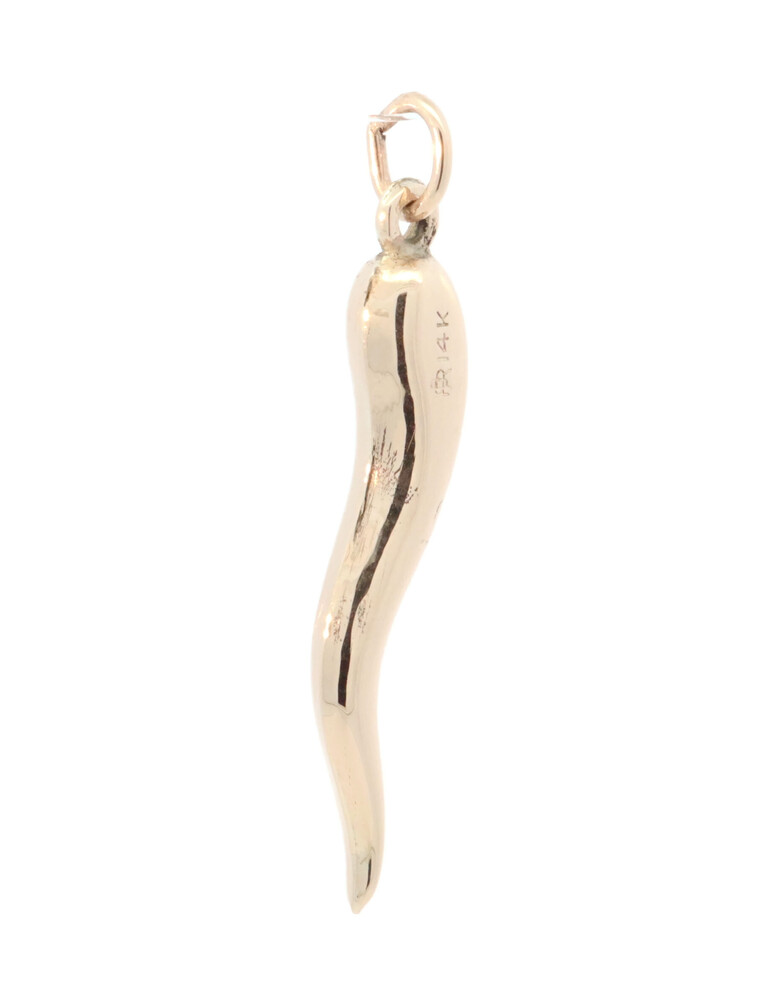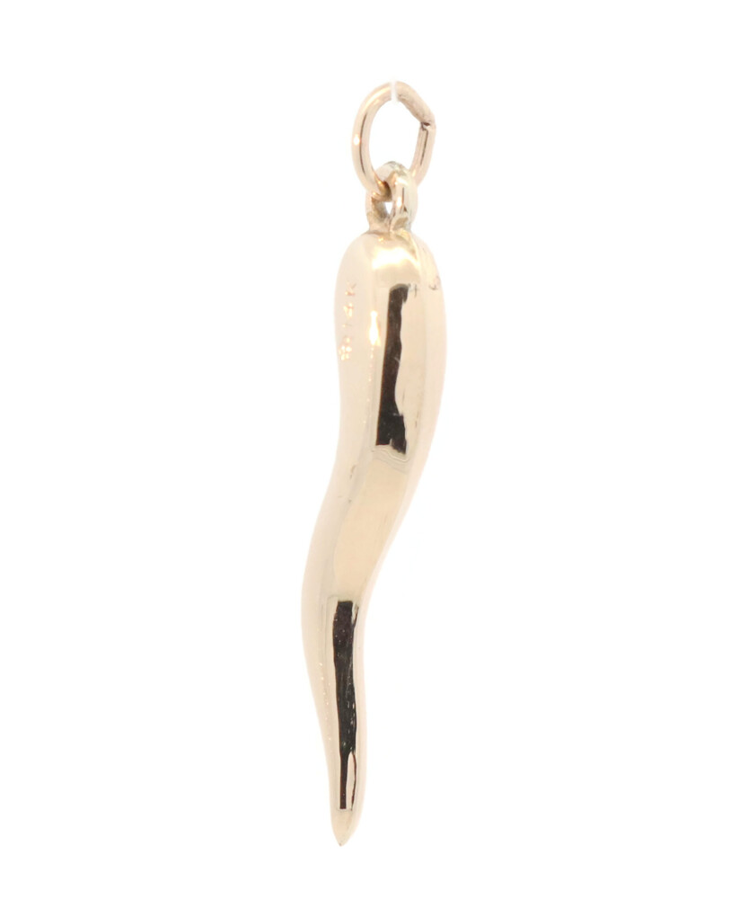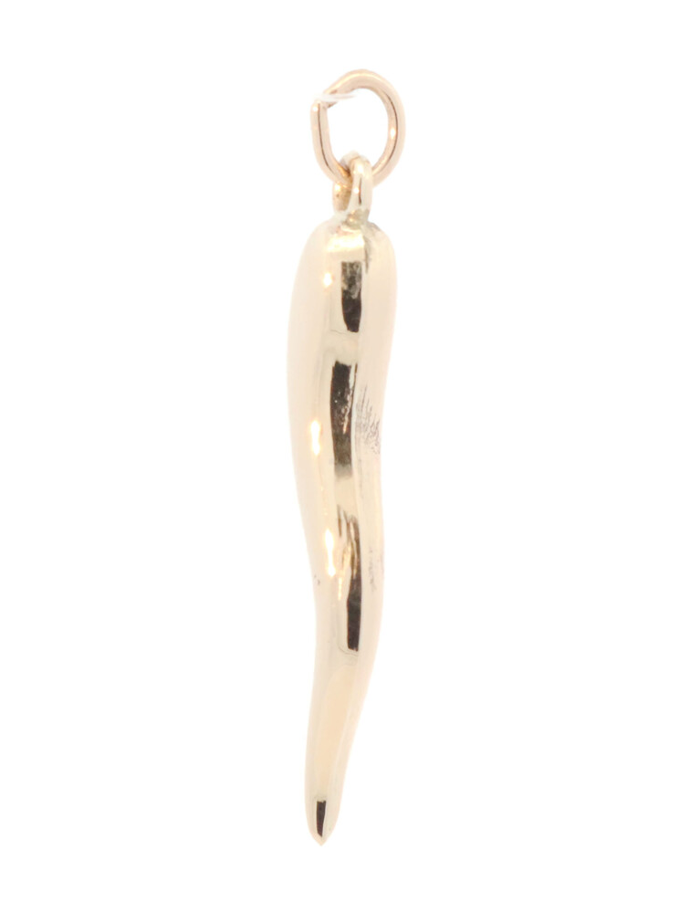 High Shine 14KT Yellow Gold 32.6mm Classic Italian Horn Cornicello Pendant 0.62g. This pendant is approximately 32.6mm in length (including the bail) and 5.2mm in width.