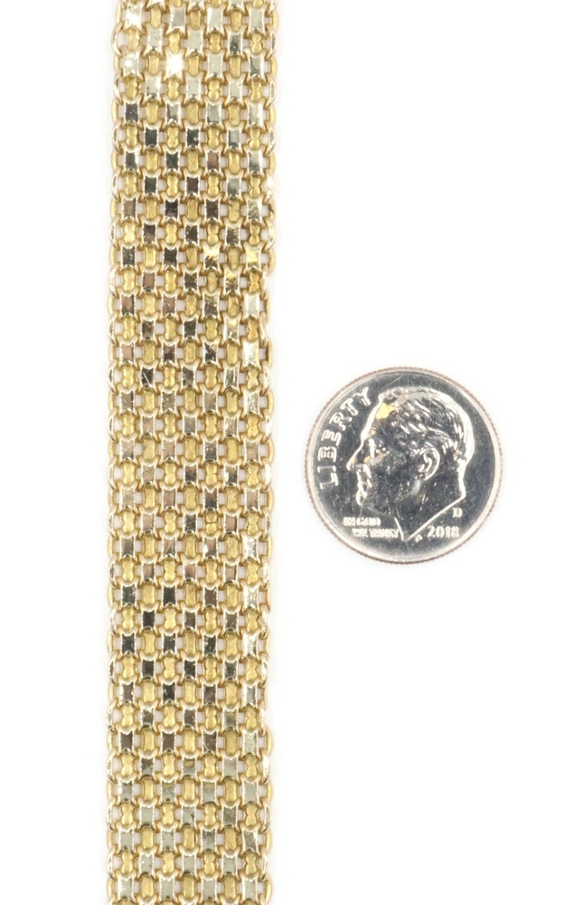 Italy 14KT Yellow Gold 14.7mm Wide Estate Bismark Mesh Chain Bracelet 8" 14.6g. This bracelet is approximately 8 inches in length and 14.7mm in width.