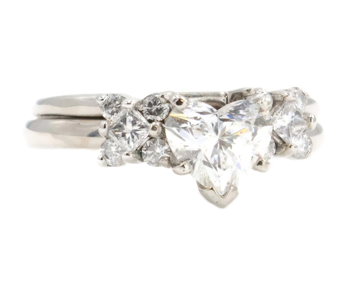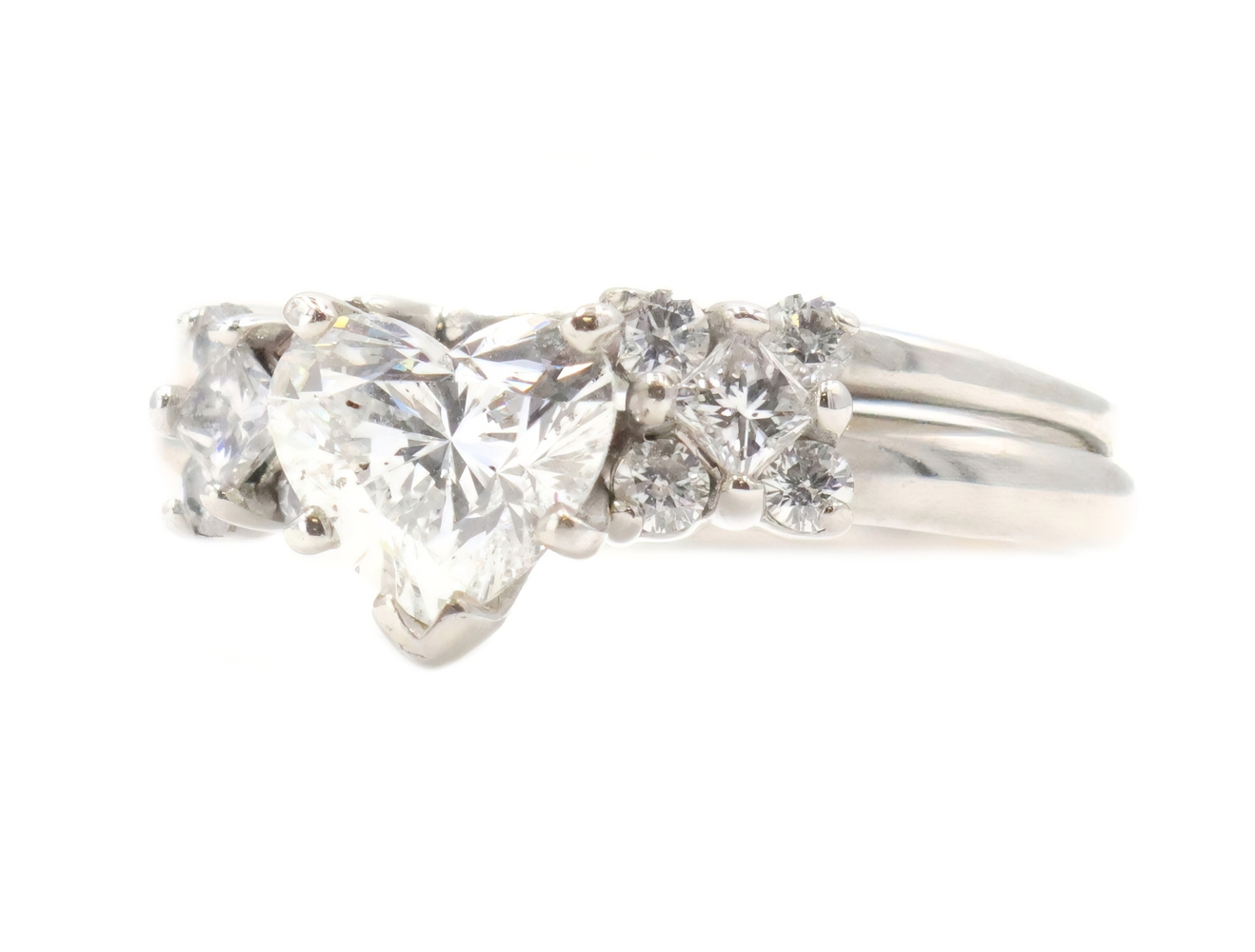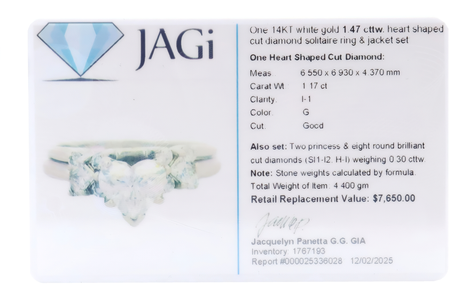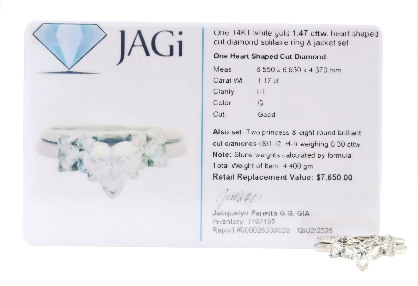 JAGi 1.47 Ctw Heart, Princess & Round Diamond 14KT Gold Soldered Engagement Ring. This ring is a size 8 and the bands have been soldered together. Featuring one beautiful heart-cut diamond in the center with a carat weight of 1.17 ct. This diamond has a clarity of I1, a color of G, and a good cut. This ring also features 2 princess-cut diamonds and 8 round brilliant-cut diamonds with a total carat weight of 0.30 ctw. These diamonds have a clarity range of SI1 to I2 and a color range of H to I. The total diamond carat weight of this ring is 1.47 ctw. This ring has been graded and certified by JAGi.
