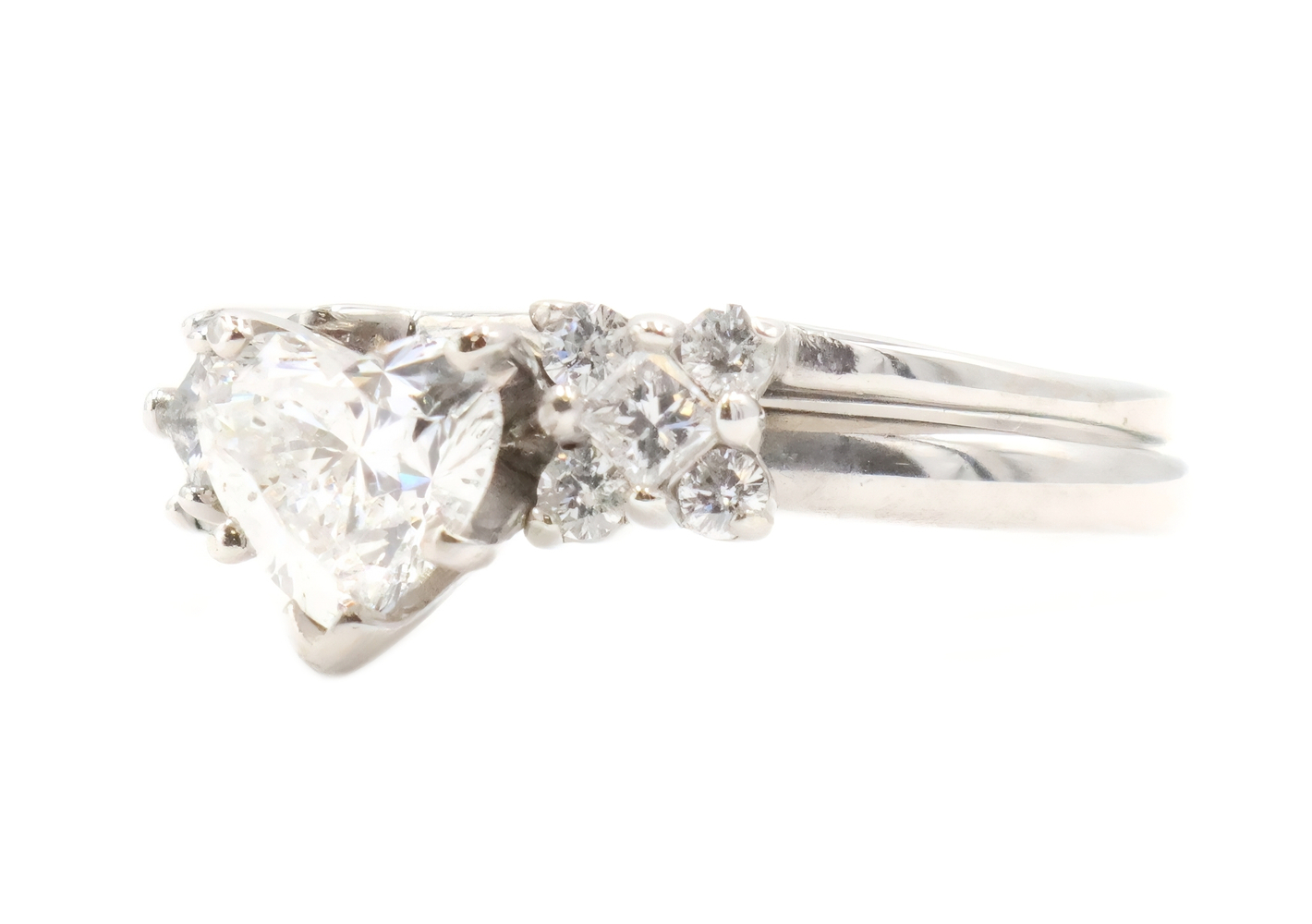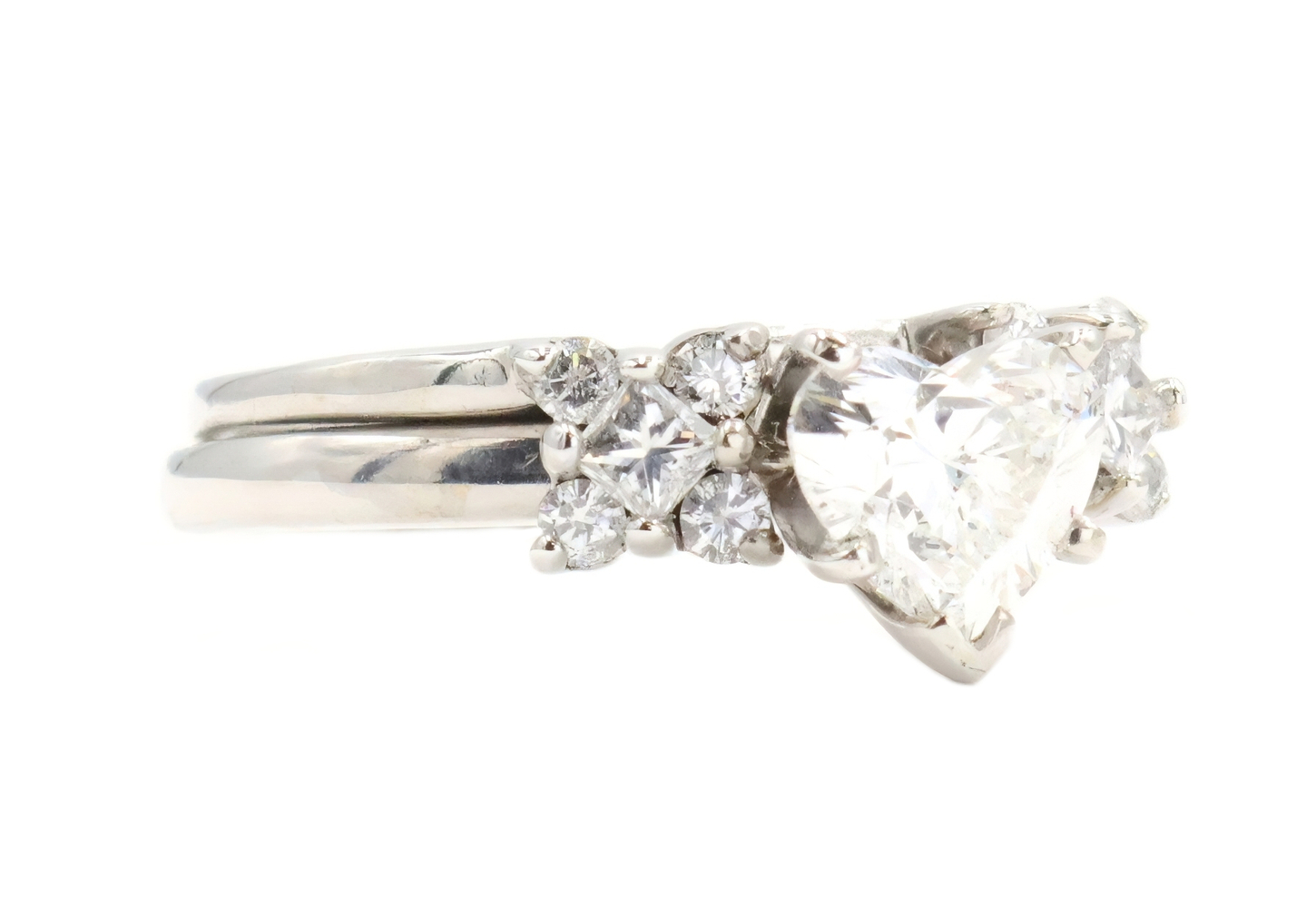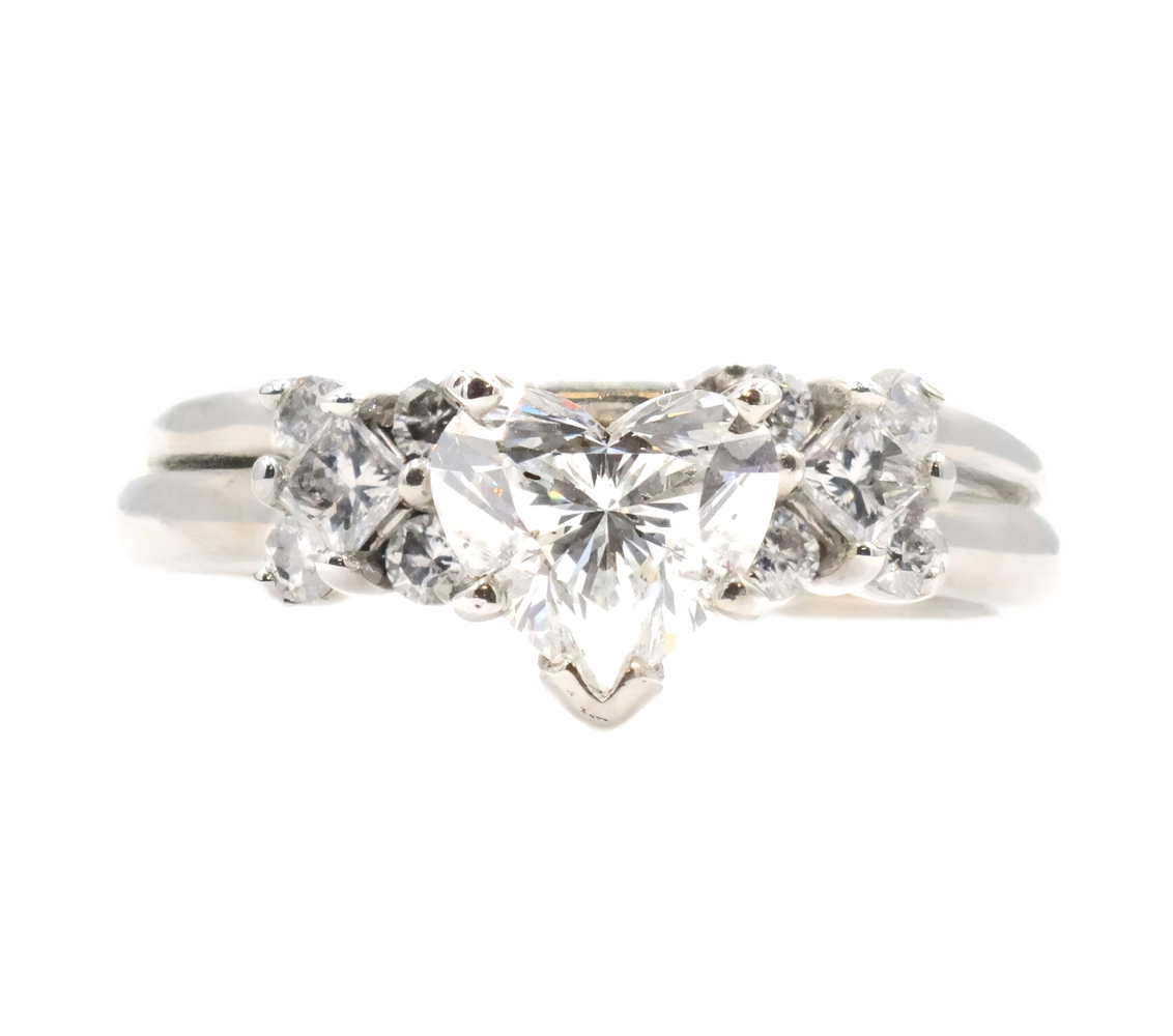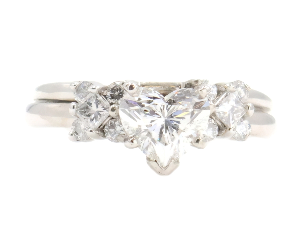JAGi 1.47 Ctw Heart, Princess & Round Diamond 14KT Gold Soldered Engagement Ring. This ring is a size 8 and the bands have been soldered together. Featuring one beautiful heart-cut diamond in the center with a carat weight of 1.17 ct. This diamond has a clarity of I1, a color of G, and a good cut. This ring also features 2 princess-cut diamonds and 8 round brilliant-cut diamonds with a total carat weight of 0.30 ctw. These diamonds have a clarity range of SI1 to I2 and a color range of H to I. The total diamond carat weight of this ring is 1.47 ctw. This ring has been graded and certified by JAGi.