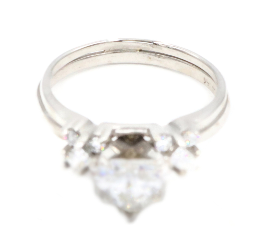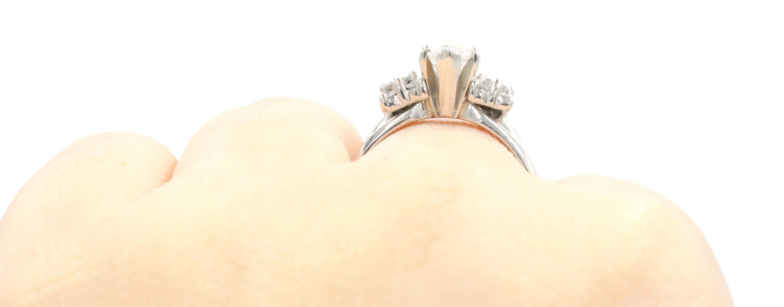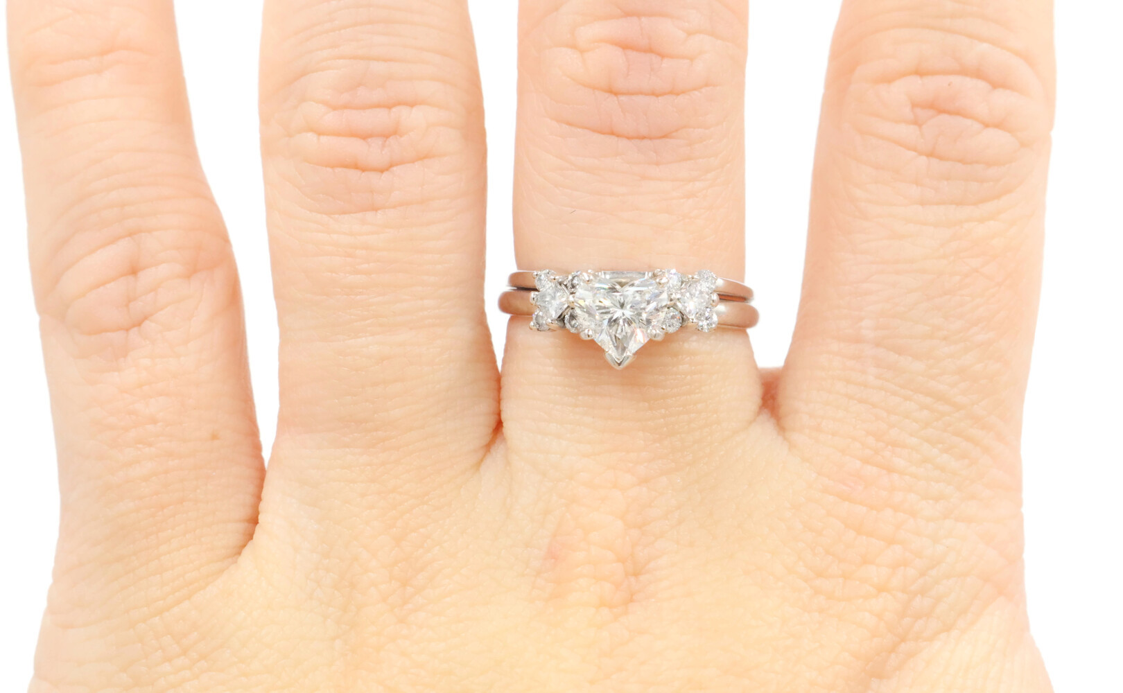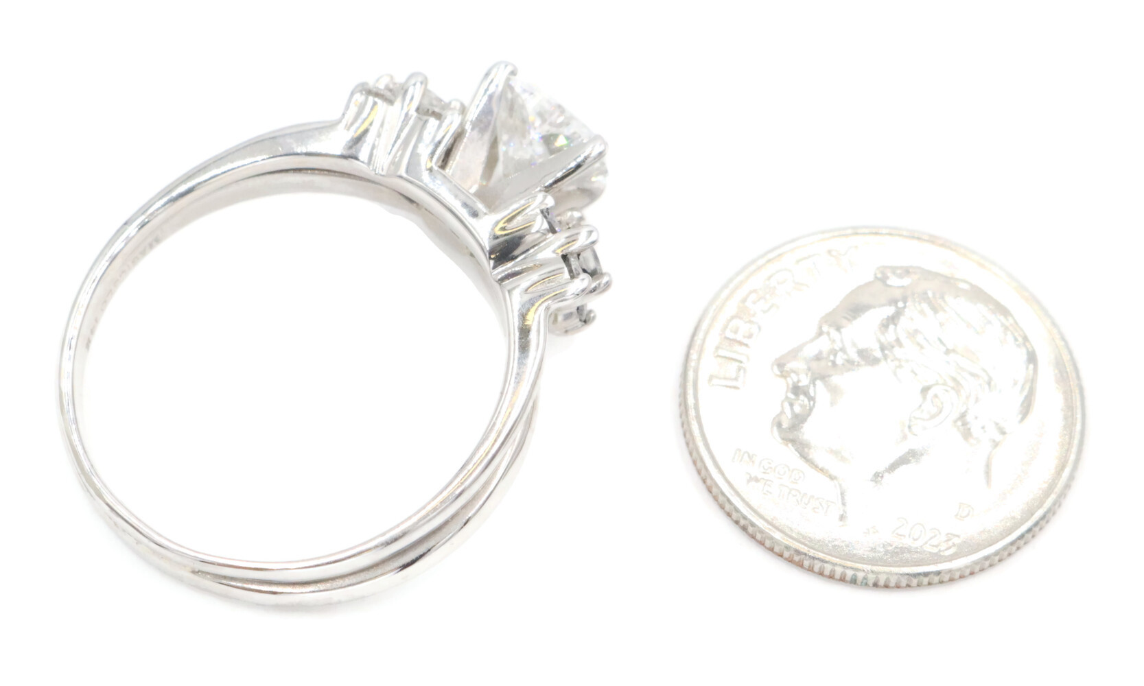 JAGi 1.47 Ctw Heart, Princess & Round Diamond 14KT Gold Soldered Engagement Ring. This ring is a size 8 and the bands have been soldered together. Featuring one beautiful heart-cut diamond in the center with a carat weight of 1.17 ct. This diamond has a clarity of I1, a color of G, and a good cut. This ring also features 2 princess-cut diamonds and 8 round brilliant-cut diamonds with a total carat weight of 0.30 ctw. These diamonds have a clarity range of SI1 to I2 and a color range of H to I. The total diamond carat weight of this ring is 1.47 ctw. This ring has been graded and certified by JAGi.