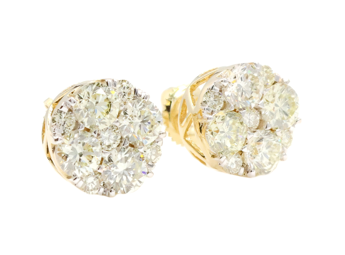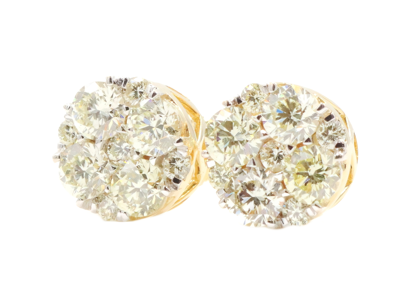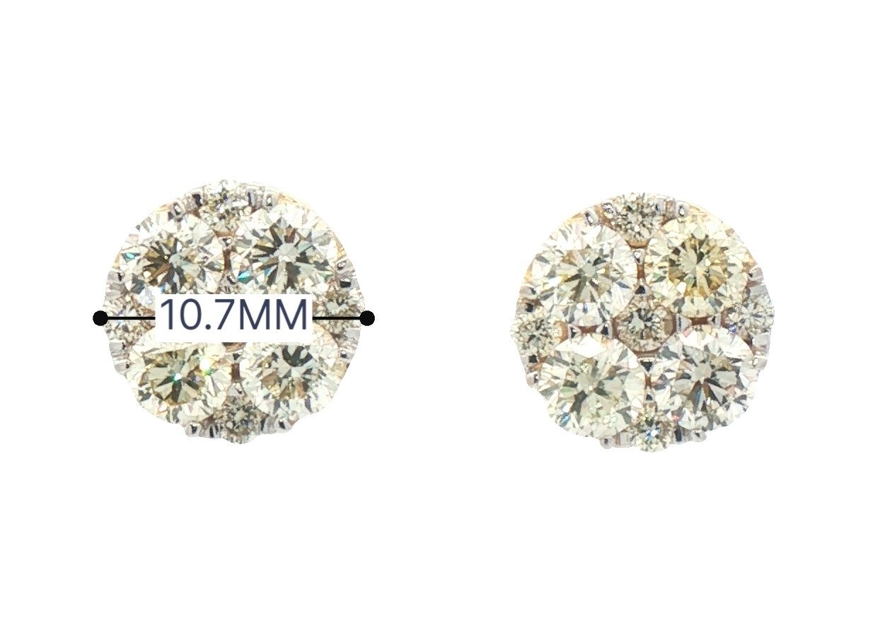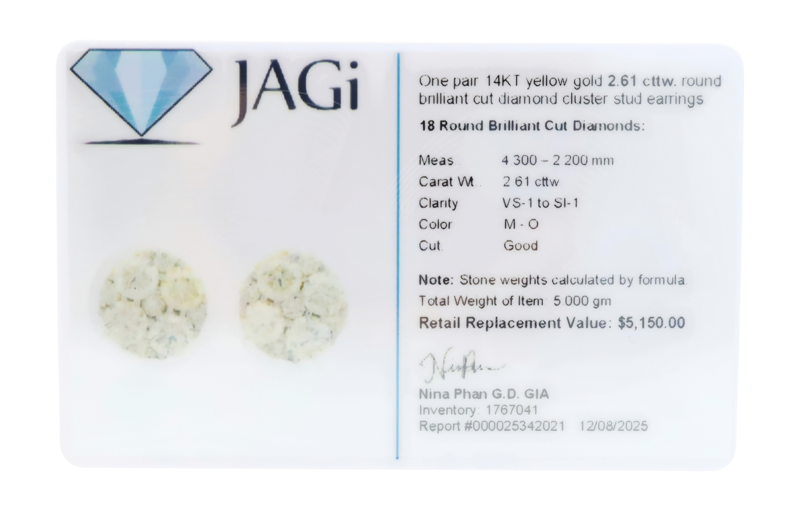 JAGi 2.61 Ctw Round Brilliant Cut Diamond Cluster 14KT Yellow Gold Stud Earrings. These earrings each have an approximate width of 10.7mm. Featuring 18 beautiful round brilliant cut diamonds with a total carat weight of 2.61 ctw. These diamonds have a clarity range of VS1 to SI1, a color range of M to O, and a good cut. These earrings have been graded and certified by JAGi.