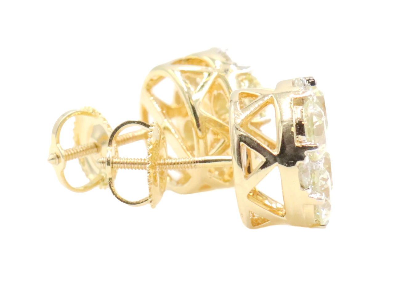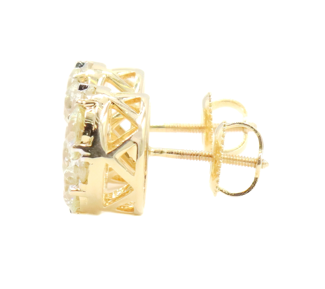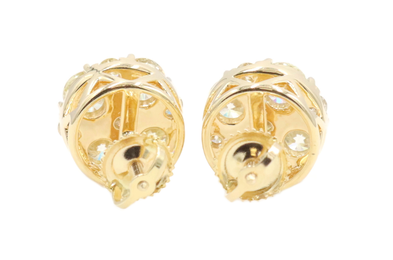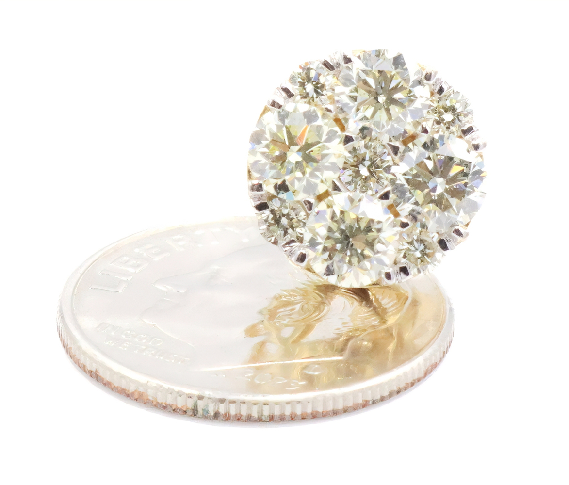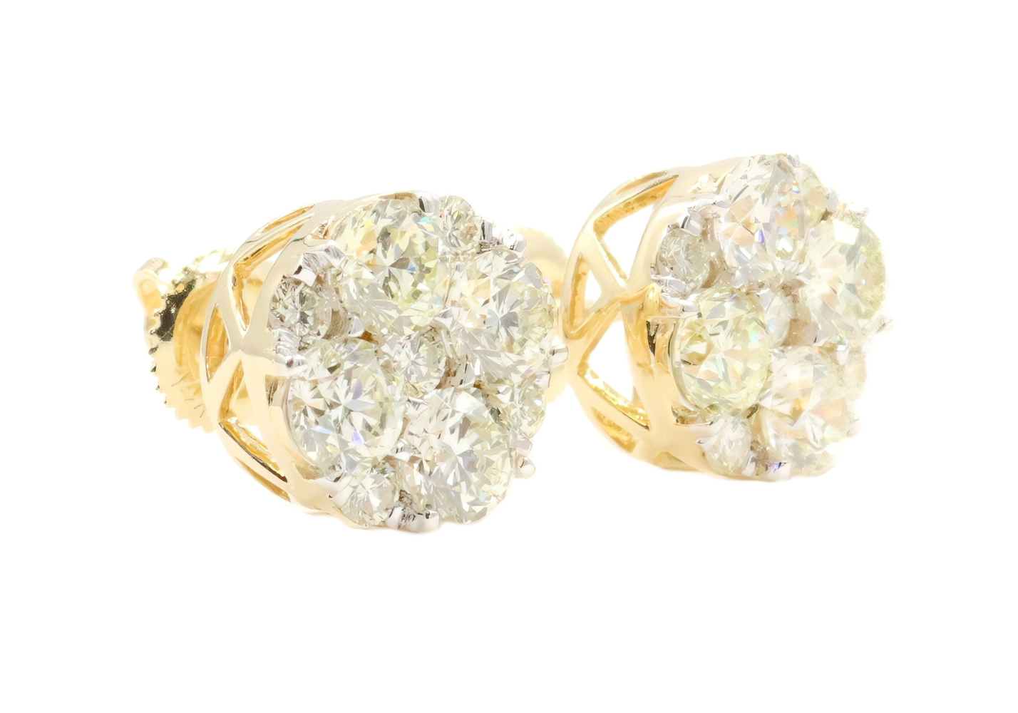 JAGi 2.61 Ctw Round Brilliant Cut Diamond Cluster 14KT Yellow Gold Stud Earrings. These earrings each have an approximate width of 10.7mm. Featuring 18 beautiful round brilliant cut diamonds with a total carat weight of 2.61 ctw. These diamonds have a clarity range of VS1 to SI1, a color range of M to O, and a good cut. These earrings have been graded and certified by JAGi.