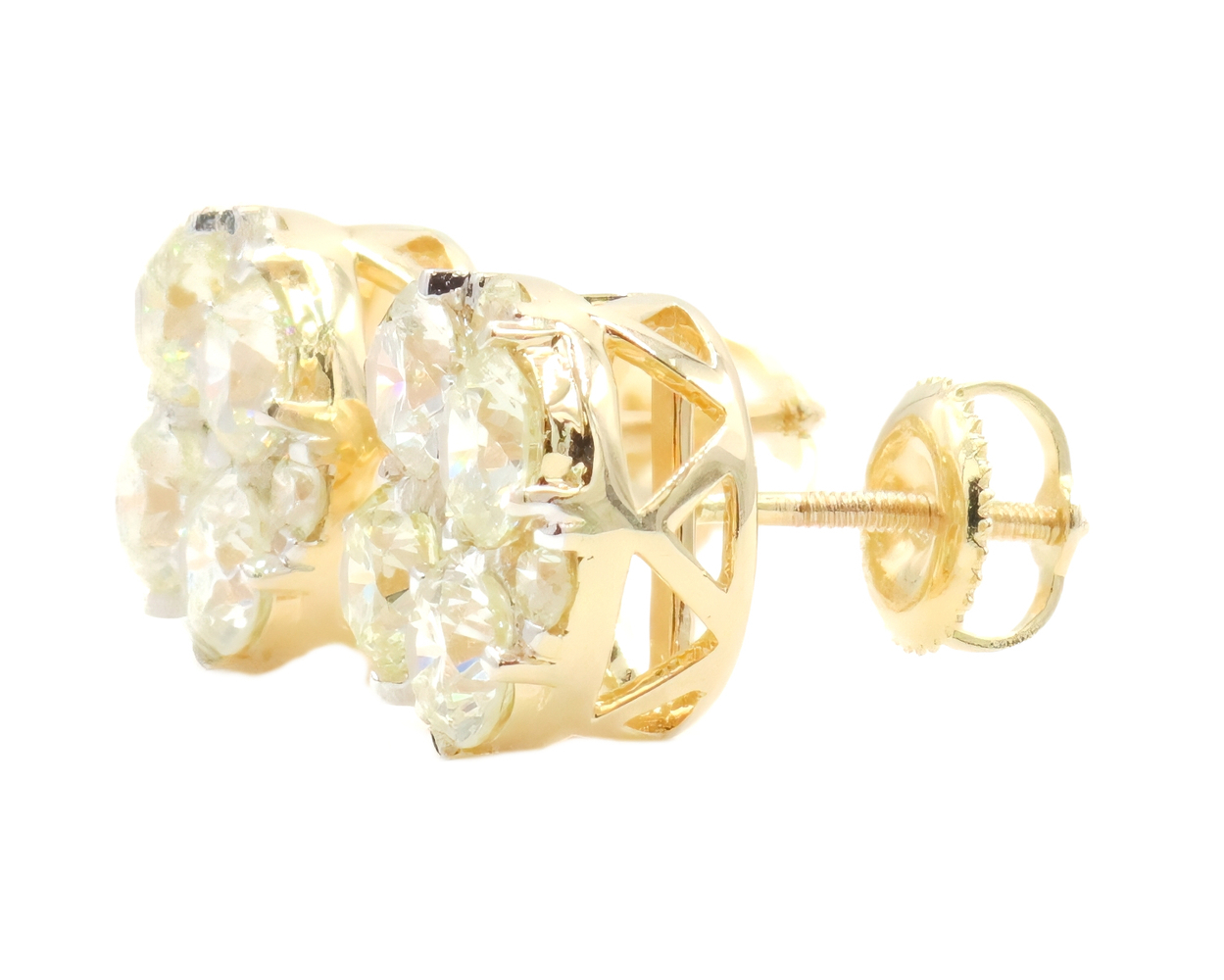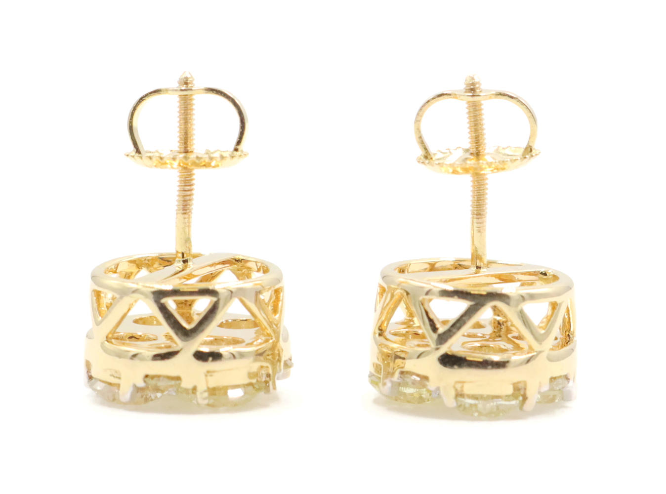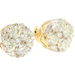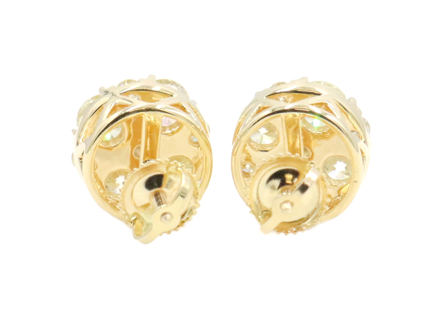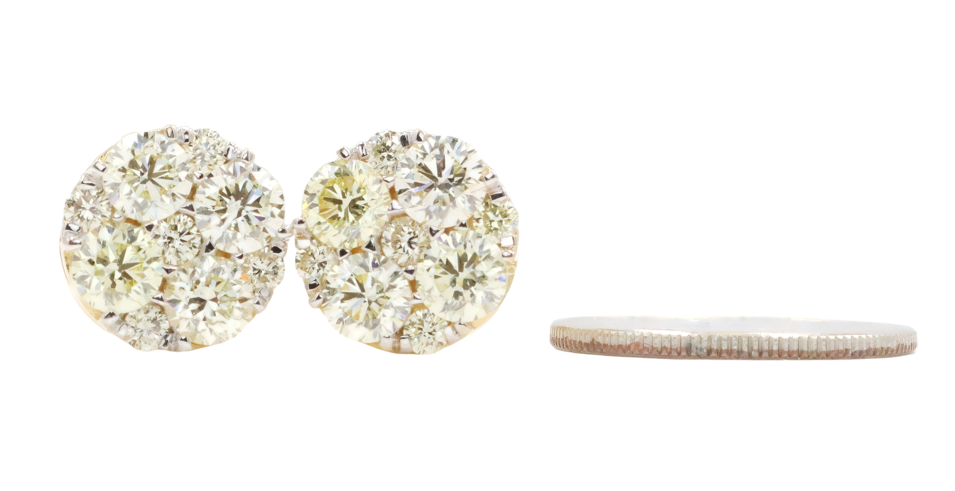 JAGi 2.61 Ctw Round Brilliant Cut Diamond Cluster 14KT Yellow Gold Stud Earrings. These earrings each have an approximate width of 10.7mm. Featuring 18 beautiful round brilliant cut diamonds with a total carat weight of 2.61 ctw. These diamonds have a clarity range of VS1 to SI1, a color range of M to O, and a good cut. These earrings have been graded and certified by JAGi.