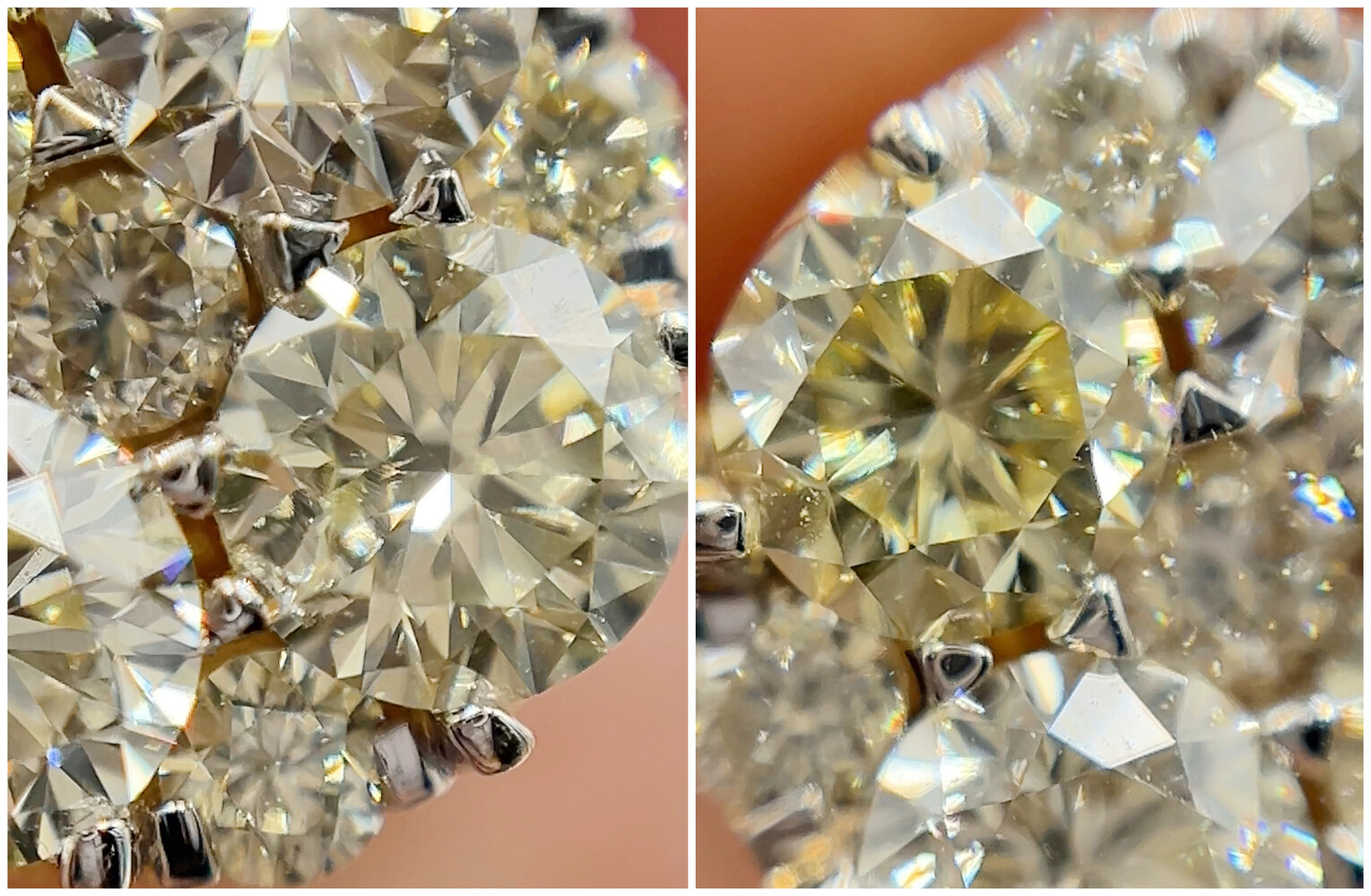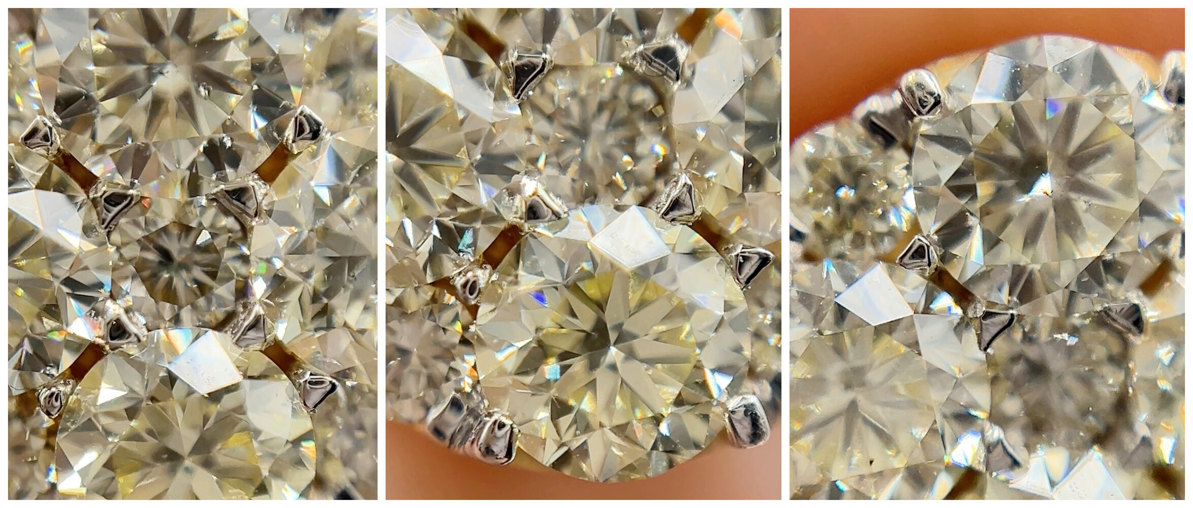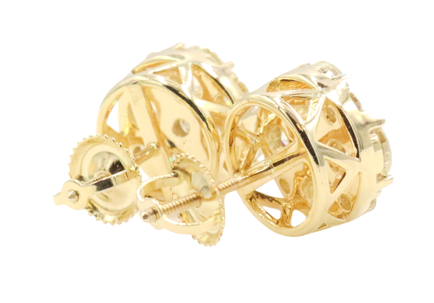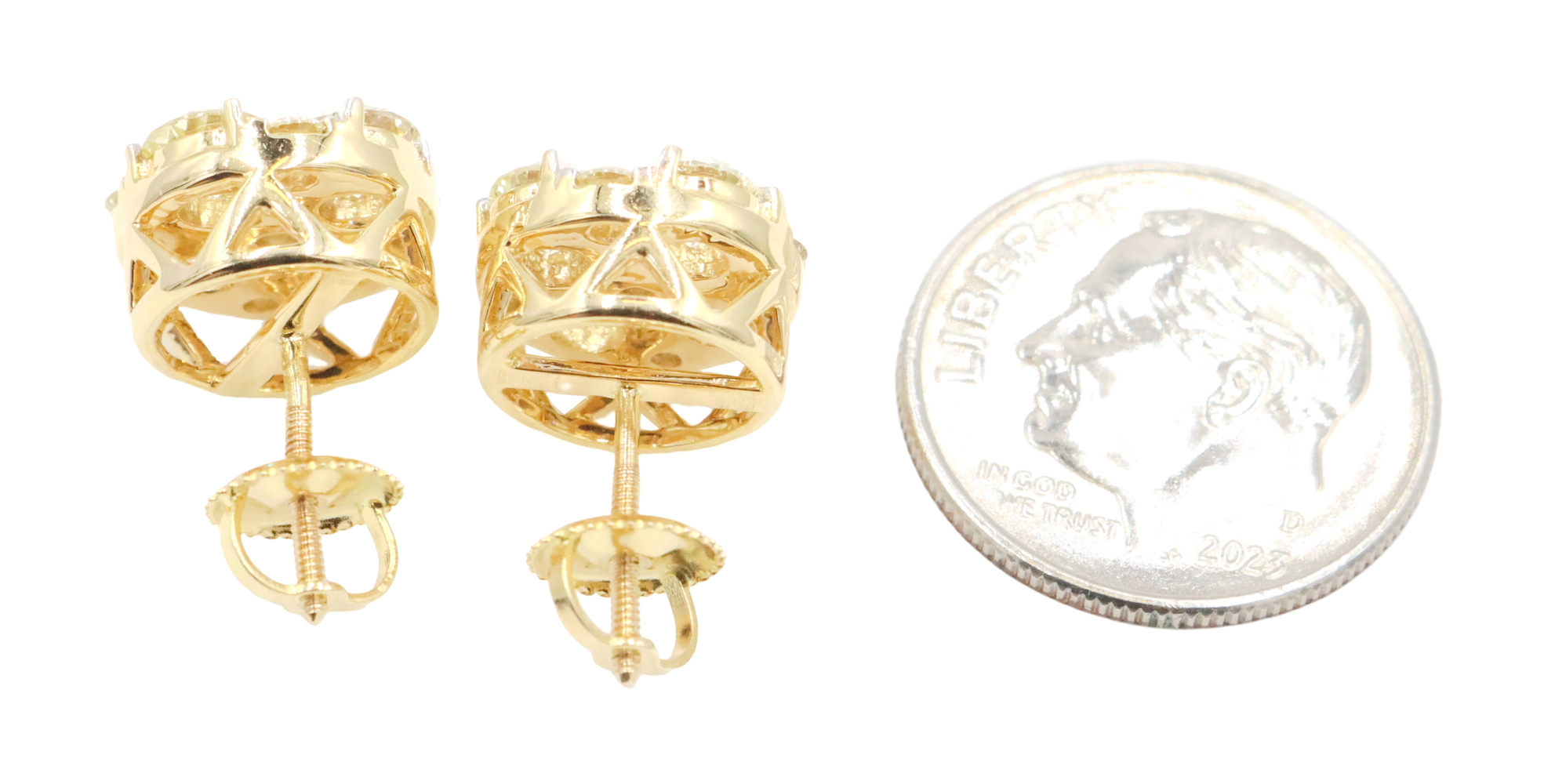JAGi 2.61 Ctw Round Brilliant Cut Diamond Cluster 14KT Yellow Gold Stud Earrings. These earrings each have an approximate width of 10.7mm. Featuring 18 beautiful round brilliant cut diamonds with a total carat weight of 2.61 ctw. These diamonds have a clarity range of VS1 to SI1, a color range of M to O, and a good cut. These earrings have been graded and certified by JAGi.
