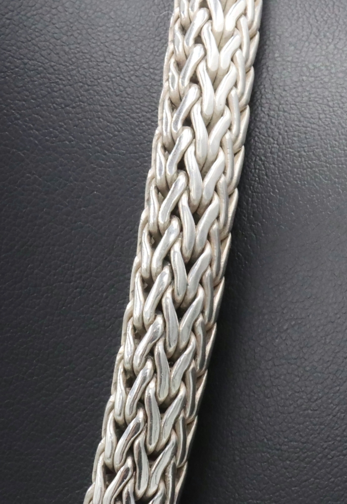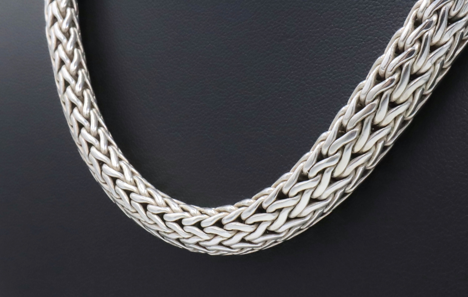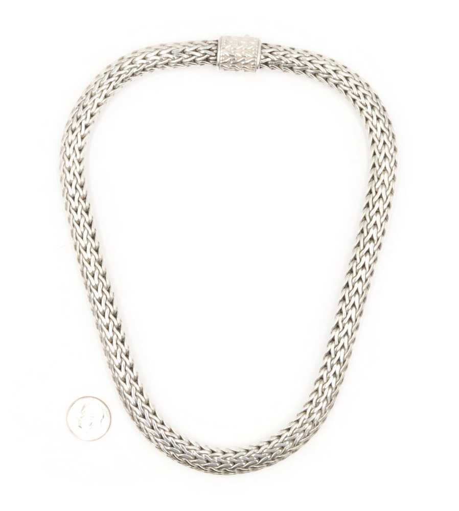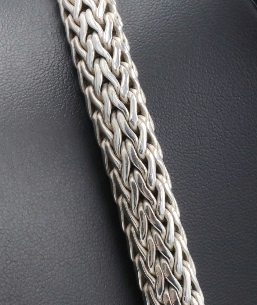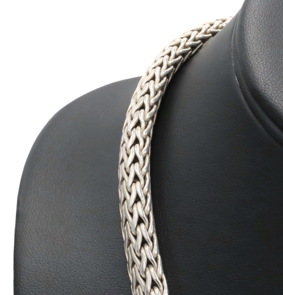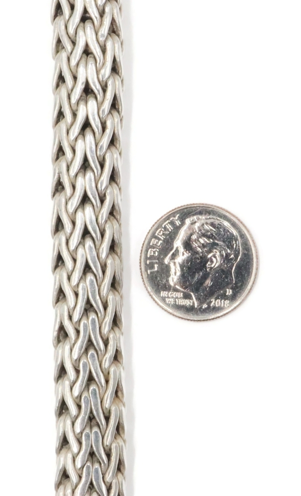 John Hardy Sterling Silver (925) 10.9mm Wide Woven Wheat Chain Necklace 18" 177g. This necklace is approximately 18 1/4 inches in length and 10.9mm in width.