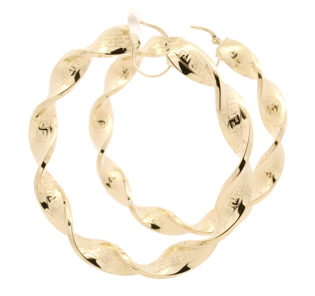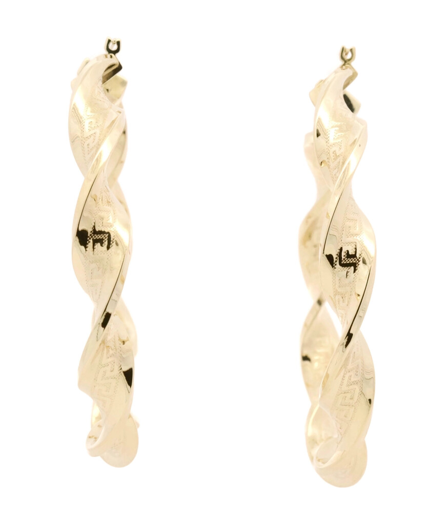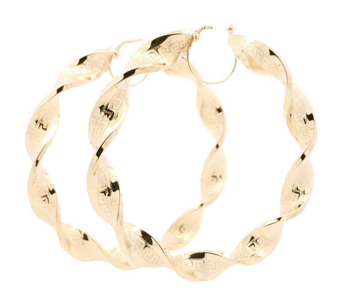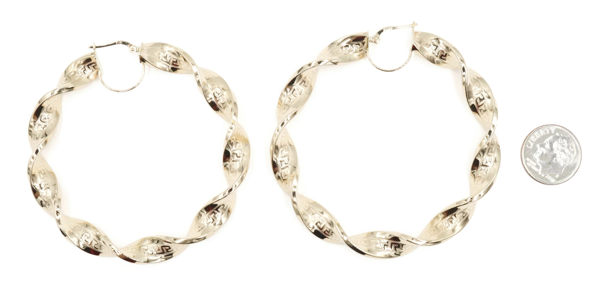 Large 2.5" Twisted 14KT Yellow Gold Round Hoop Earrings with Greek Key Detailing
