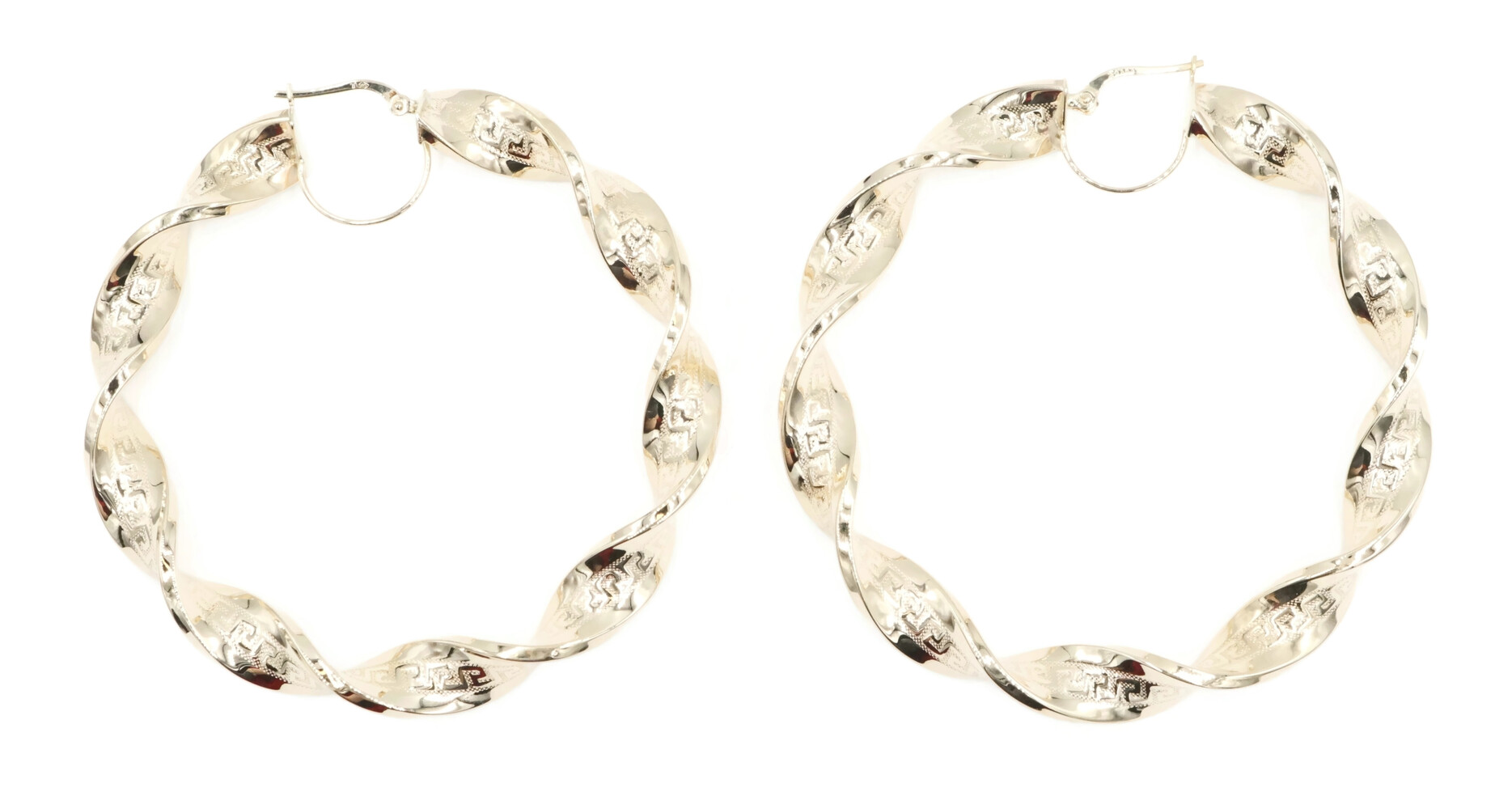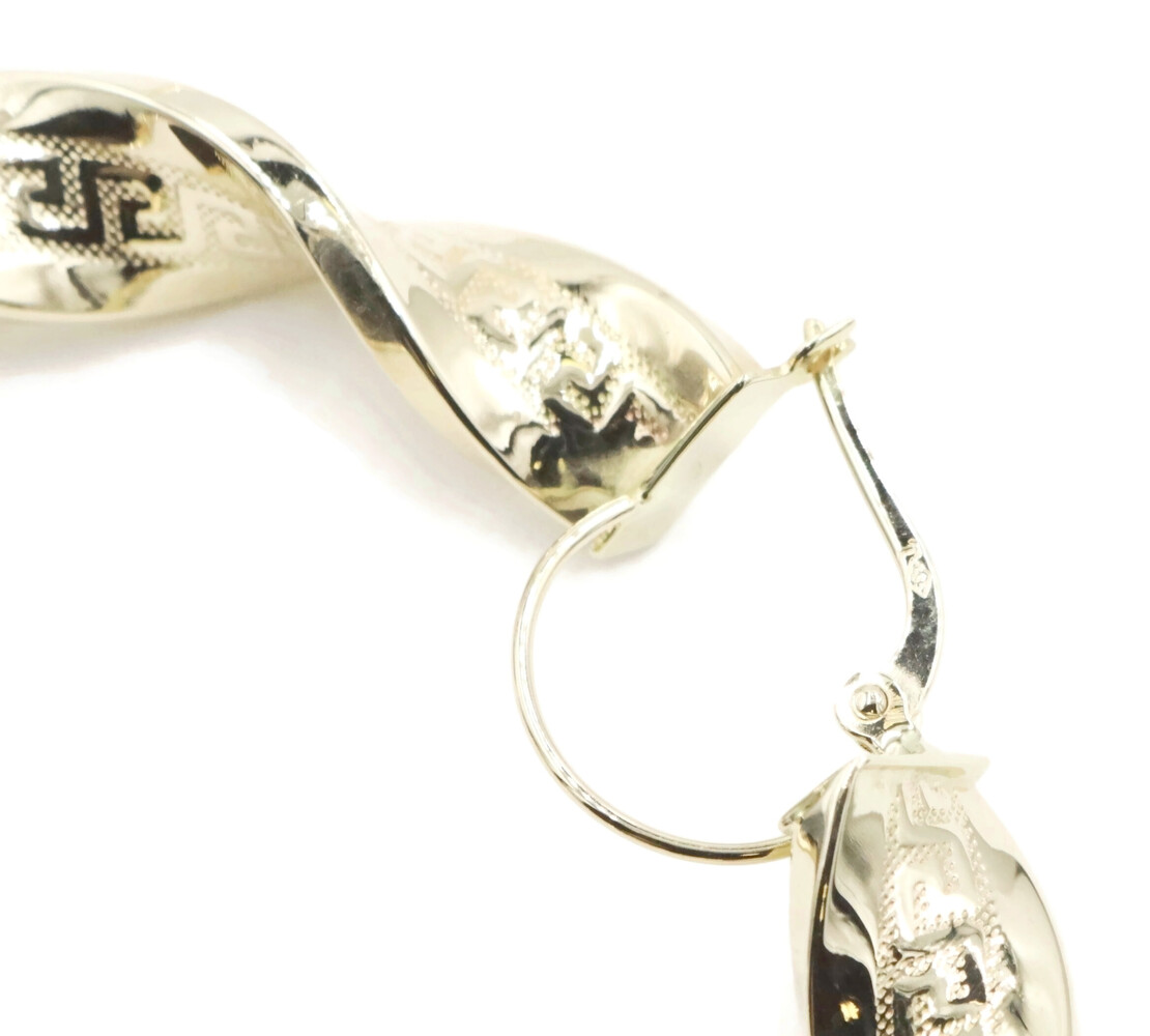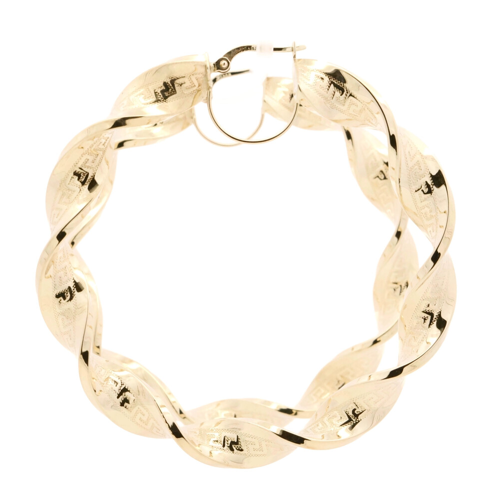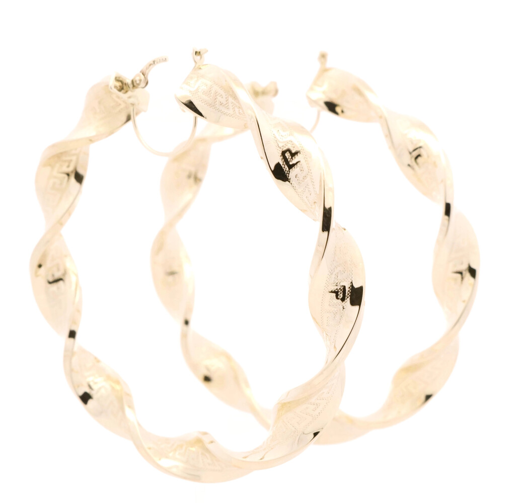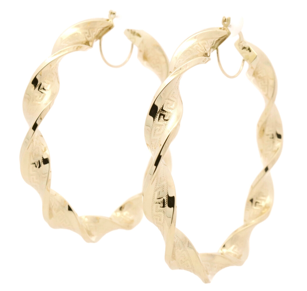 Large 2.5" Twisted 14KT Yellow Gold Round Hoop Earrings with Greek Key Detailing