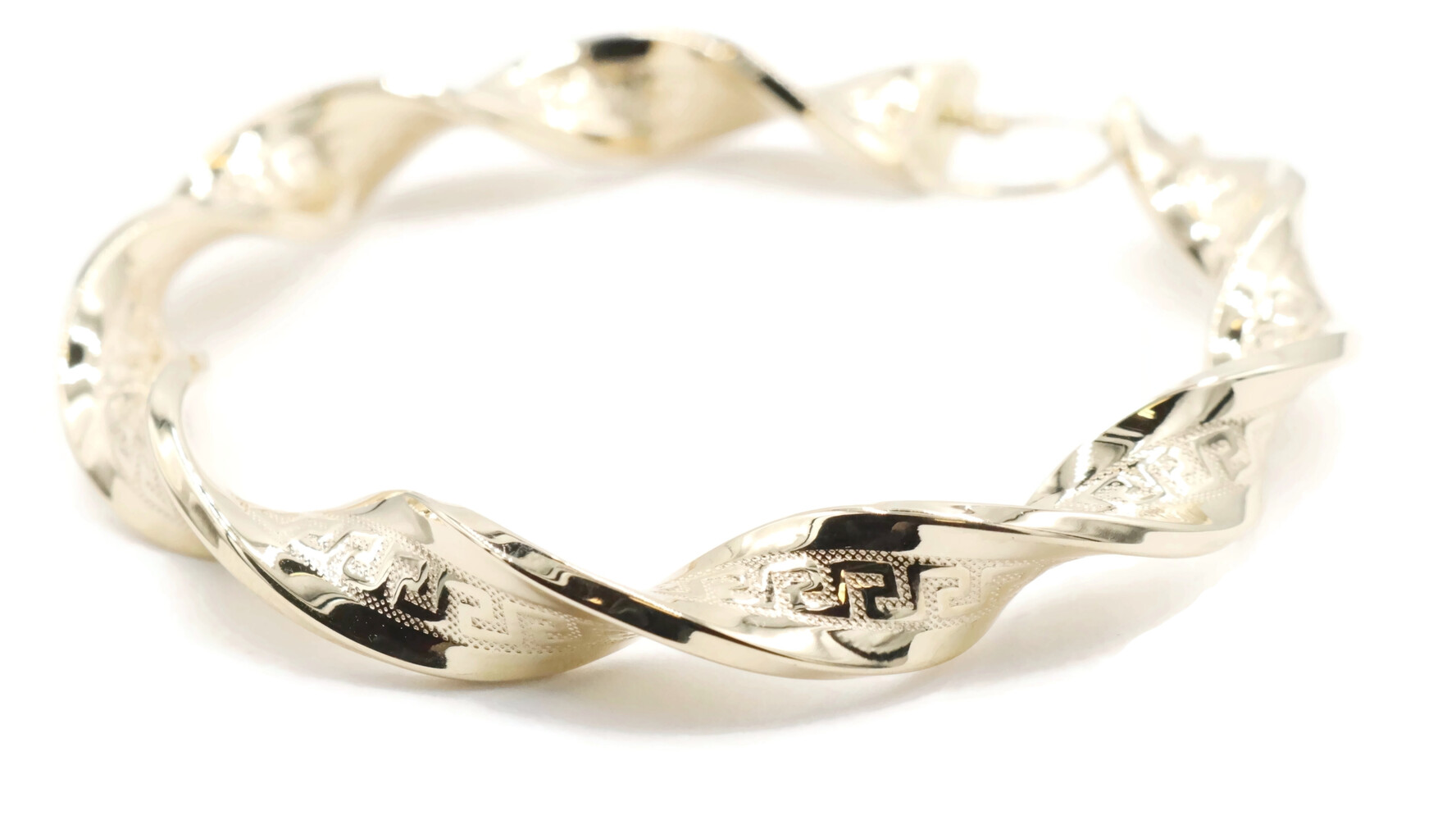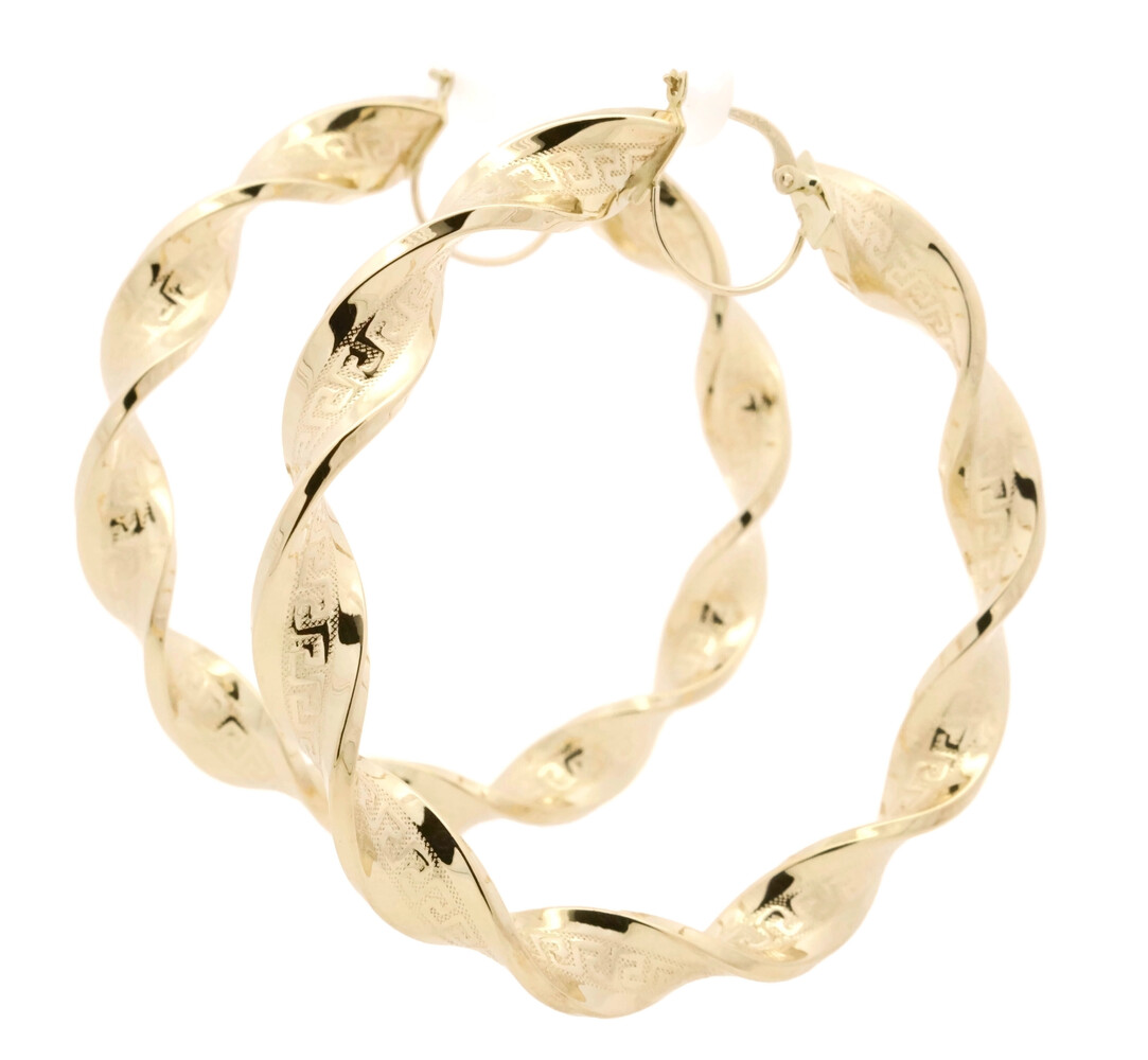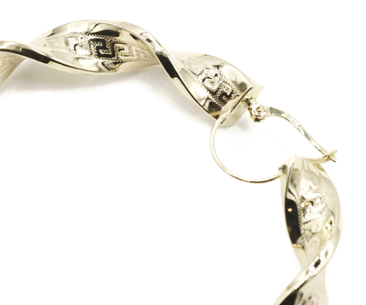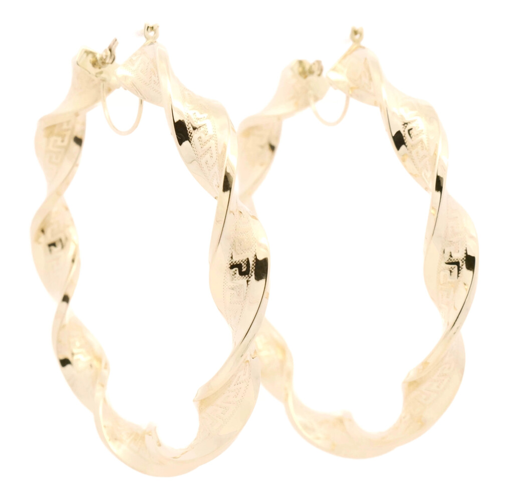 Large 2.5" Twisted 14KT Yellow Gold Round Hoop Earrings with Greek Key Detailing